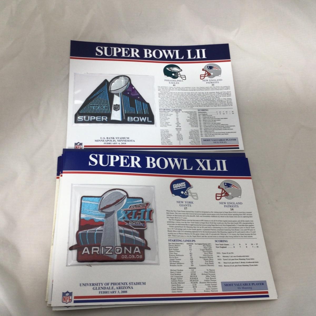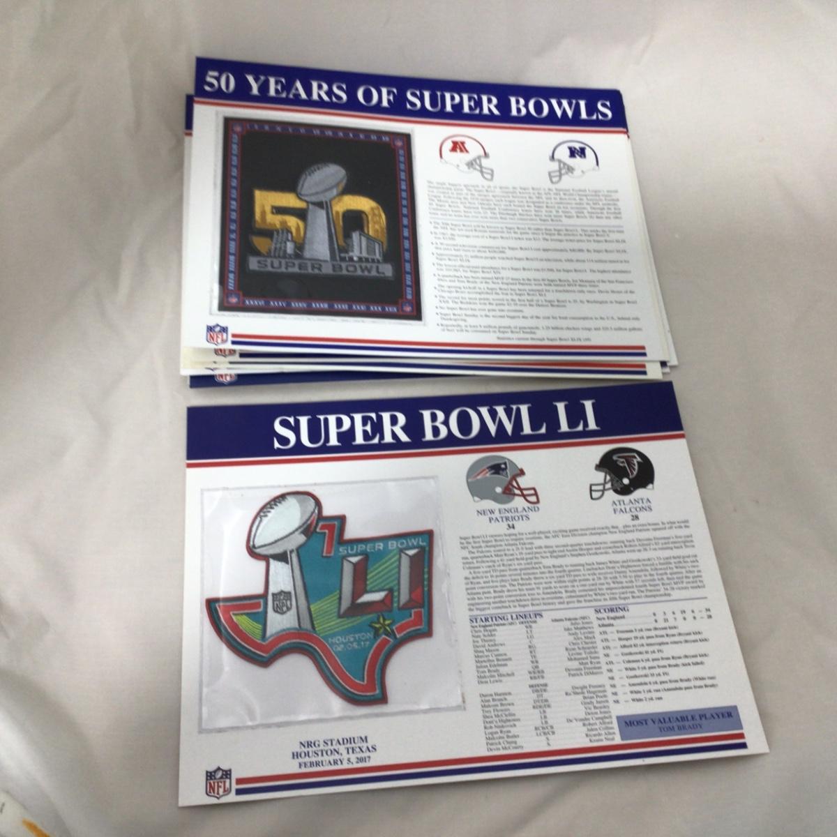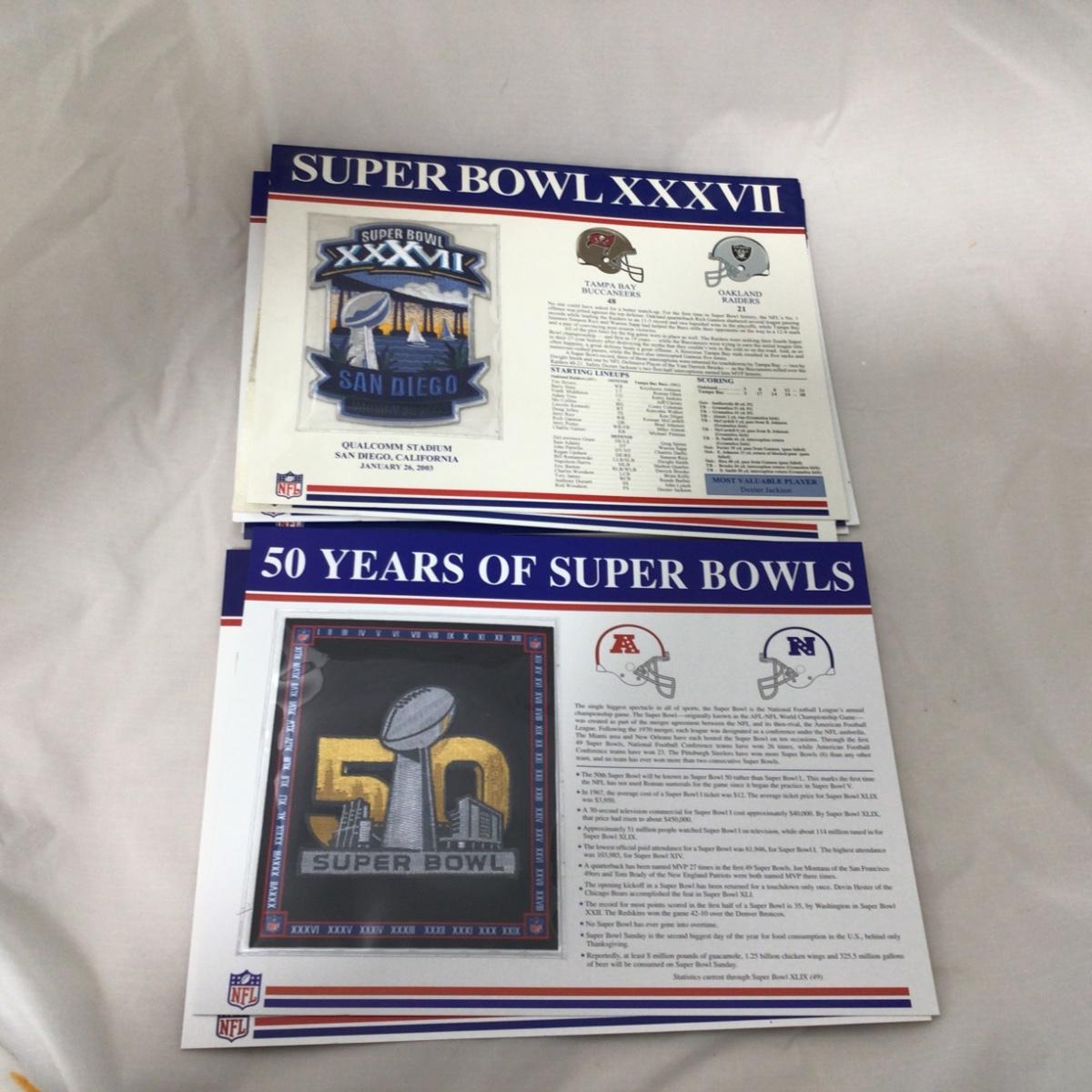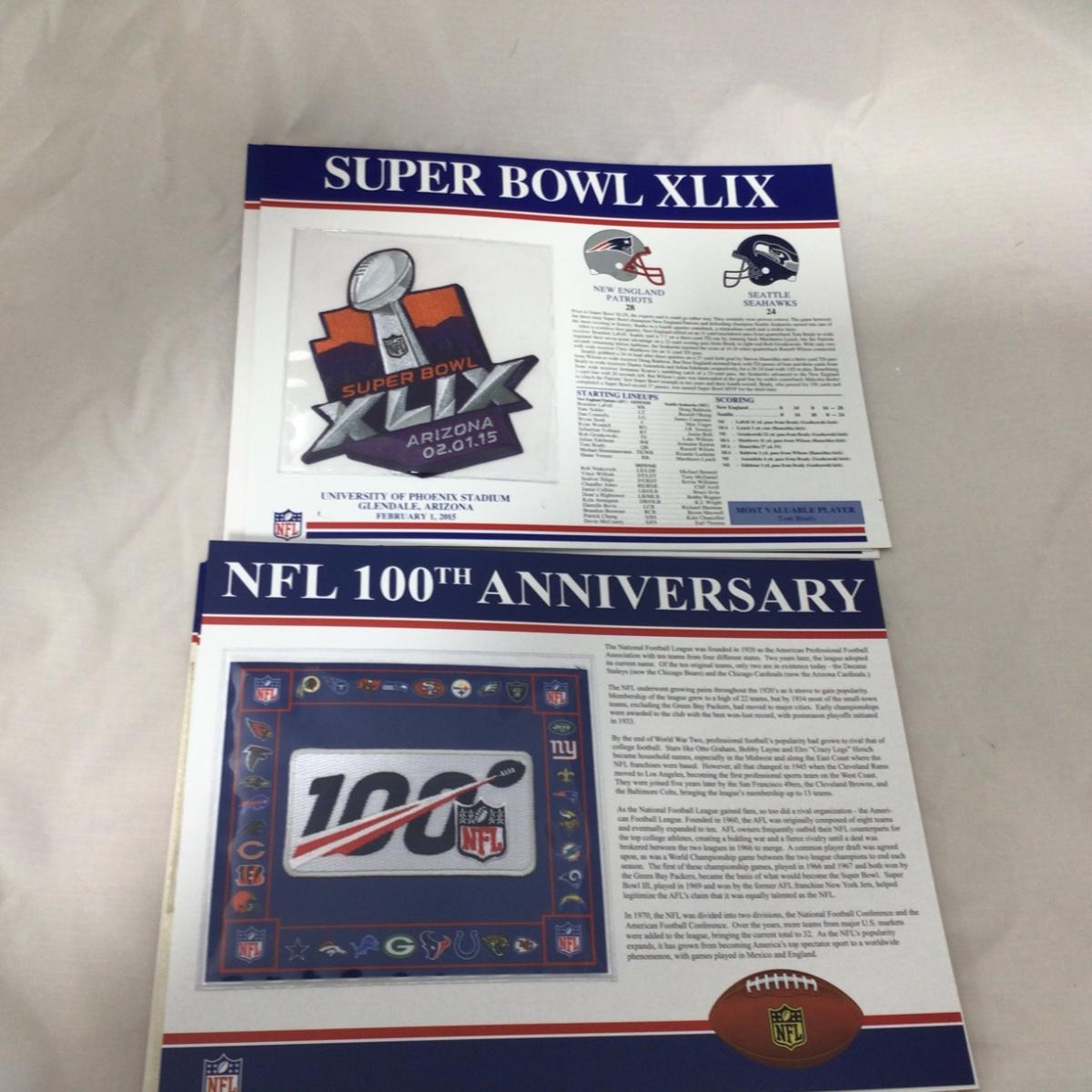 NFL Official Super Bowl patch collection. Please see photos for details and condition. ::: Shipping is available on this lot. If you require shipping you must let us know at the close of the auction. We will coordinate with you after the item has been won. Shipping fees will include insurance up to or exceeding the value of all items being mailed. If you have any questions regarding this lot please contact the auctioneer either via this website, by direct email or by phone. PICK UP TIMES and other important information can be found in the TERMS and DESCRIPTION of the auction. Please take a look for pertinent information. Thanks!