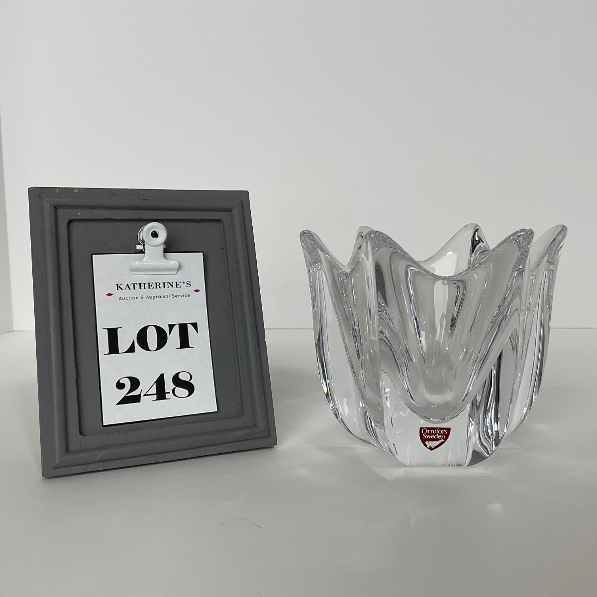 One Orrefors signed and sticker small crystal vase. This piece has no damage, and appears to be in great shape with no visable chips, cracks, or broken pieces. 4 1/2 inches wide by 4 inches tall. Please see photos for details and condition. Any condition statement is given as a courtesy to a client, is an opinion, and should not be treated as a statement of fact. Reference to condition written, oral or within a condition report shall not be regarded as a full account of condition and may not include all defects, alterations, or restorations. Absence of a condition report does not imply a lot is flawless or lacking imperfections or damage. Katherine’s Auction & Appraisal Service shall have no responsibility for any error or omission. Returns shall not be accepted on the basis of condition. ::: Shipping is available on this lot. If you require shipping you must let us know at the close of the auction. We will coordinate with you after the item has been won. Shipping fees will include insurance up to or exceeding the value of all items being mailed. If you have any questions regarding this lot please contact the auctioneer either via this website, by direct email or by phone. PICK UP TIMES and other important information can be found in the TERMS and DESCRIPTION of the auction. Please take a look for pertinent information. Thanks!