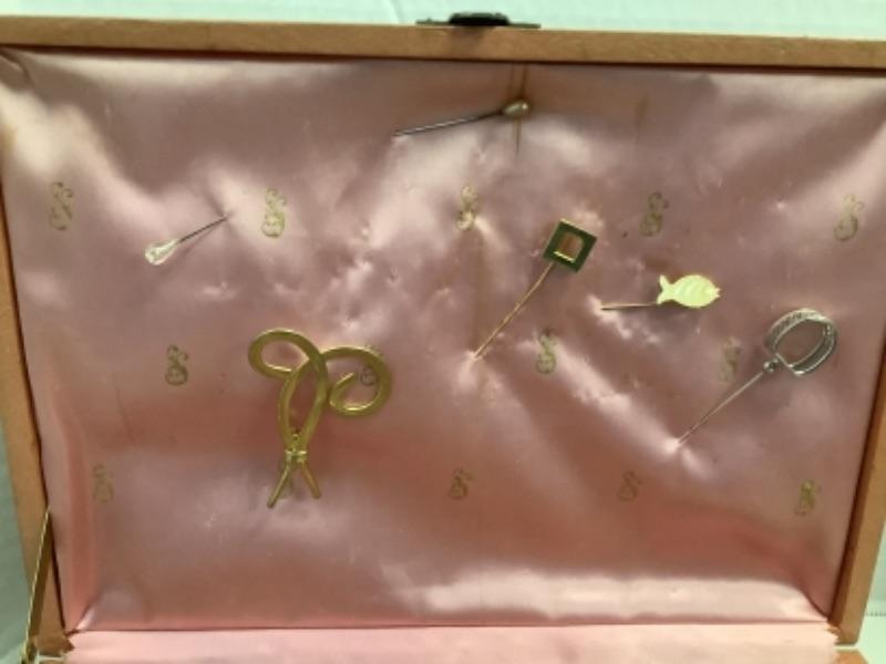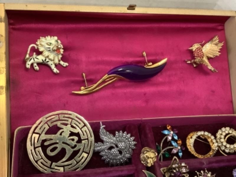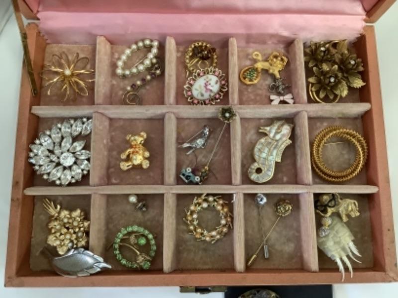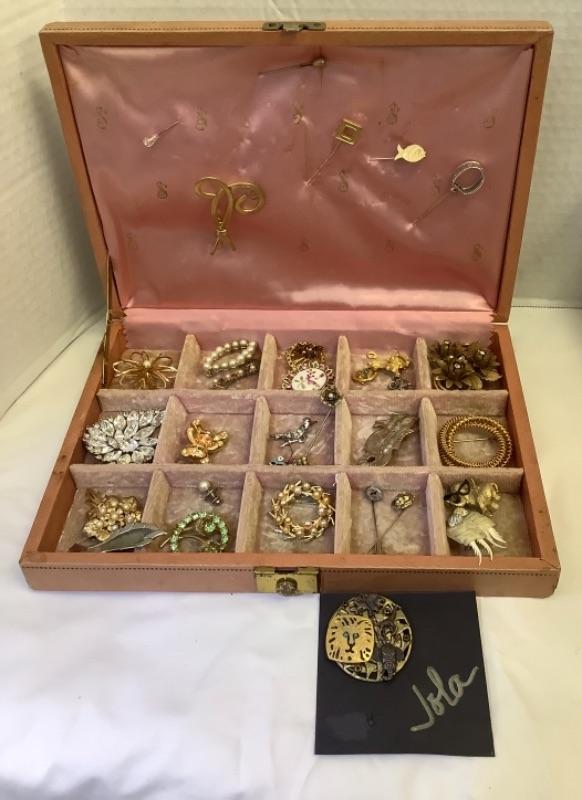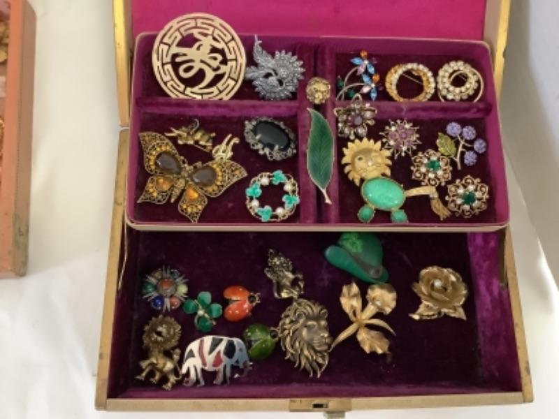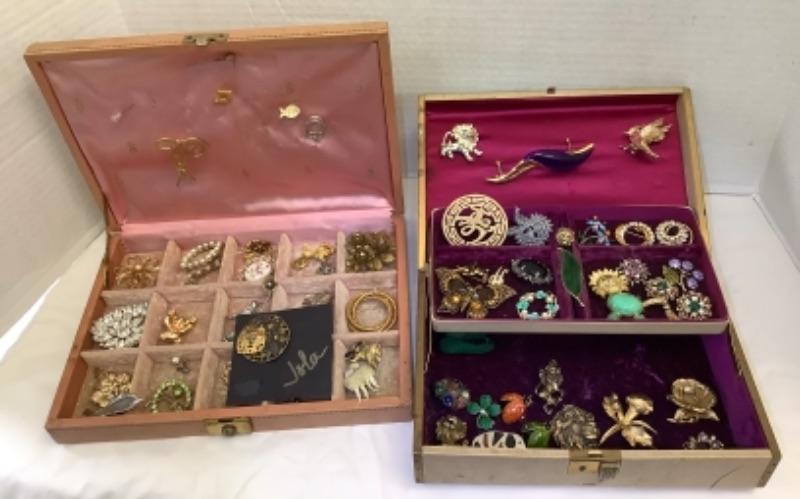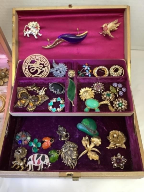 Large lot of costume jewelry pins/brooches and scarf clips. Jewelry boxes included