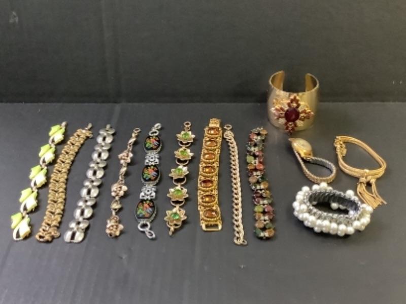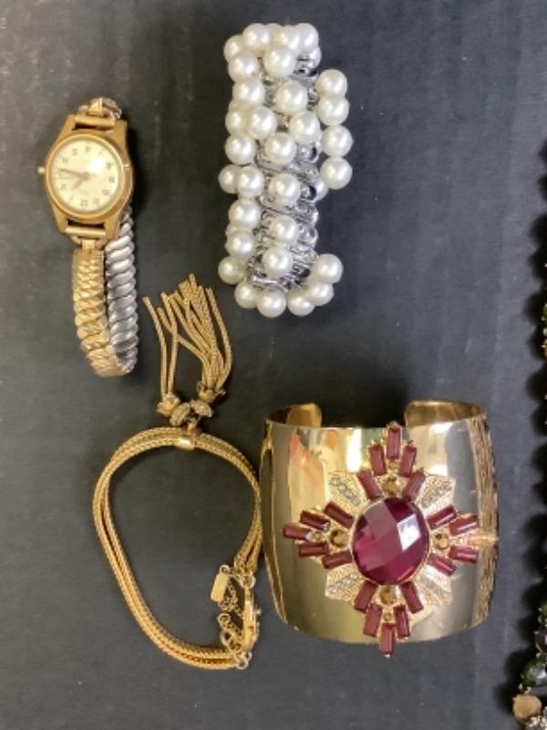 Lot of assorted costume jewelry bracelets and 1 Telix ladies watch with elastic band