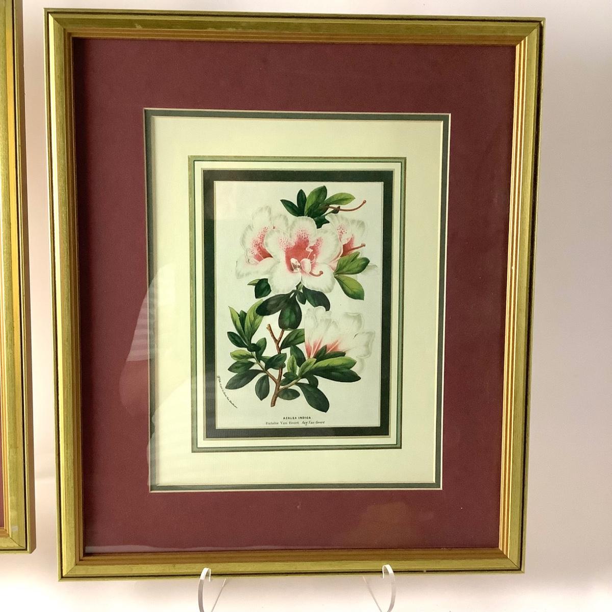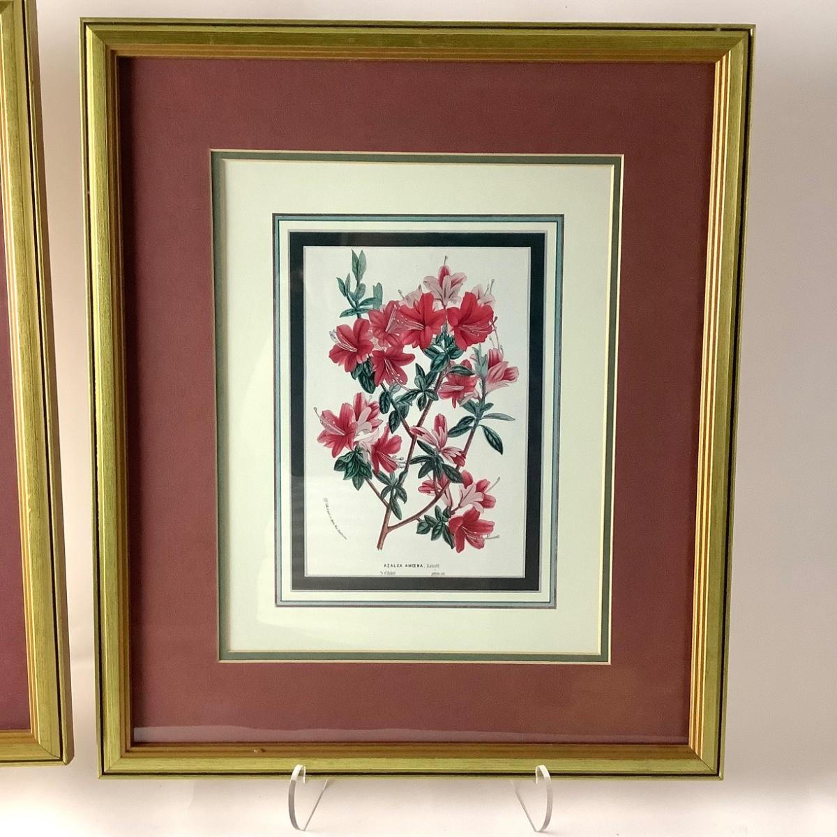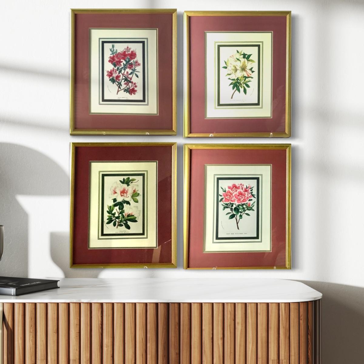 Set of four floral botanical prints in giltwood frames with maroon and cream double mats, 20.5"H, 17.5"W, .75"D.