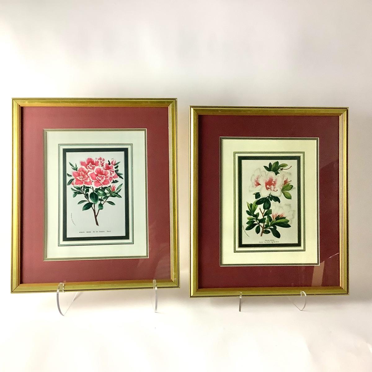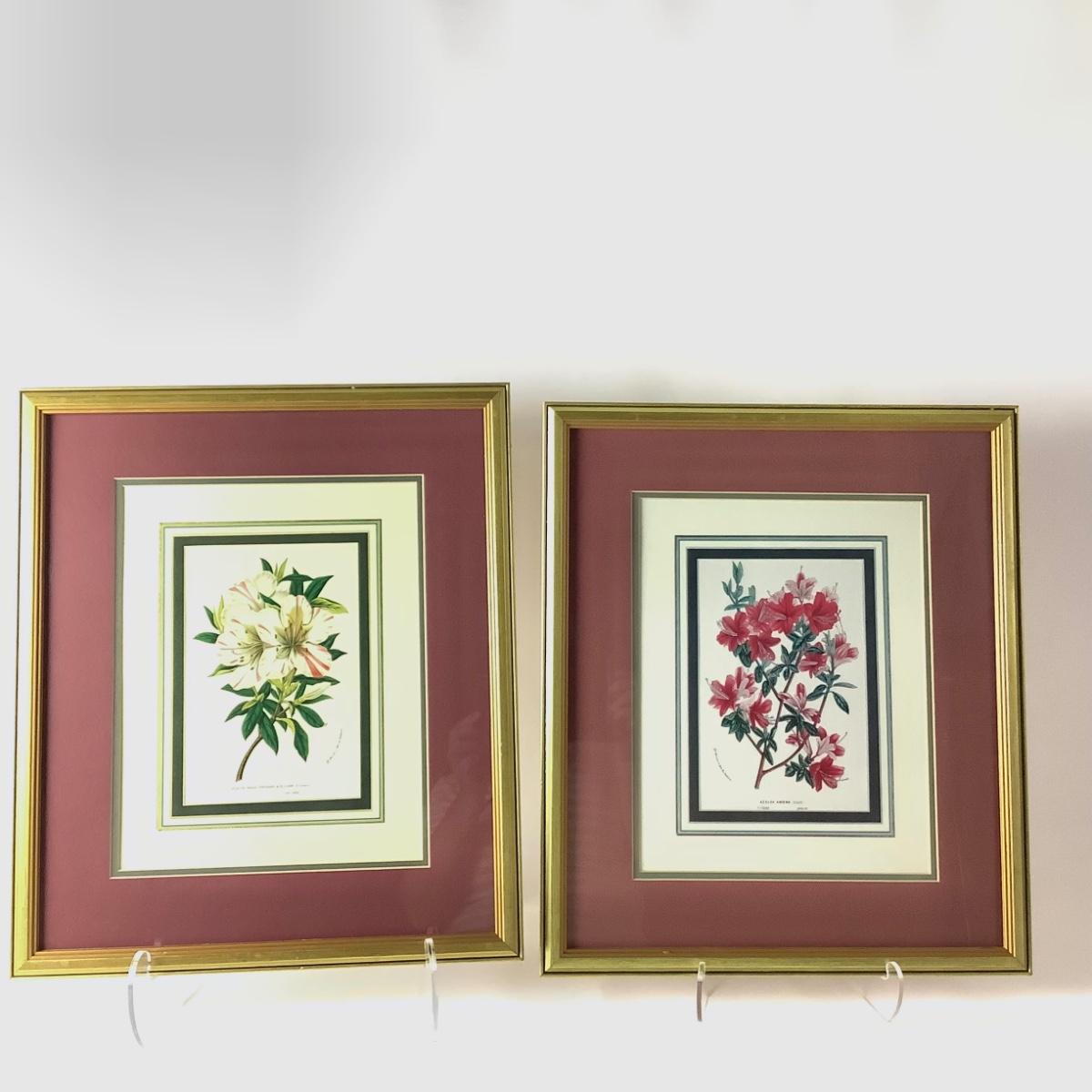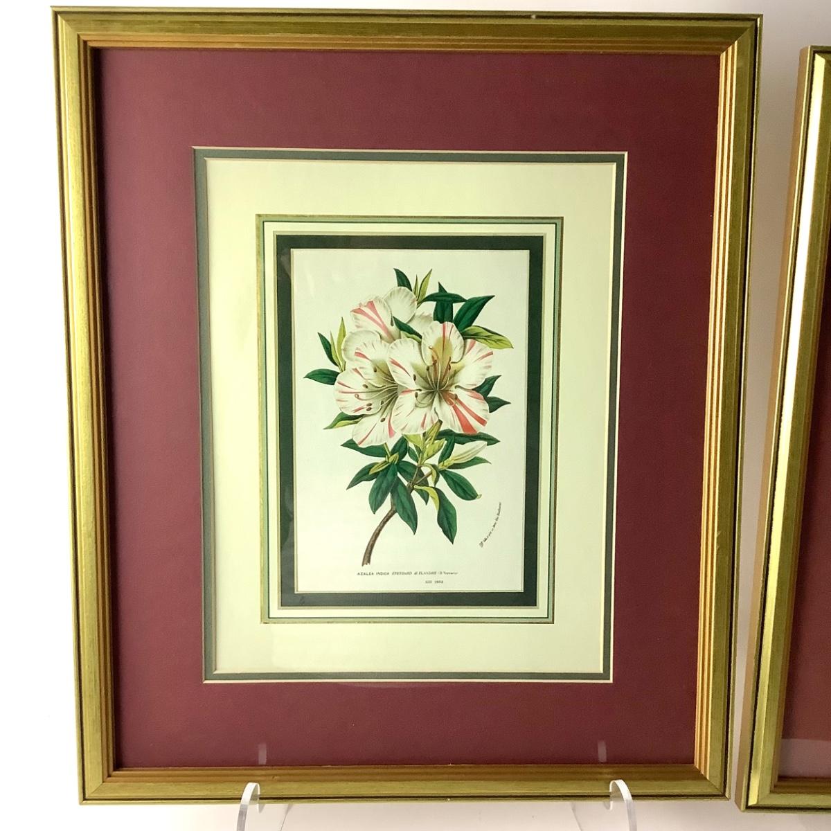 Set of four floral botanical prints in giltwood frames with maroon and cream double mats, 20.5"H, 17.5"W, .75"D.