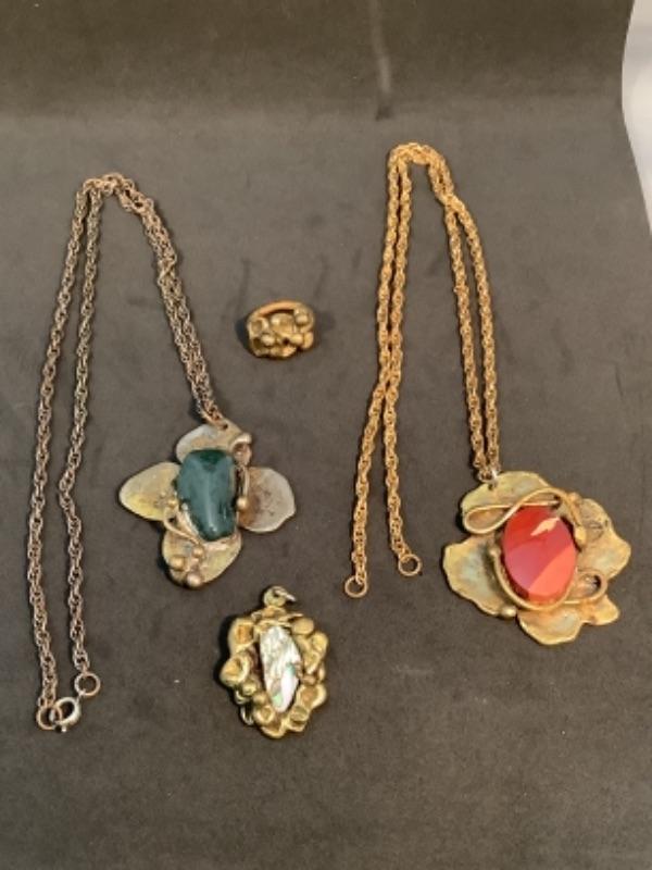 Mid century brutalist jewelry, ring, necklace, 1 necklace and pendant signed Randy G., necklace has a broken chain