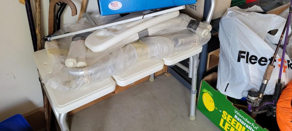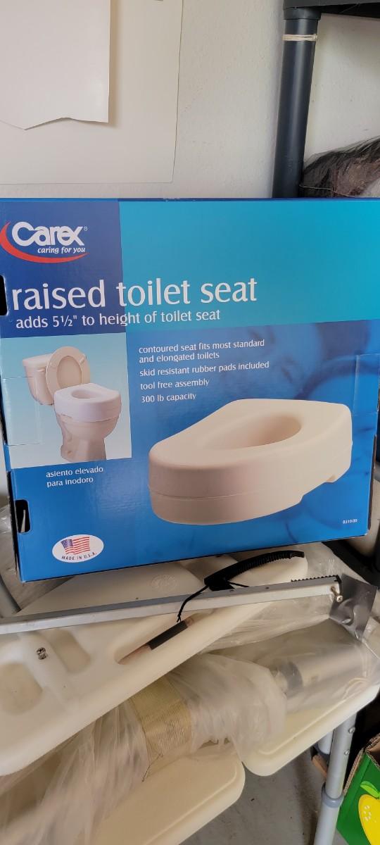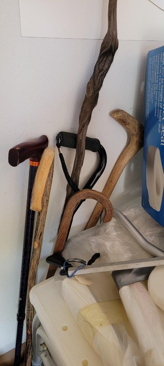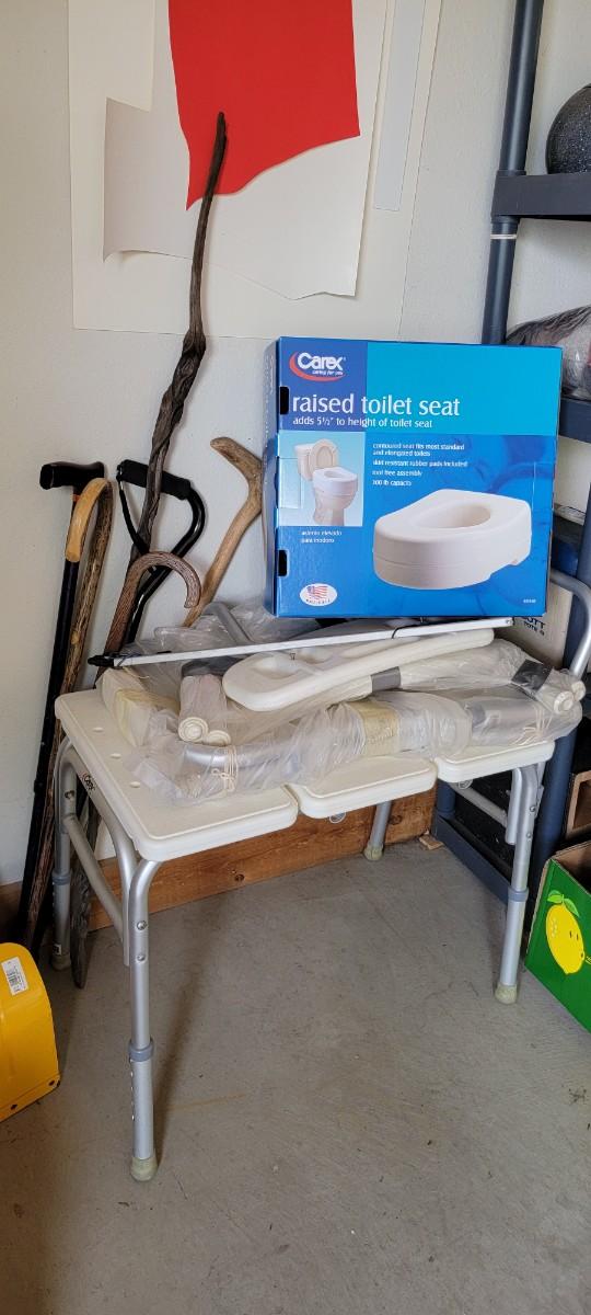 Various assistance devices including raised toilet seat cover and walking sticks.
