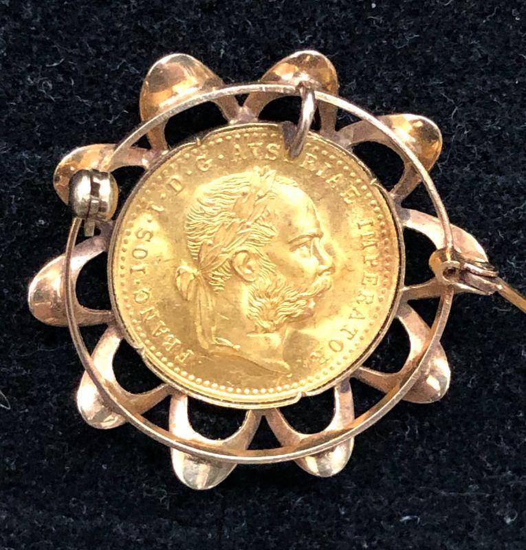24kt Gold Austrian Ducat Coin in 14kt mounted pin. I'm not a coin grader, but this appears to be in excellent condition to me. See photos.