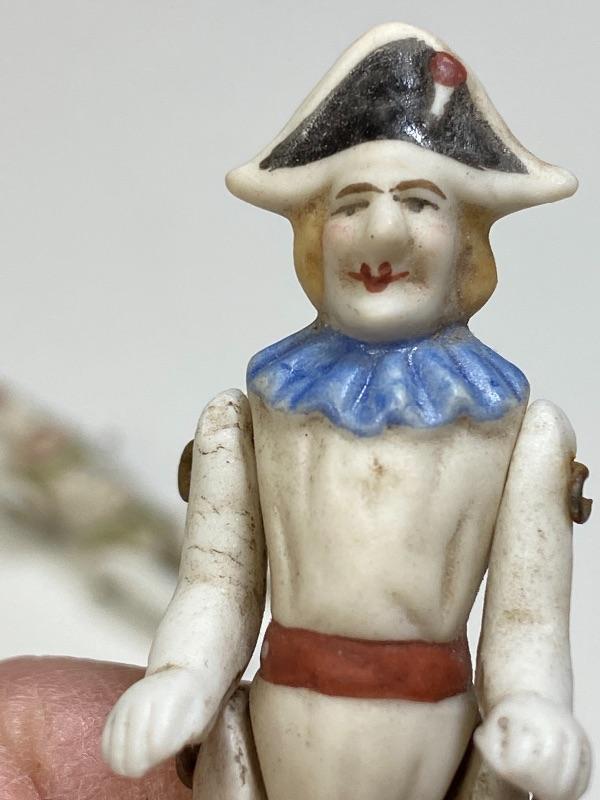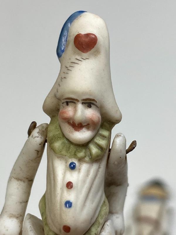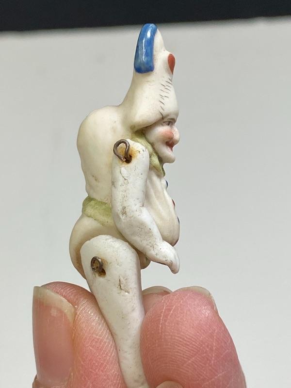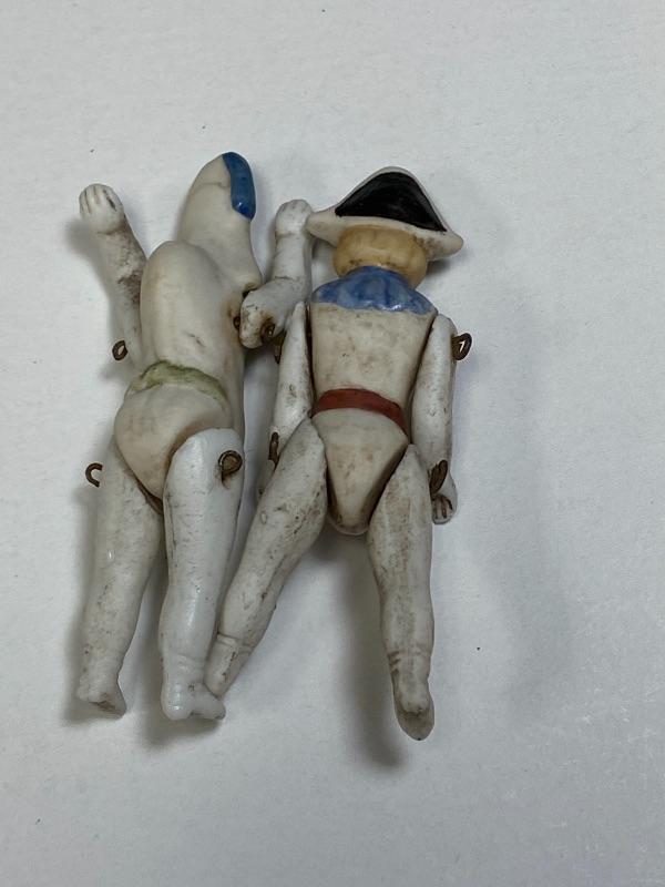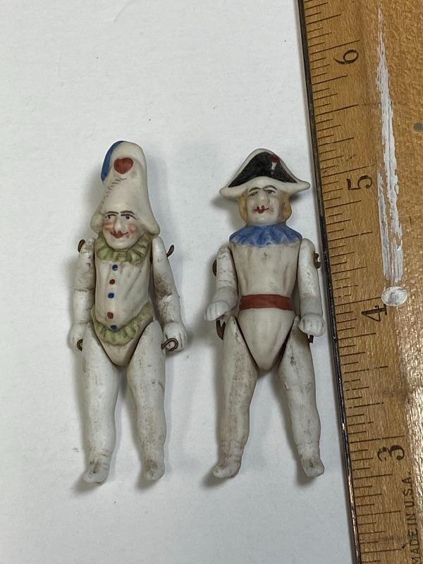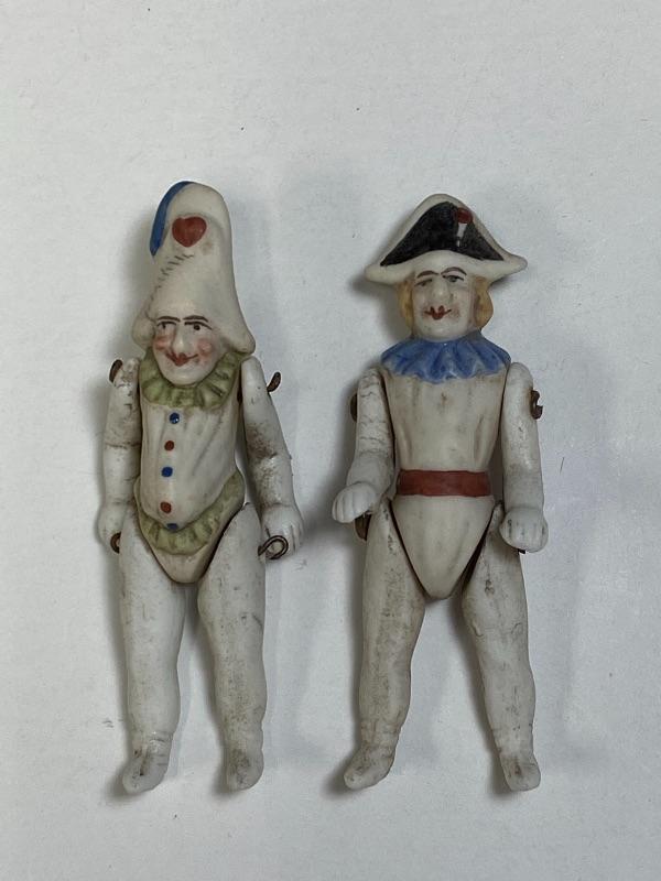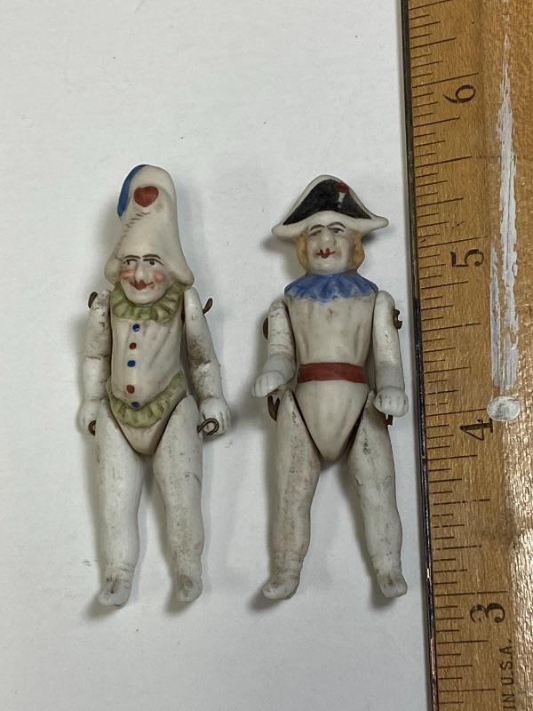 A pair of antique bisque jointed clown dollhouse dolls. About 2.5" size. One is wearing a Napoleon style hat. The other has a hunchback and gut. Good antique condition, no broken pieces. Signs of age, dirt and dust. Paint still looks pretty good. No marks.
