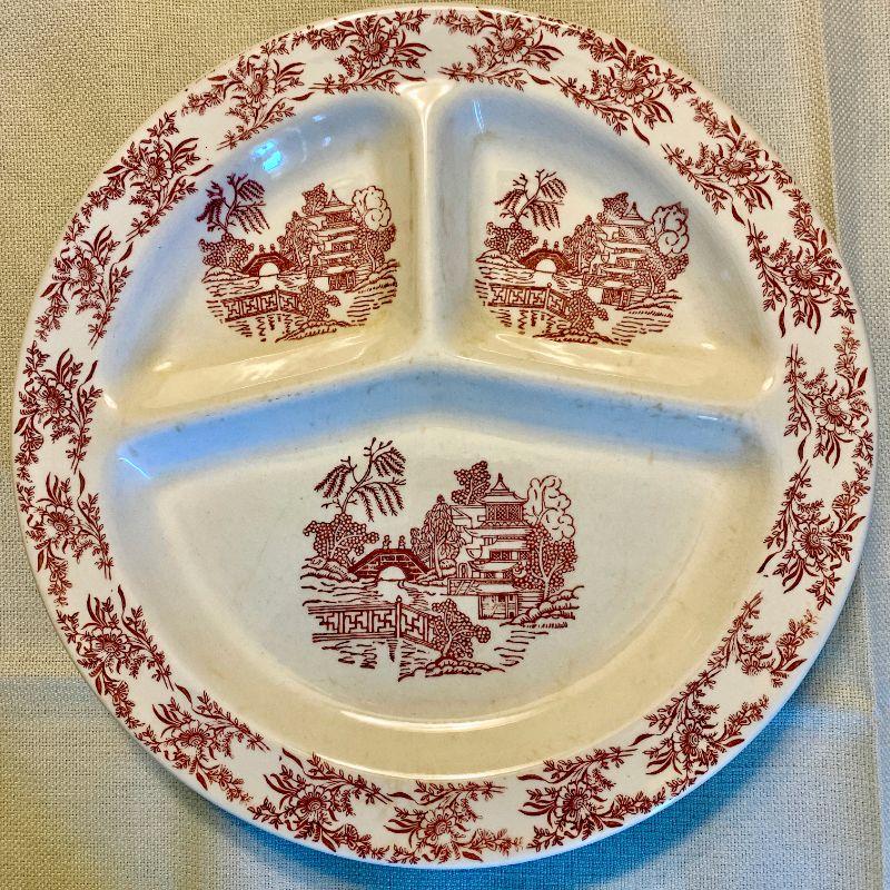 #24   ANTIQUE RED & WHITE DIVIDED DINNER PLATES TRANSFER WARE ASIAN THEME