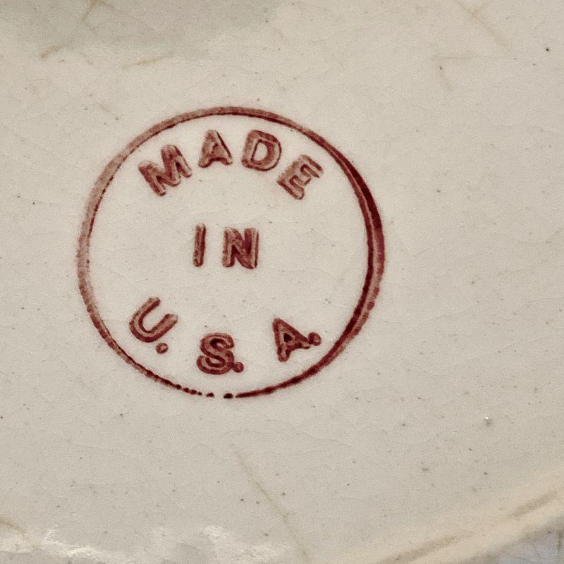 4 Antique divided dinner plates, red & white Asian pattern. Made in USA. Thick stoneware.