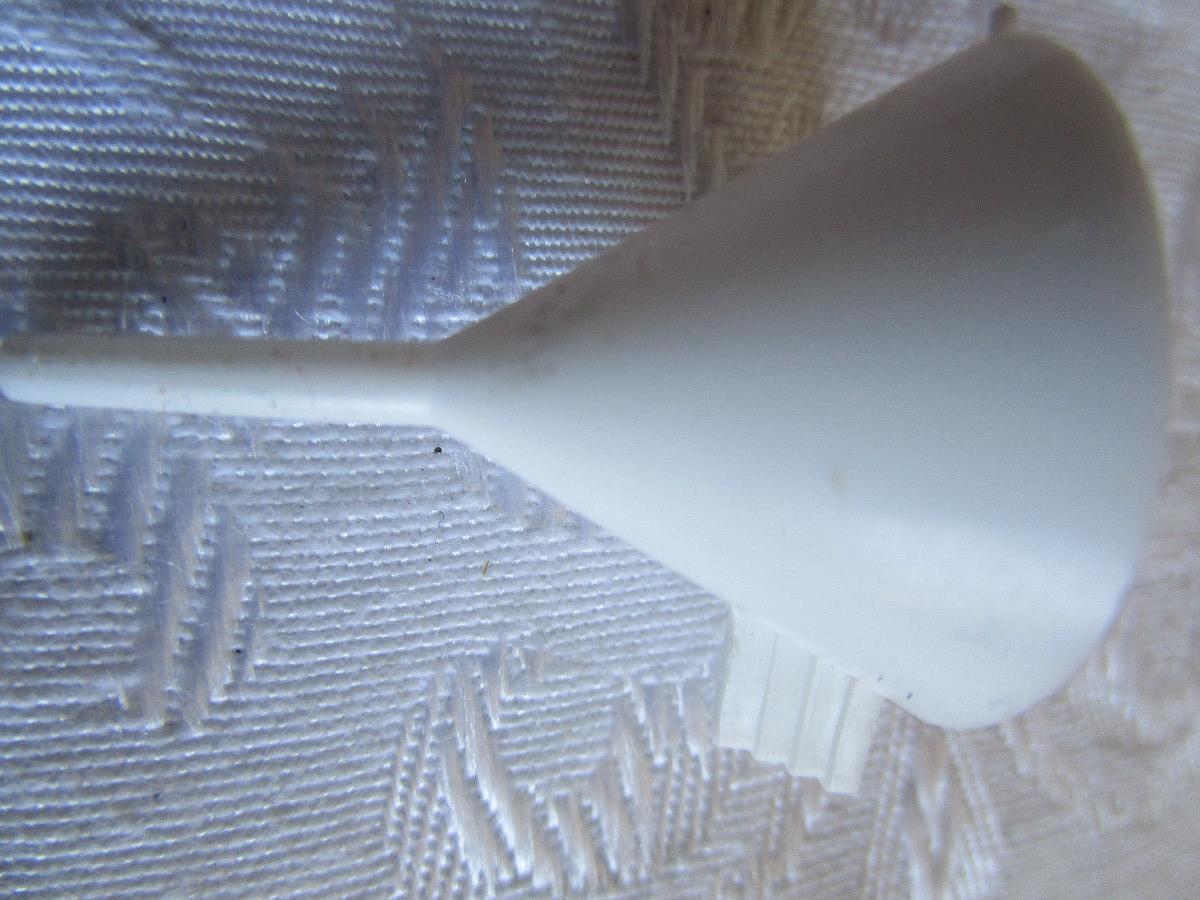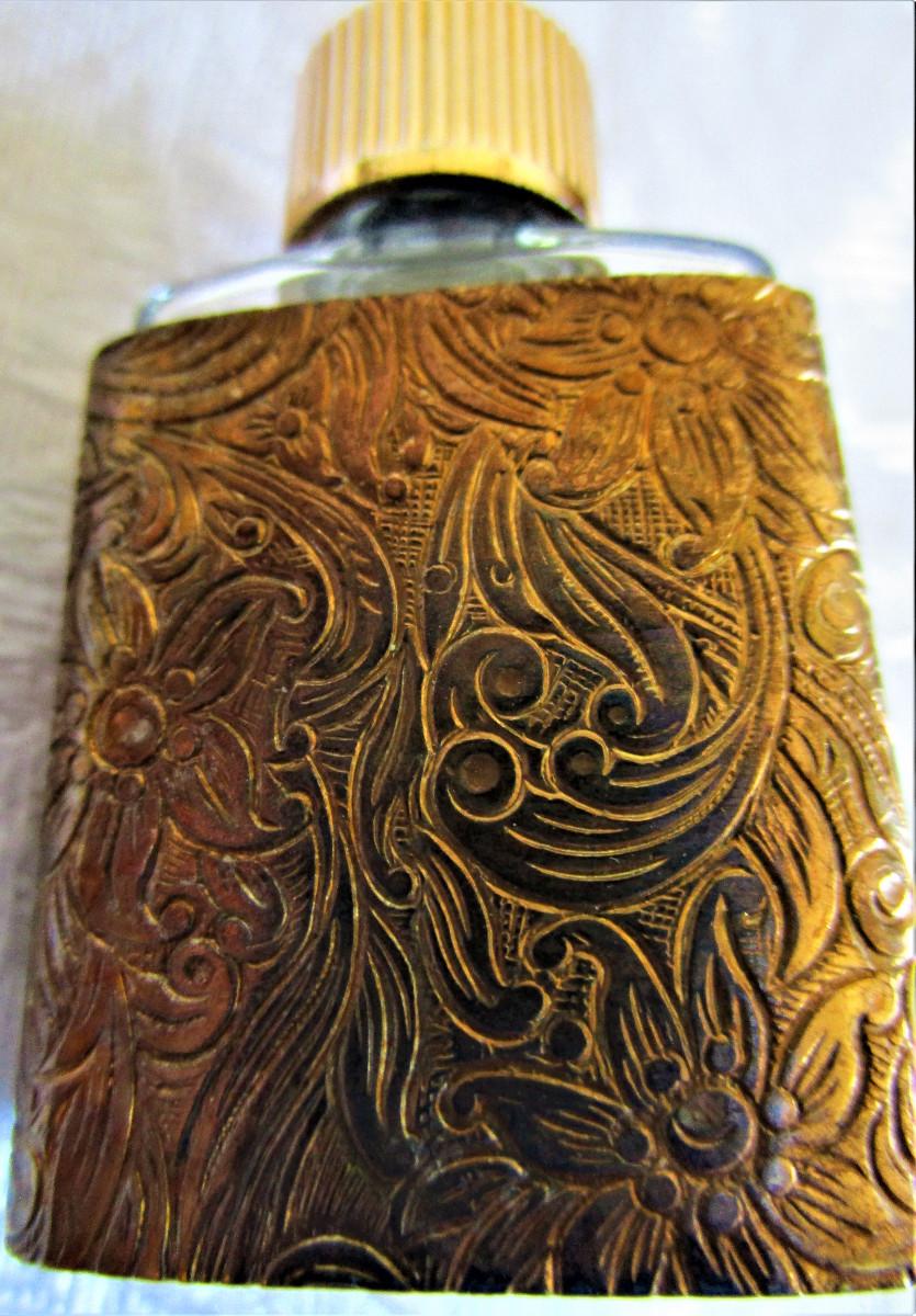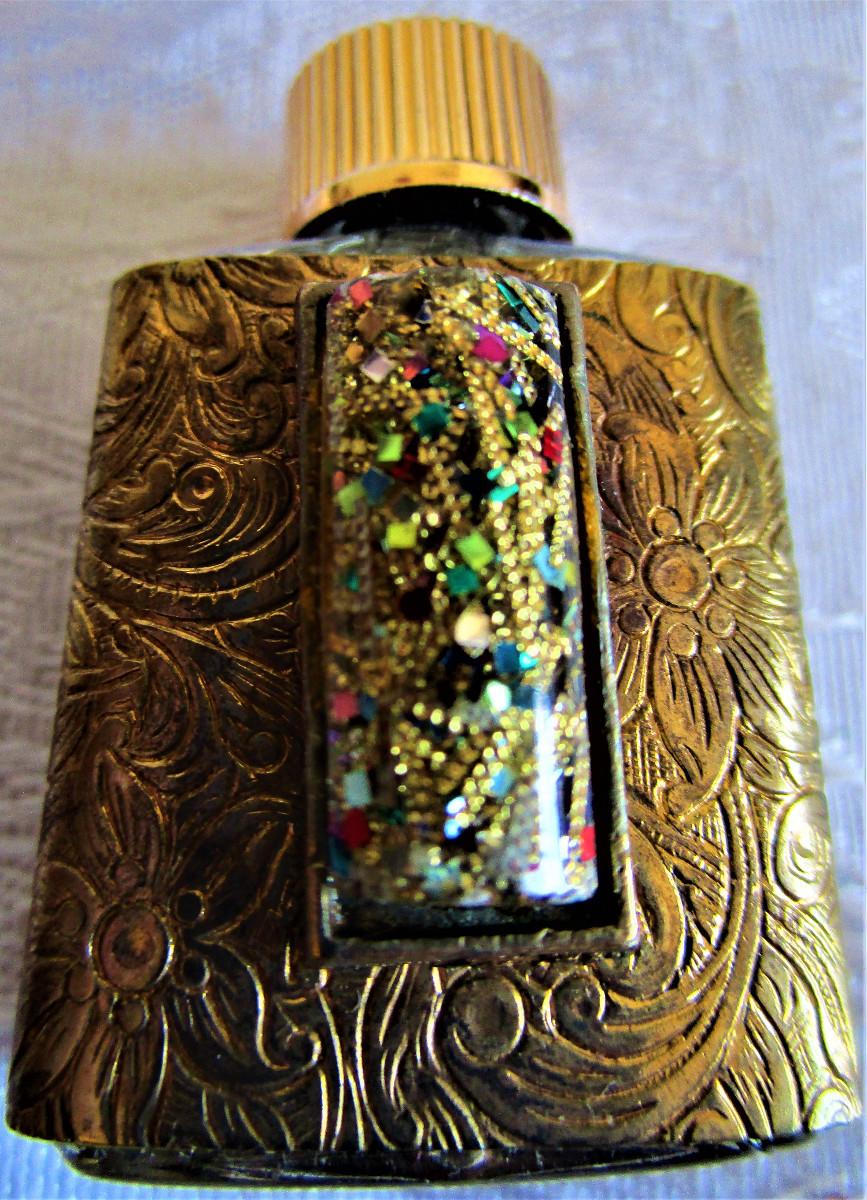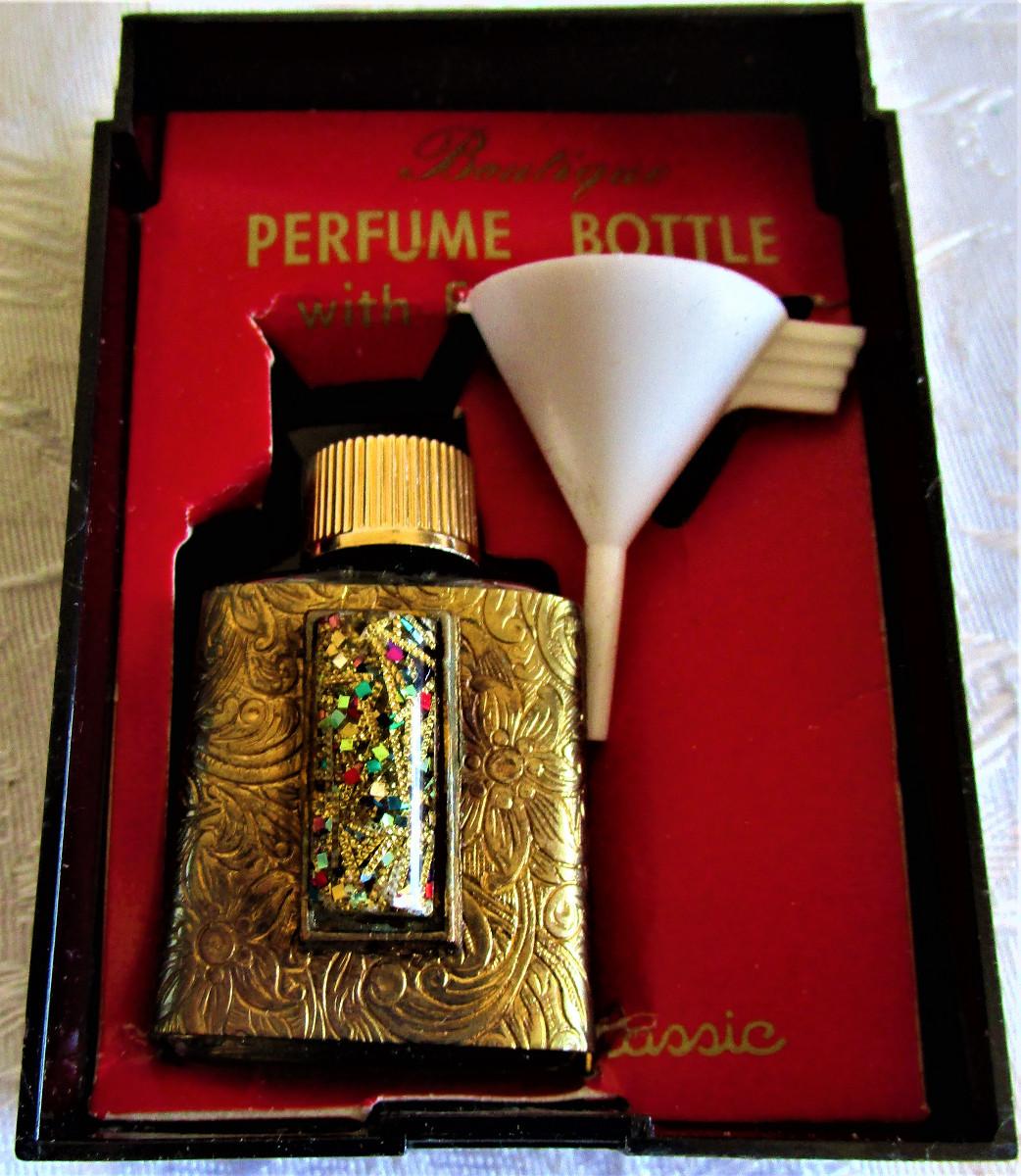 Perfume bottle with decoration and metal around the bottle, with funnel to fill the bottle