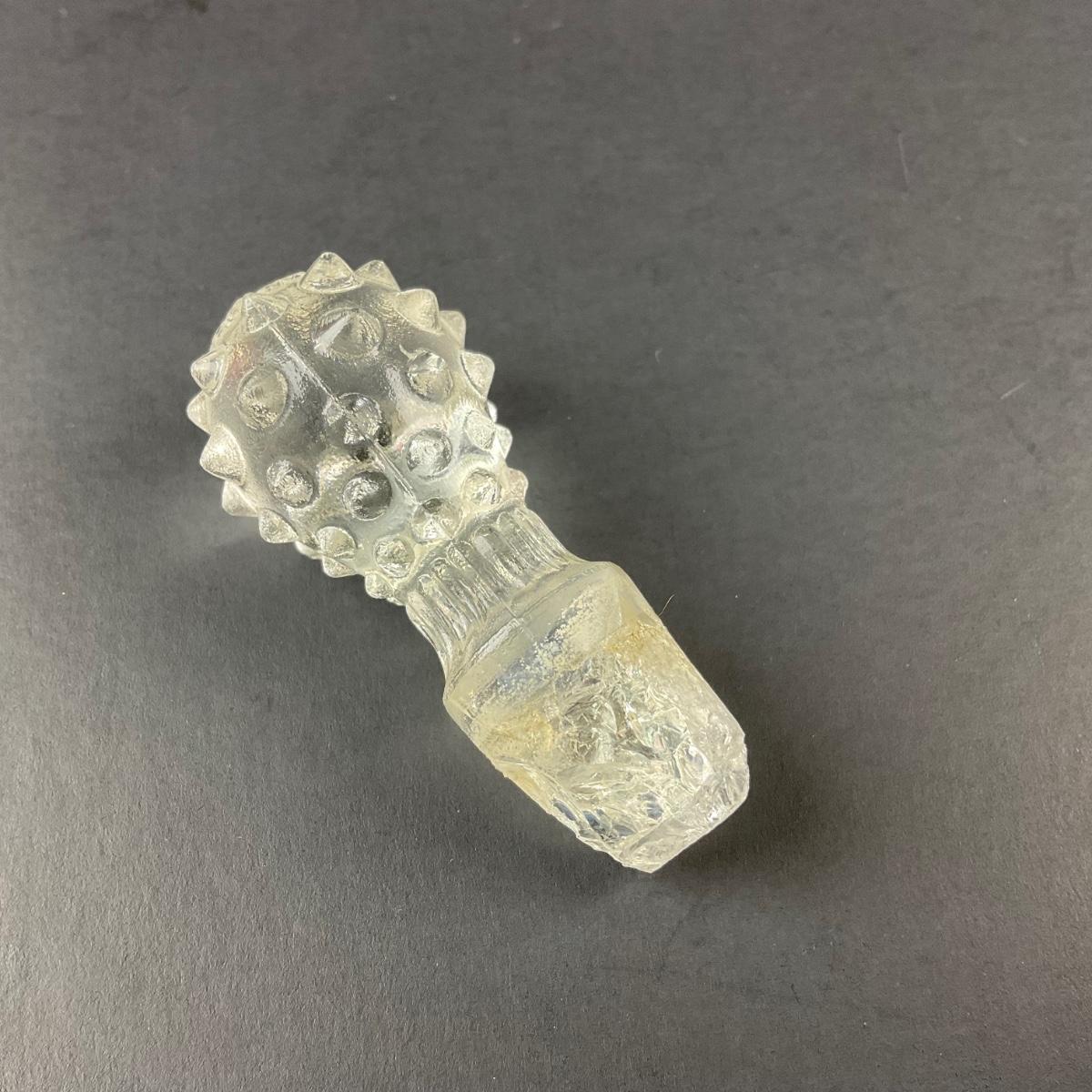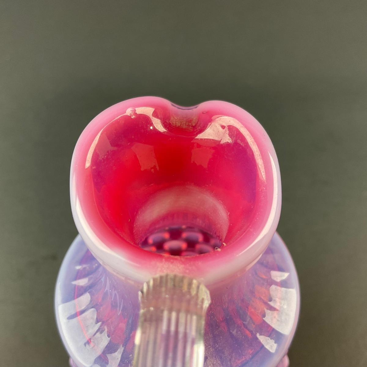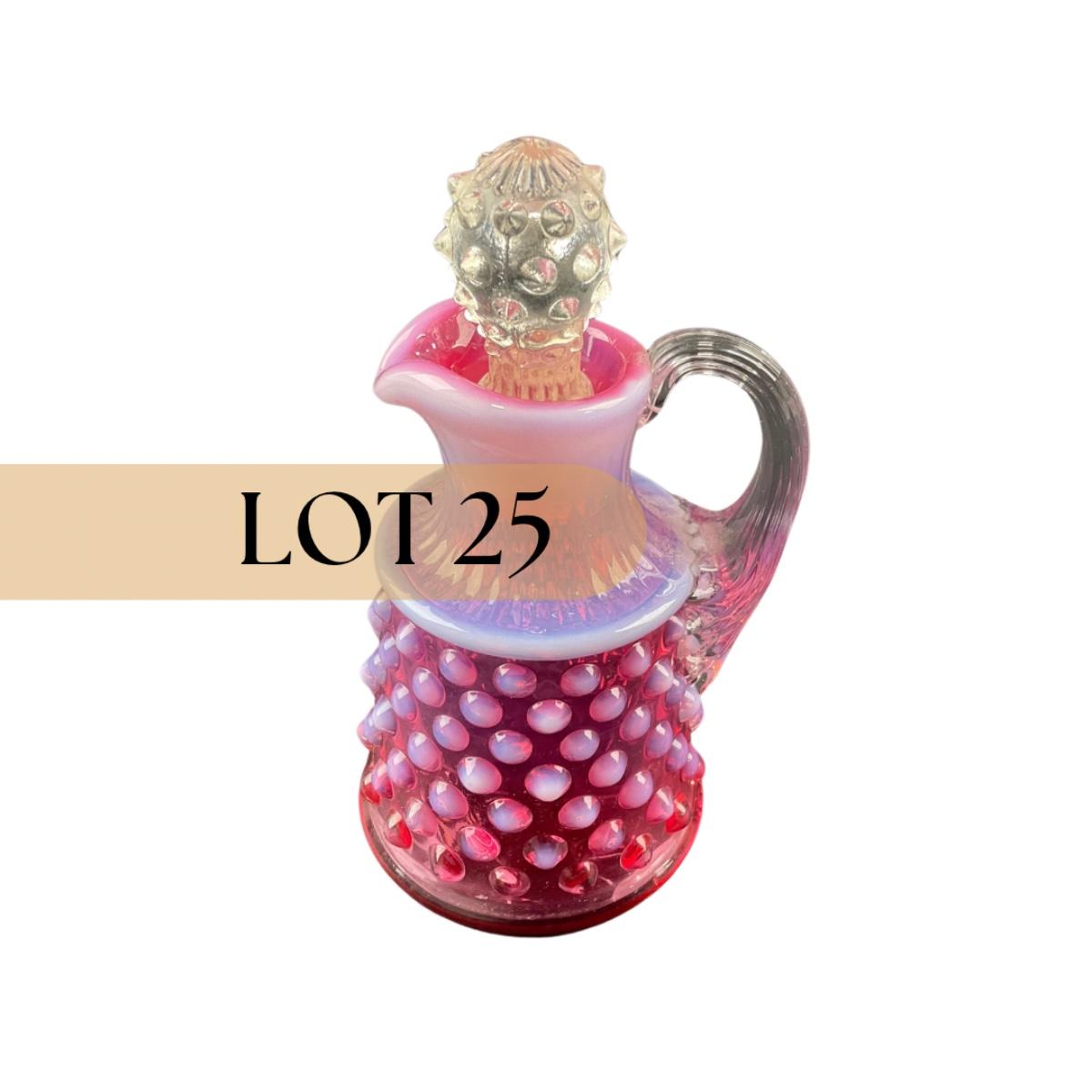 One unmarked Fenton cranberry opalescent hobnail cruet. This piece does come with a stopper however the bottom base of the stopper appears to have a good amount of damage and broken pieces. Please see photos for details and condition. Any condition statement is given as a courtesy to a client, is an opinion, and should not be treated as a statement of fact. Reference to condition written, oral or within a condition report shall not be regarded as a full account of condition and may not include all defects, alterations, or restorations. Absence of a condition report does not imply a lot is flawless or lacking imperfections or damage. Katherine’s Auction & Appraisal Service shall have no responsibility for any error or omission. Returns shall not be accepted on the basis of condition. ::: Shipping is available on this lot. If you require shipping you must let us know at the close of the auction. We will coordinate with you after the item has been won. Shipping fees will include insurance up to or exceeding the value of all items being mailed. If you have any questions regarding this lot please contact the auctioneer either via this website, by direct email or by phone. PICK UP TIMES and other important information can be found in the TERMS and DESCRIPTION of the auction. Please take a look for pertinent information. Thanks!