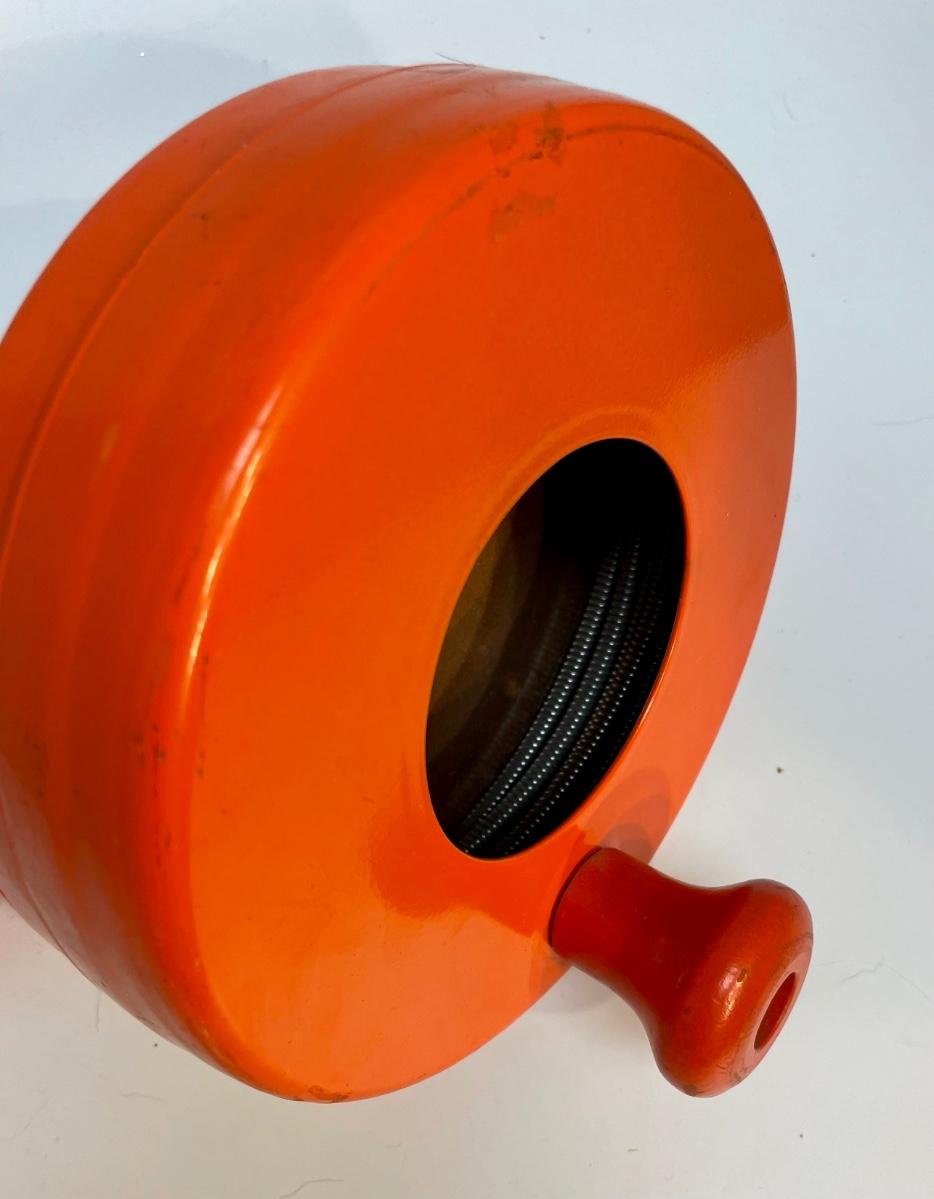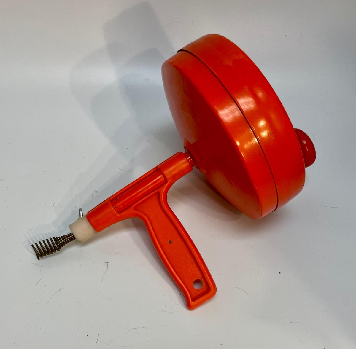 Hand-cranked 25 foot drain cleaning snake. Canister style with pistol grip. Excellent used condition.