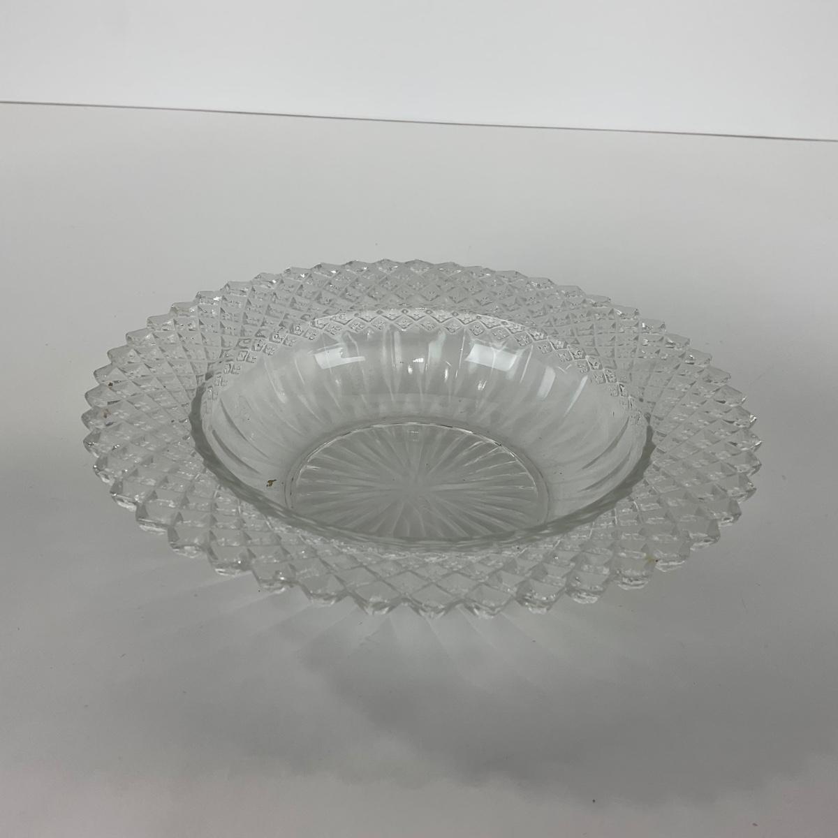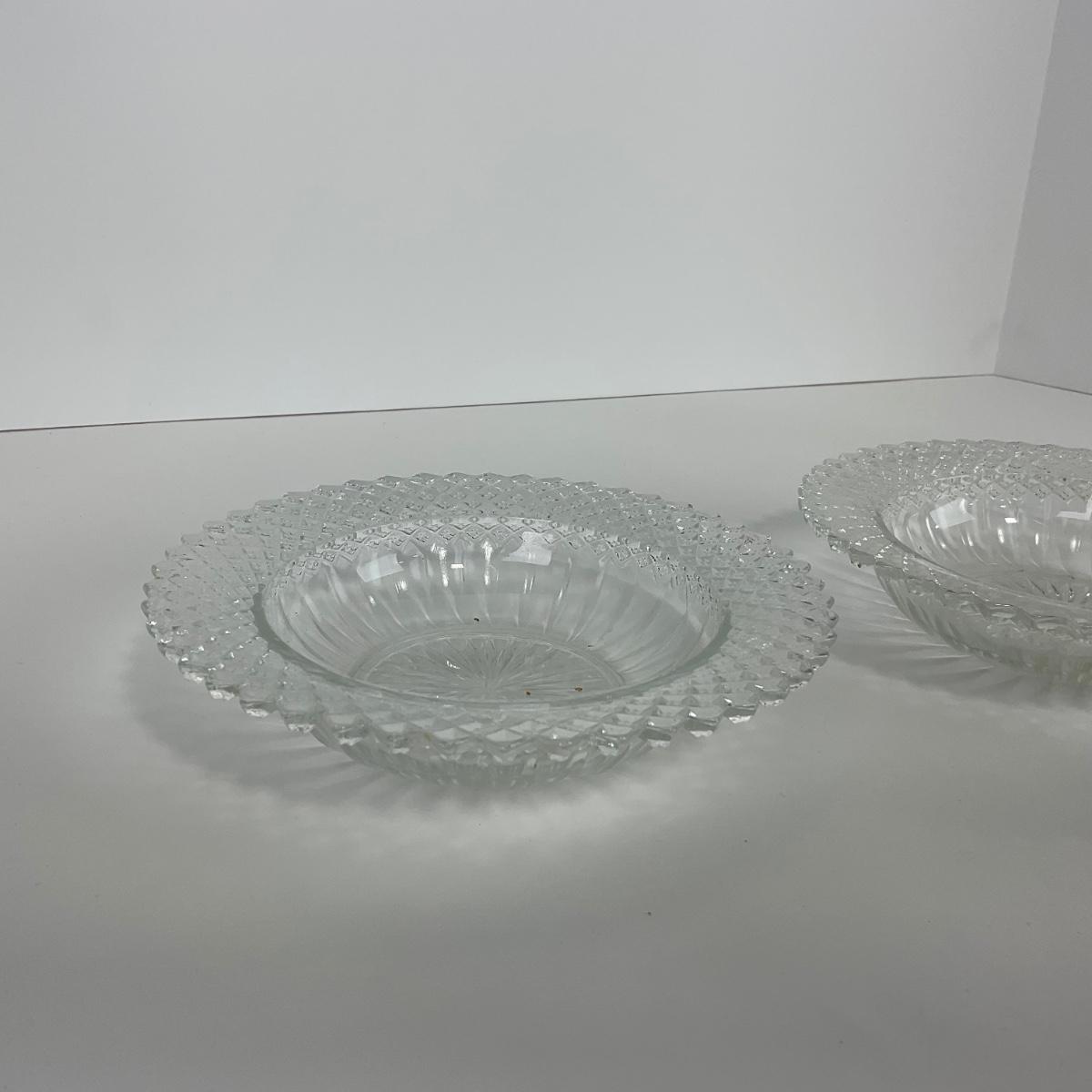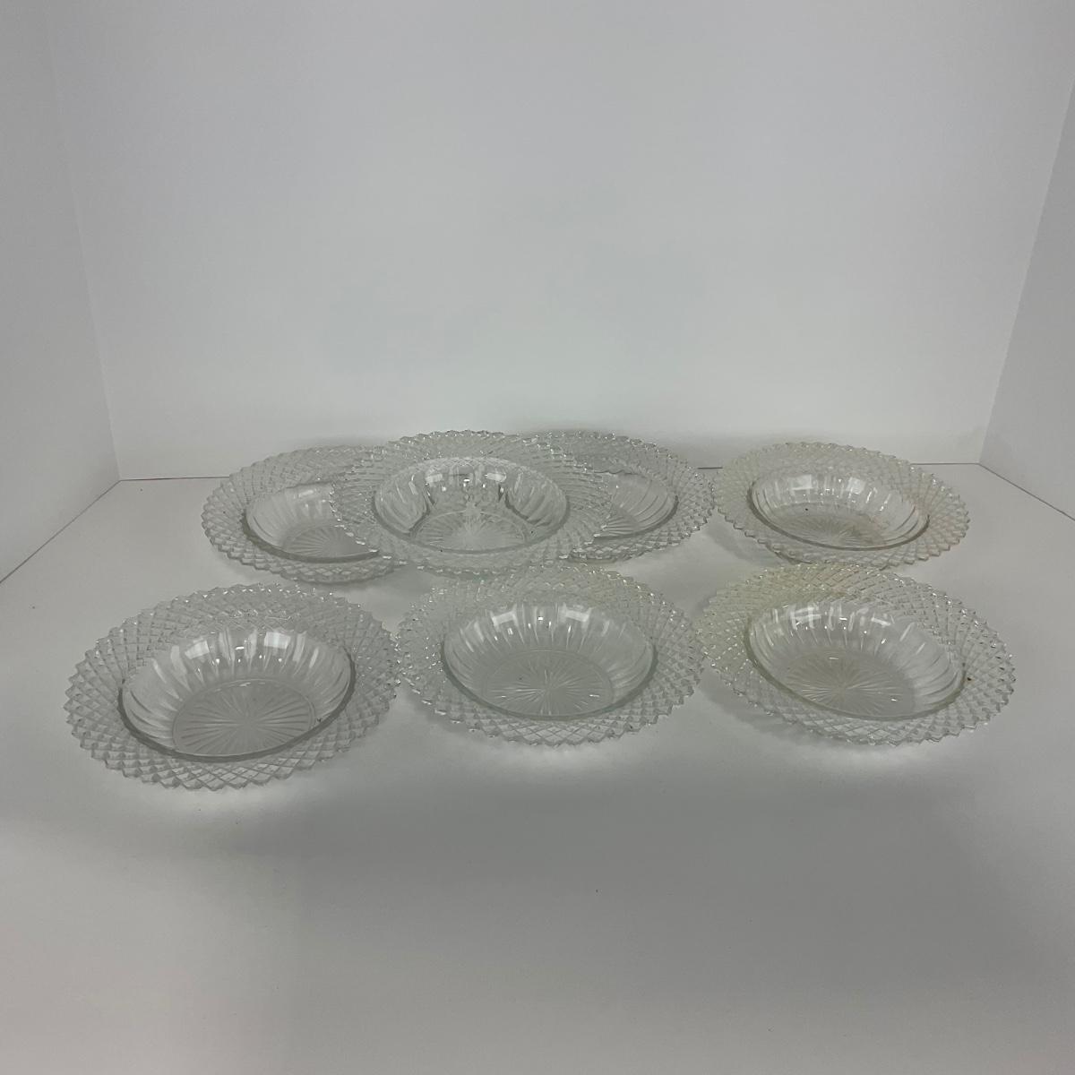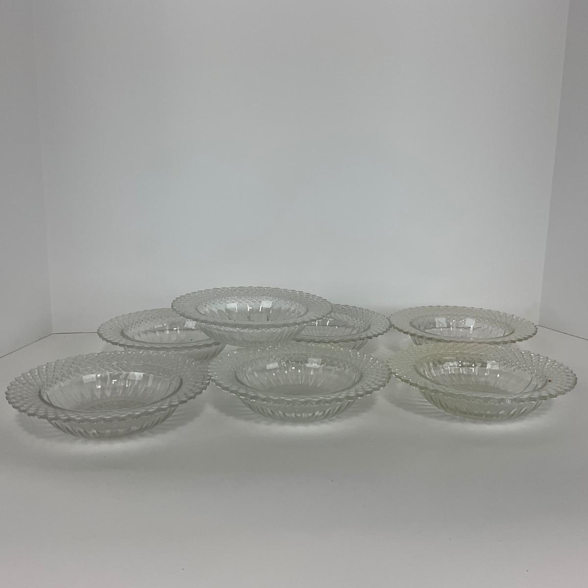 Seven piece Miss America Hocking Glass Co. (1933-1937) clear glass bowls. Please see photos for details and condition. ::: Shipping is available on this lot. If you require shipping you must let us know at the close of the auction. We will coordinate with you after the item has been won. Shipping fees will include insurance up to or exceeding the value of all items being mailed. If you have any questions regarding this lot please contact the auctioneer either via this website, by direct email or by phone. PICK UP TIMES and other important information can be found in the TERMS and DESCRIPTION of the auction. Please take a look for pertinent information. Thanks!