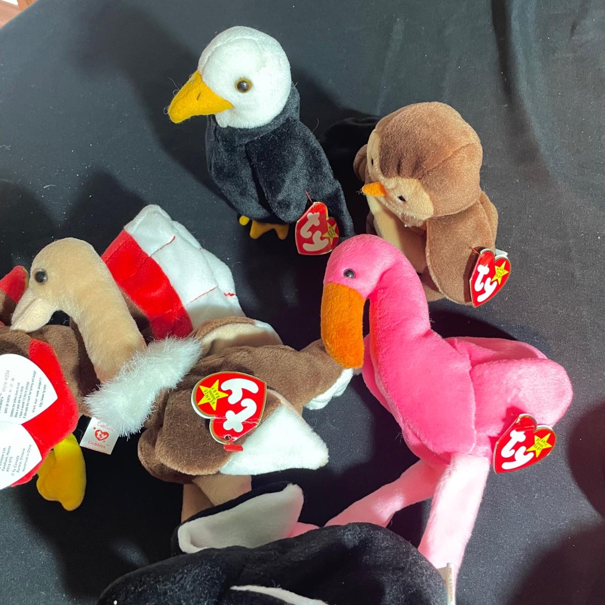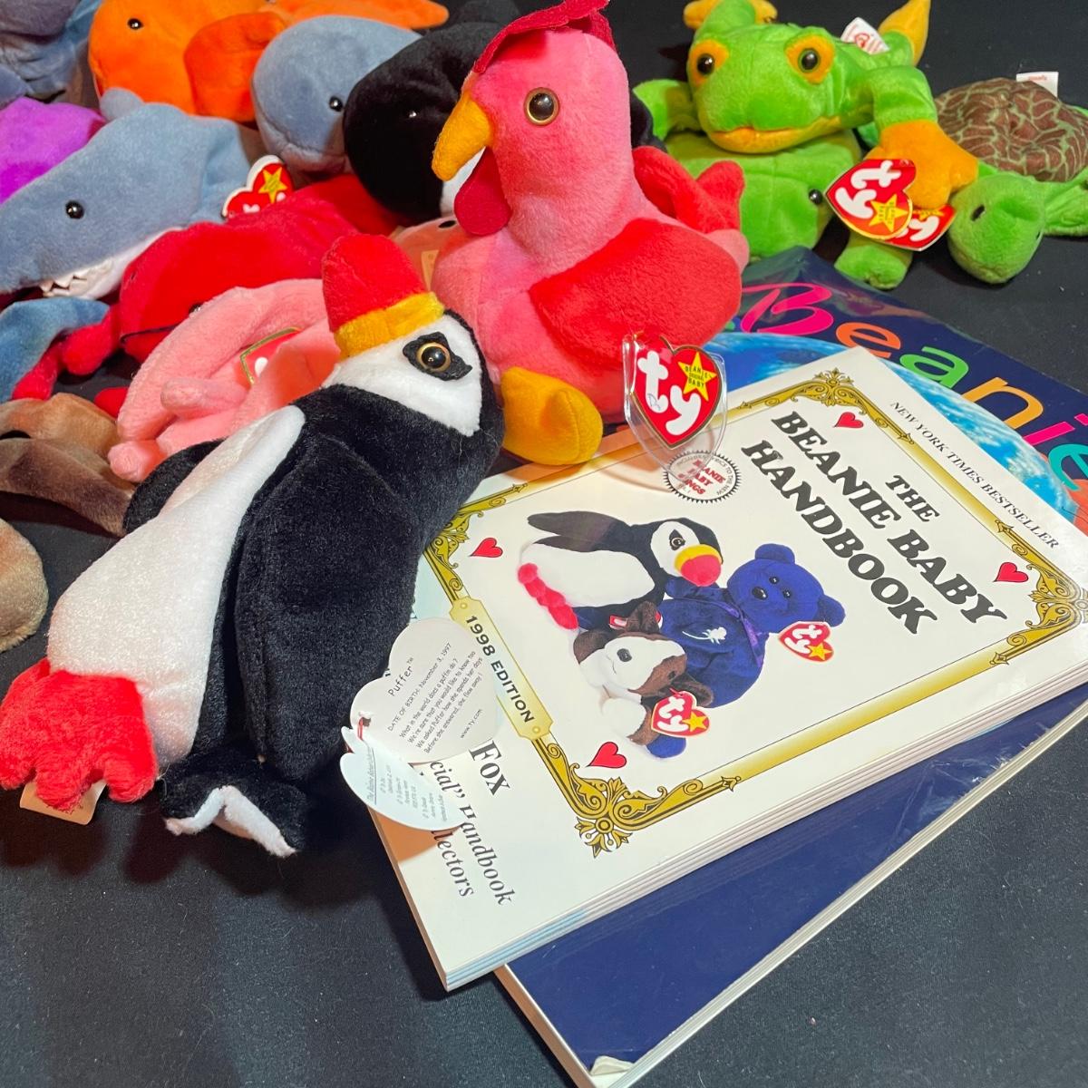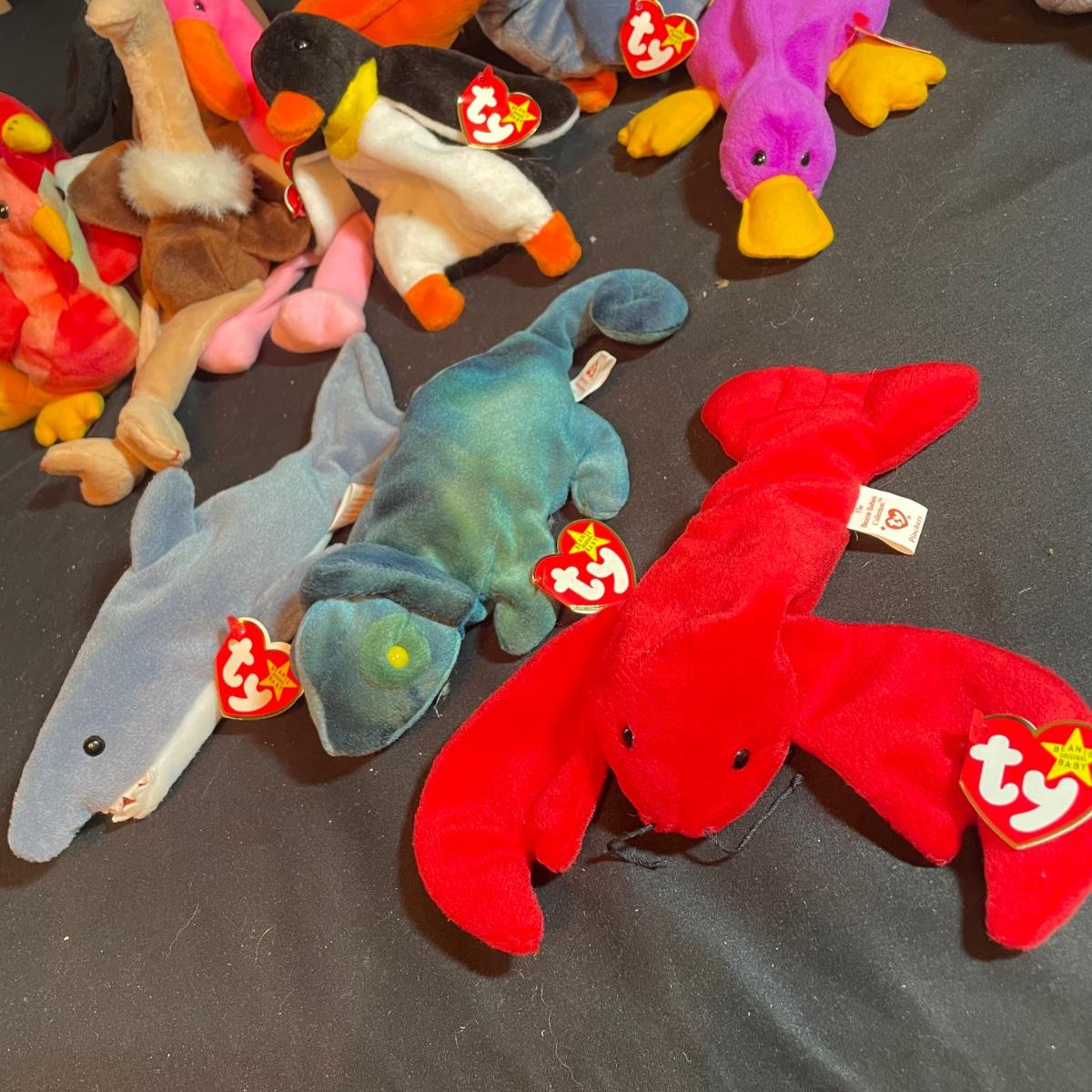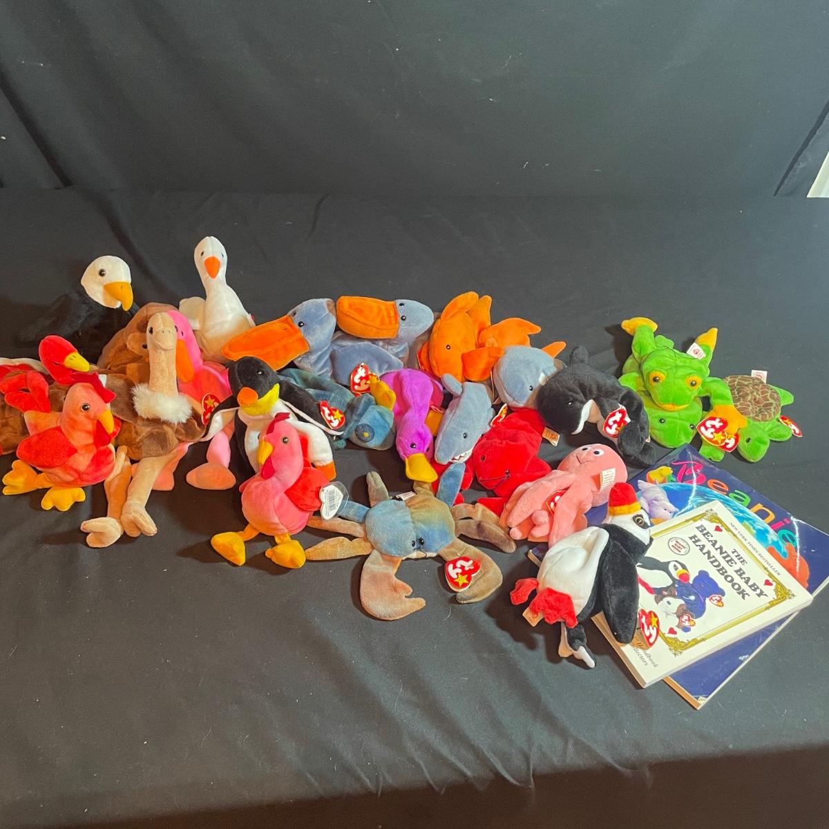 Twenty five tagged Beanie Babies plus two collector books. The swan, Gracie has a blemish, but the rest appear to be blemish free. Some rarer babies include Strut, Claude, and Gobbles. See images. Shipping available.