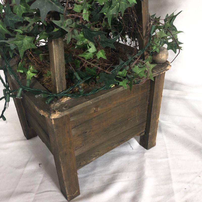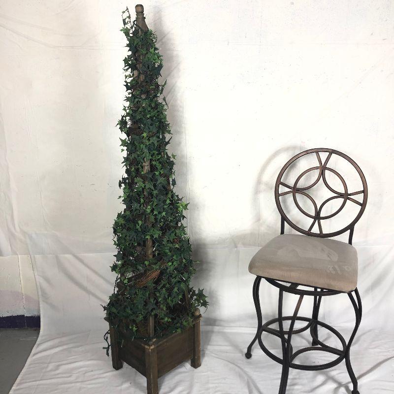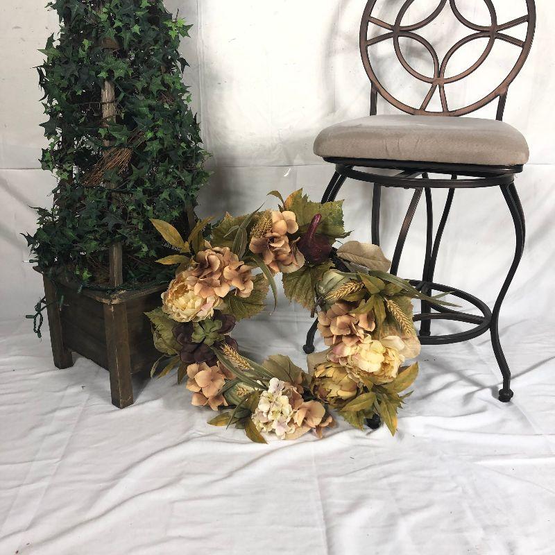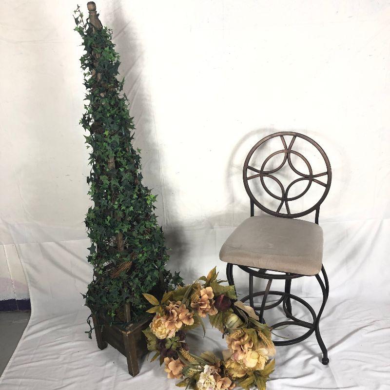 Metal Bar stool with fabric seat is 25" High - Pre lit Topiary Tree (not all lights work, wear to corners of wood) - Floral wreath