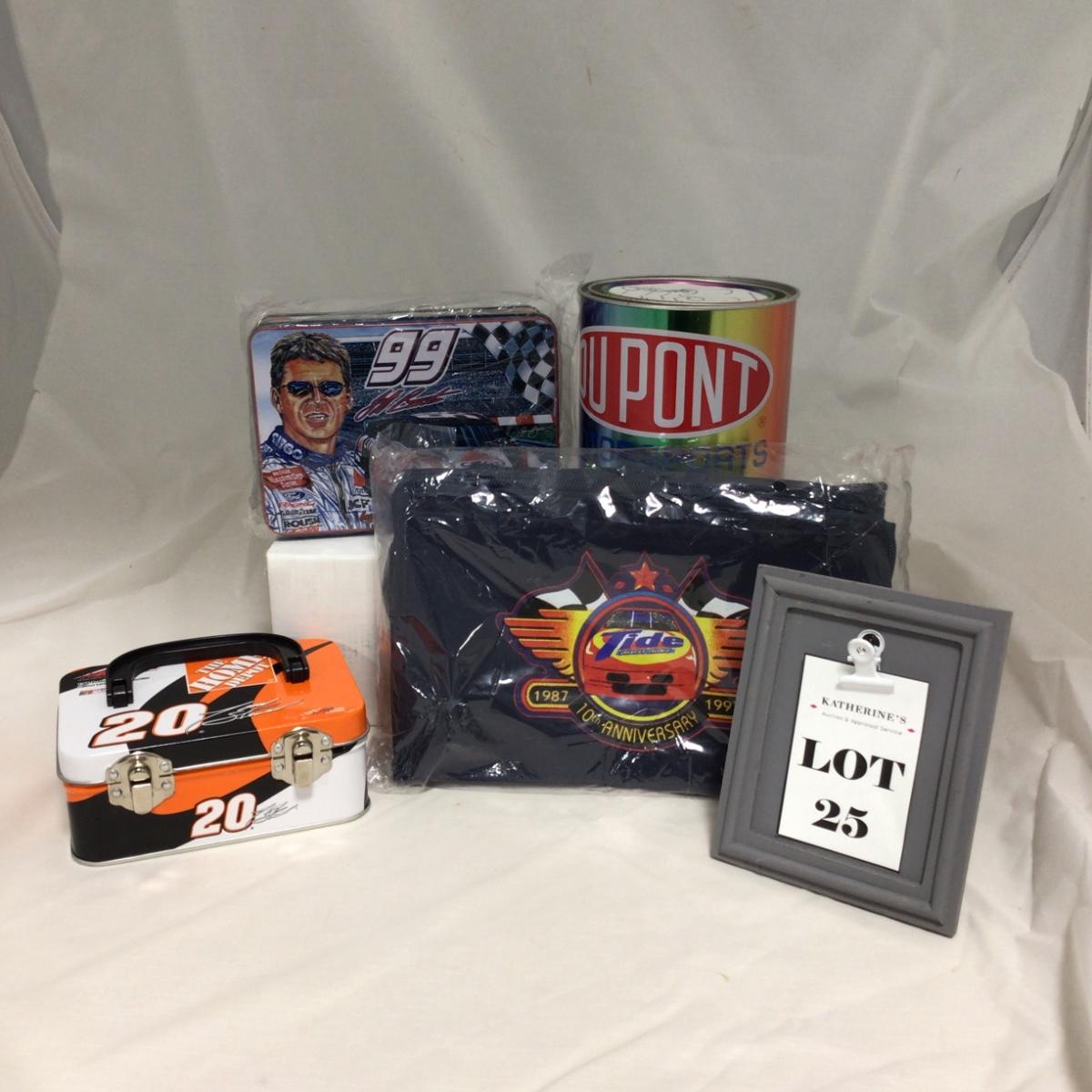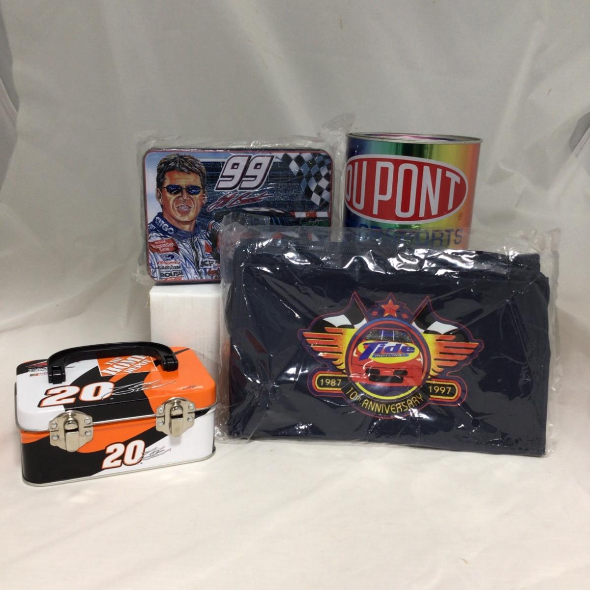 Four Nascar items, two miniature Nascar lunch tins with cars inside. One round Nascar tin with car inside. And Nascar Tide car branded miniature bag. Please see photos for details and condition. ::: Shipping is available on this lot. If you require shipping you must let us know at the close of the auction. We will coordinate with you after the item has been won. Shipping fees will include insurance up to or exceeding the value of all items being mailed. If you have any questions regarding this lot please contact the auctioneer either via this website, by direct email or by phone. PICK UP TIMES and other important information can be found in the TERMS and DESCRIPTION of the auction. Please take a look for pertinent information. Thanks!