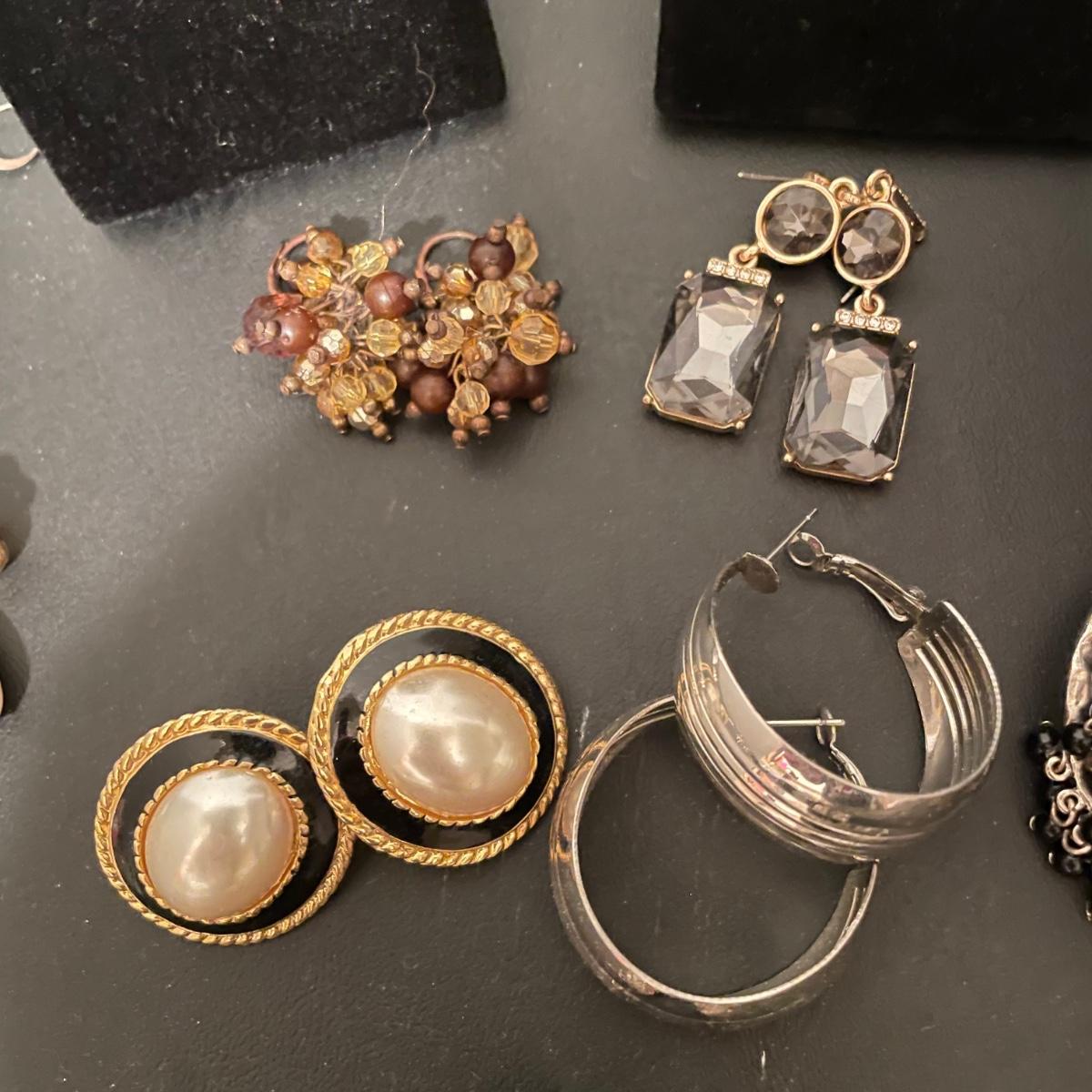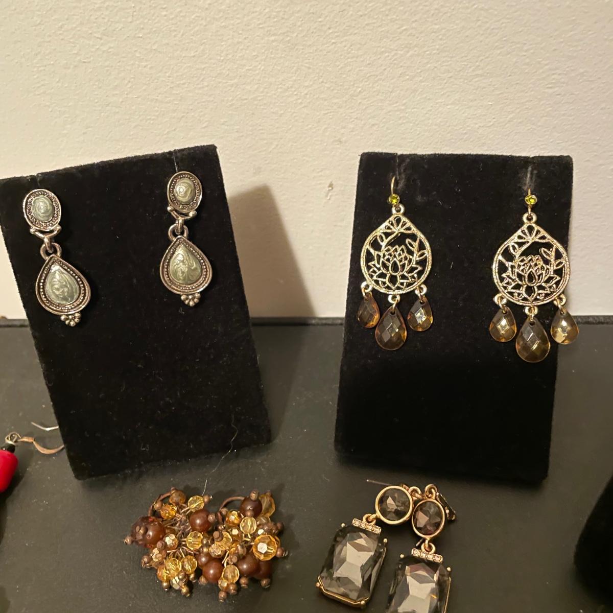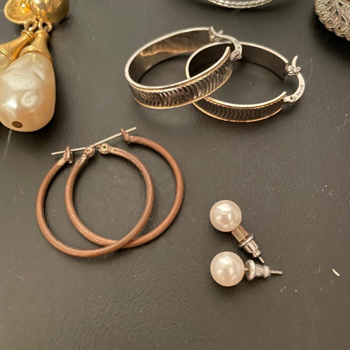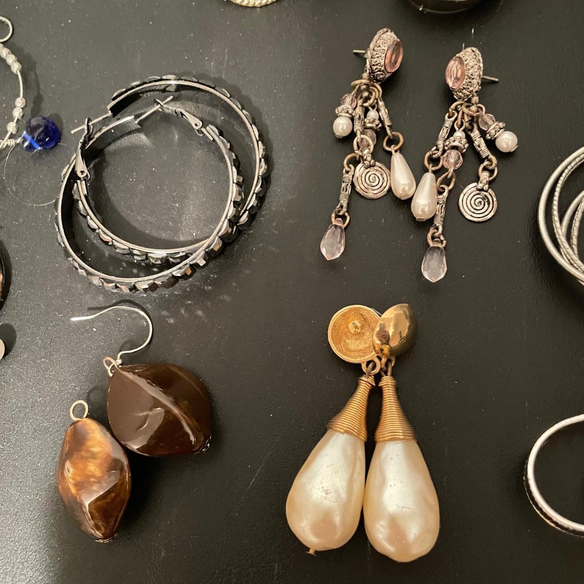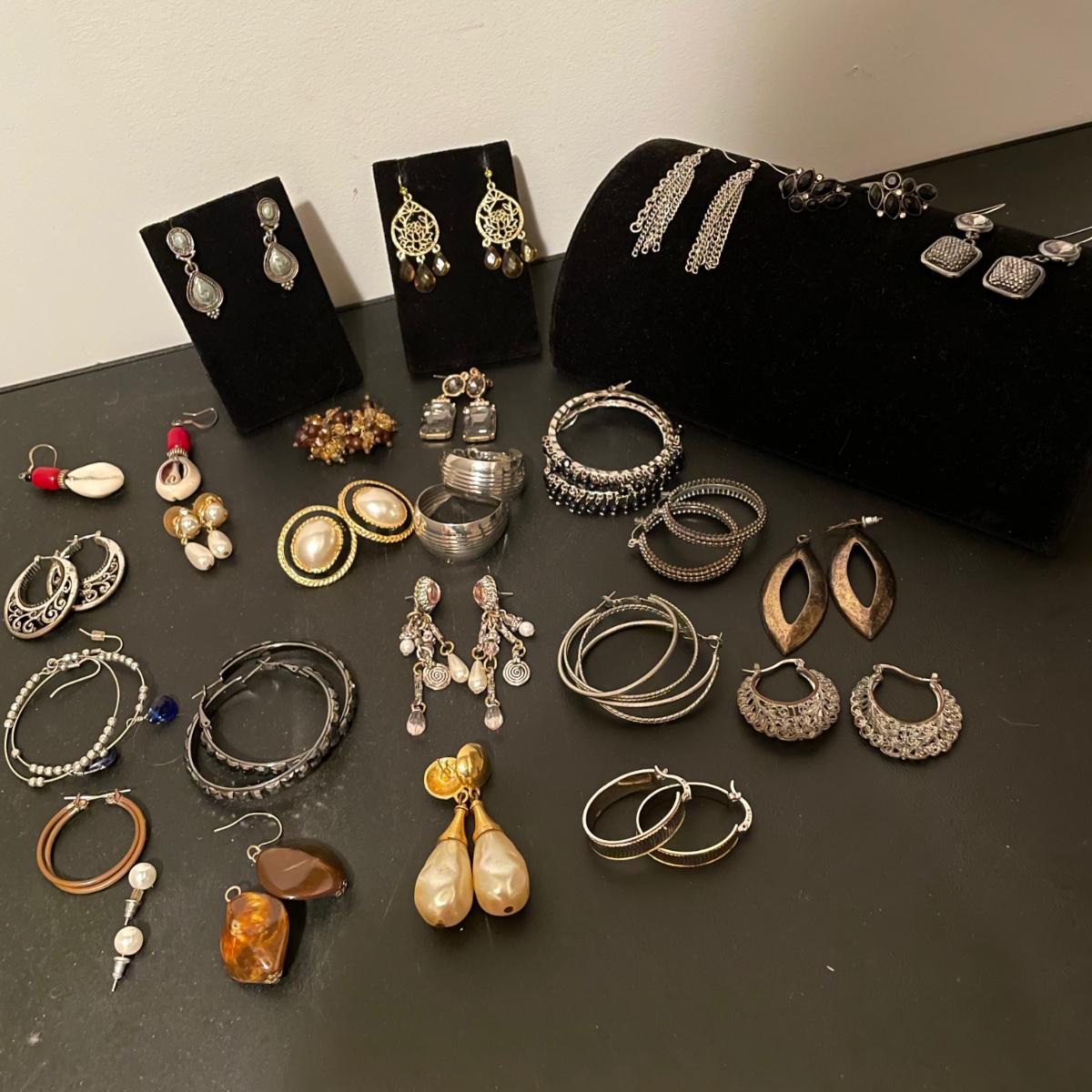 Twenty six pairs of earrings for pierced ears. Most pairs are hoops and dangles, but there is also a a pair of pearl-like studs. One pair that looks like polished brown rocks, but is likely manmade, has one French hook missing. It appears to be easily replaced. No known markings. See images. Shipping available.