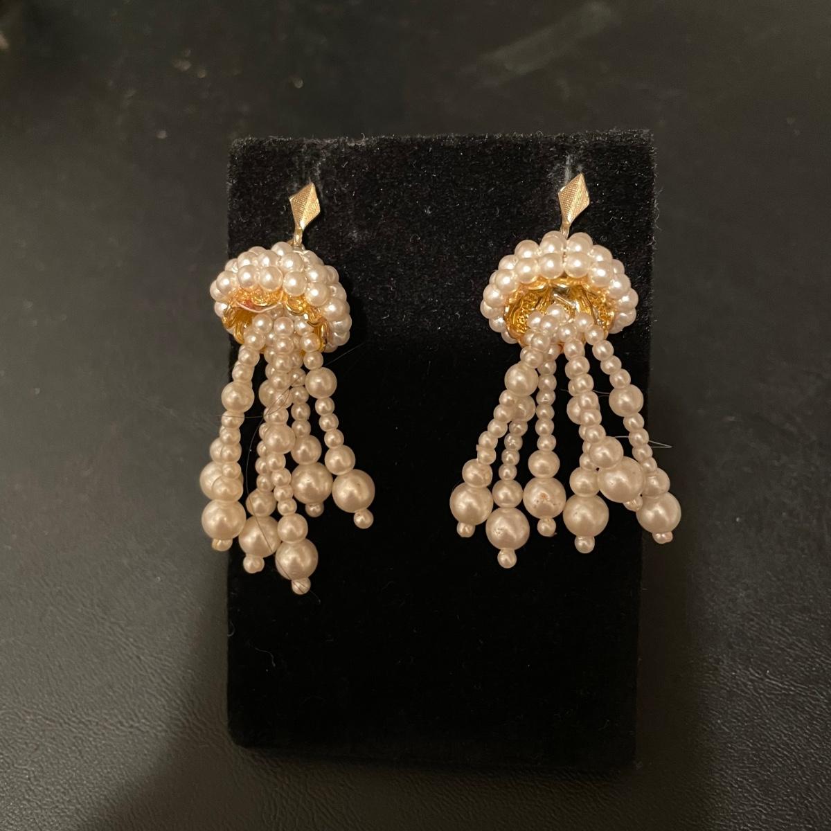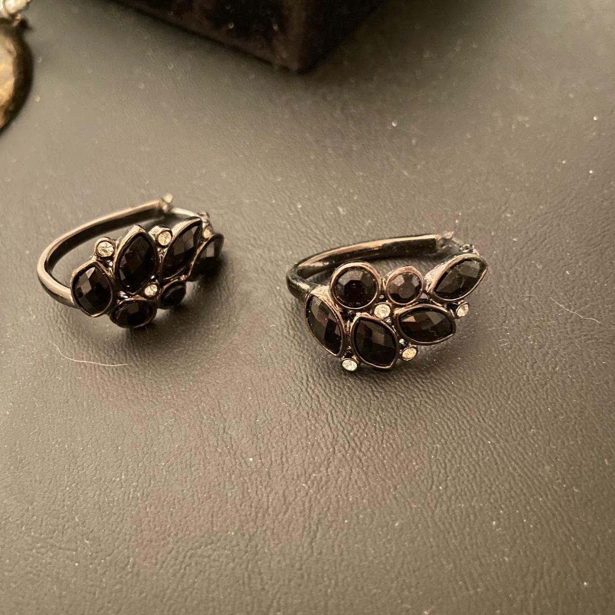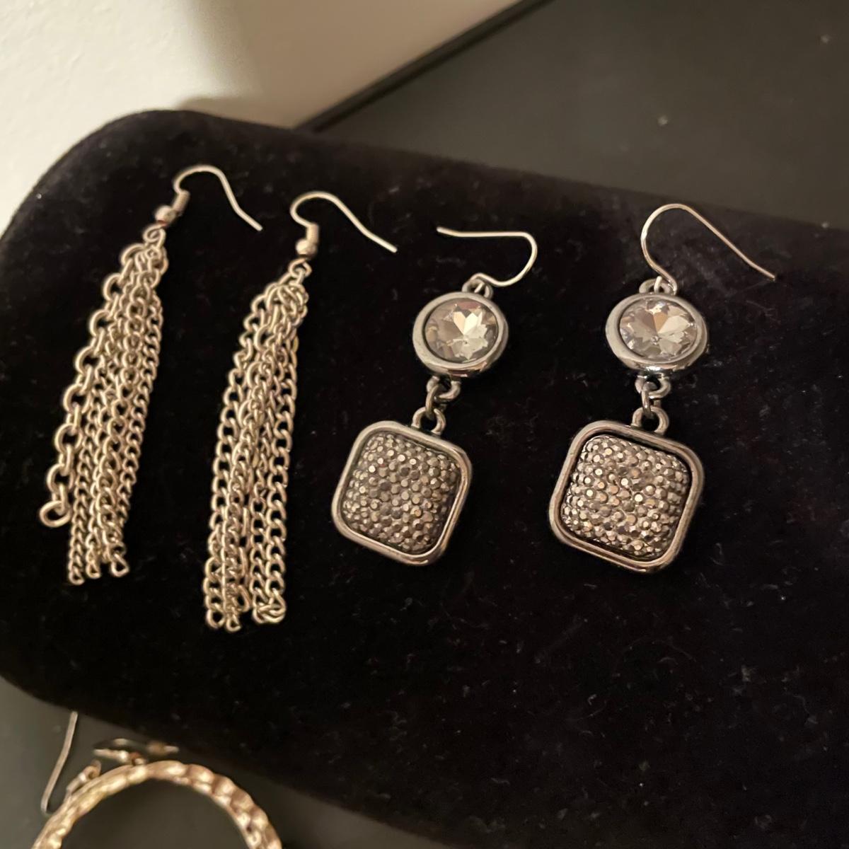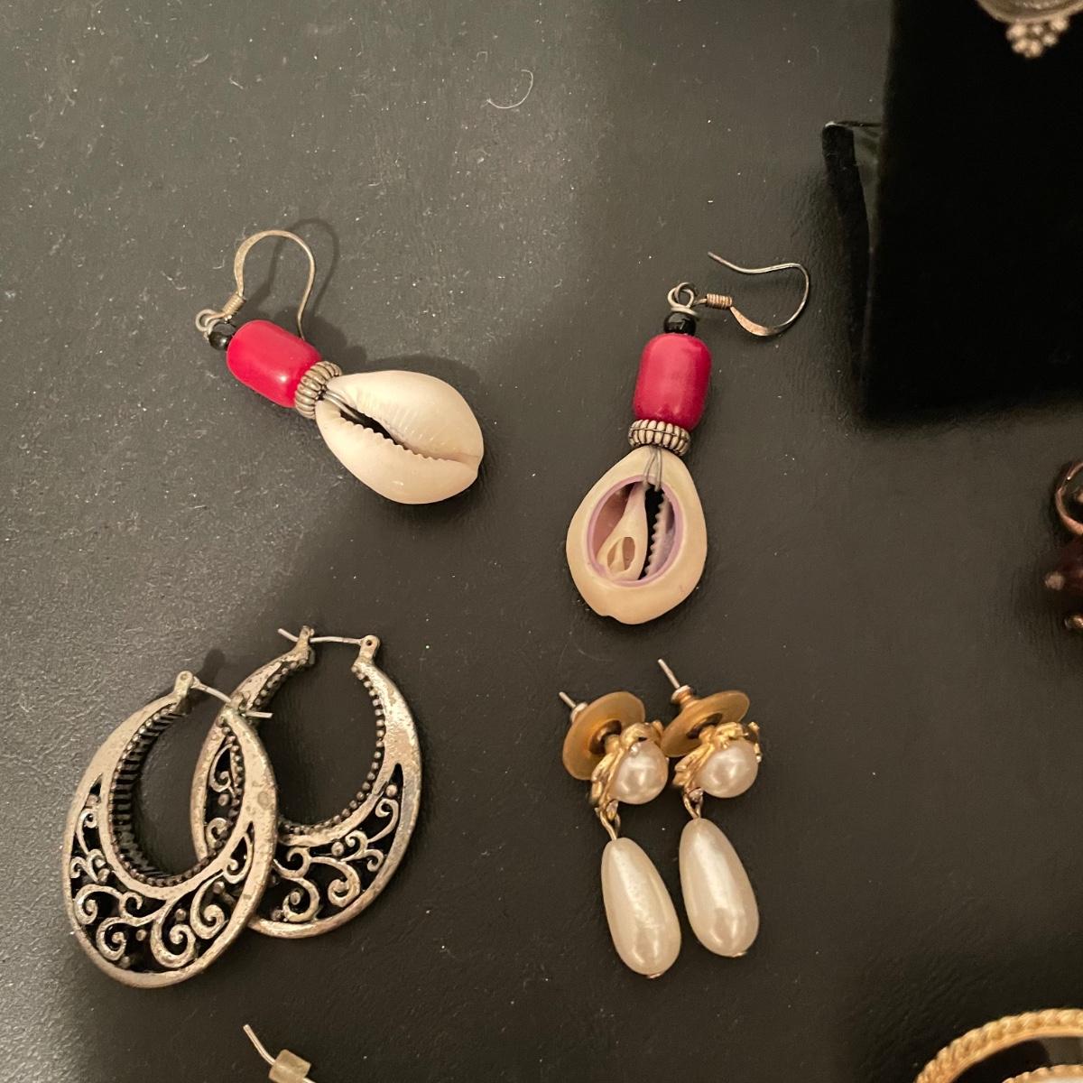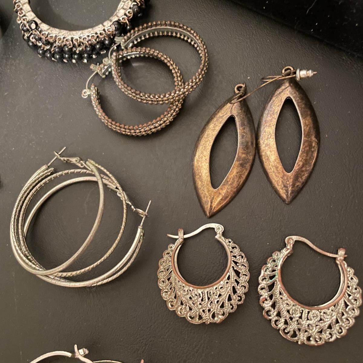 Twenty six pairs of earrings for pierced ears. Most pairs are hoops and dangles, but there is also a a pair of pearl-like studs. One pair that looks like polished brown rocks, but is likely manmade, has one French hook missing. It appears to be easily replaced. No known markings. See images. Shipping available.