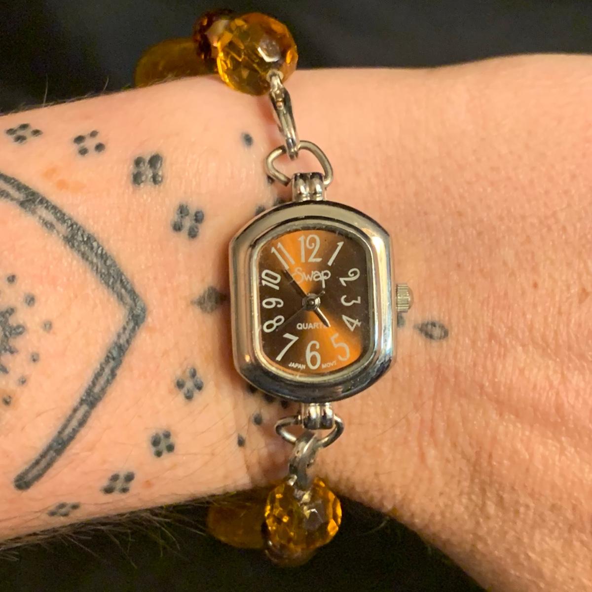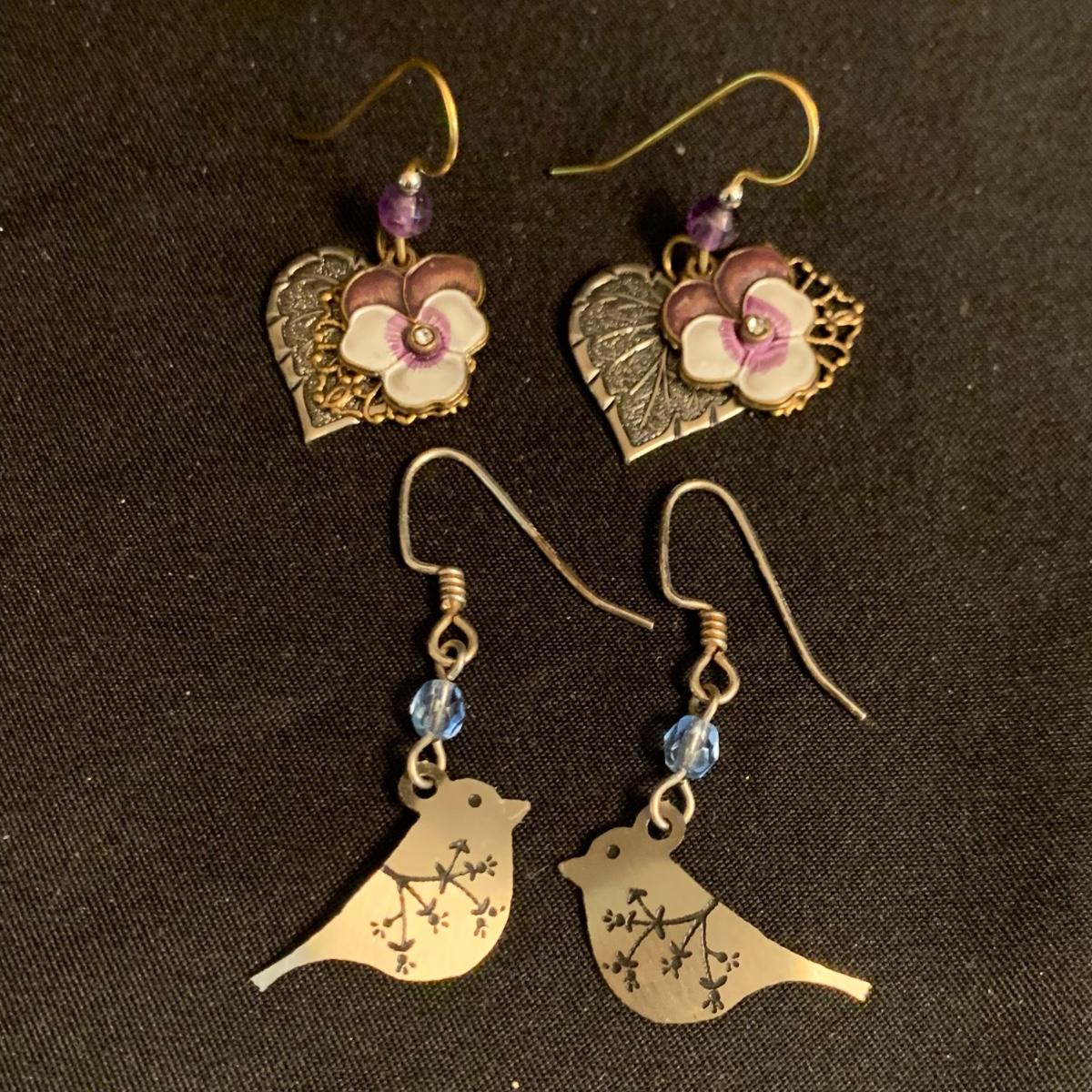 Approximately 27 pairs of a variety of earring styles for pierced ears, plus a necklace that matches one of the pairs of earrings, a pendant that is a set with one of the pairs of earrings, a glittery gold leaf pendant, a wood bird pin, a beaded watch, and seven bracelets. The birdhouse earrings are marked 925. The watch isn’t currently functioning and likely needs its battery replaced. Not all post earrings have backs included. The necklace can be worn from 15” to 18”.