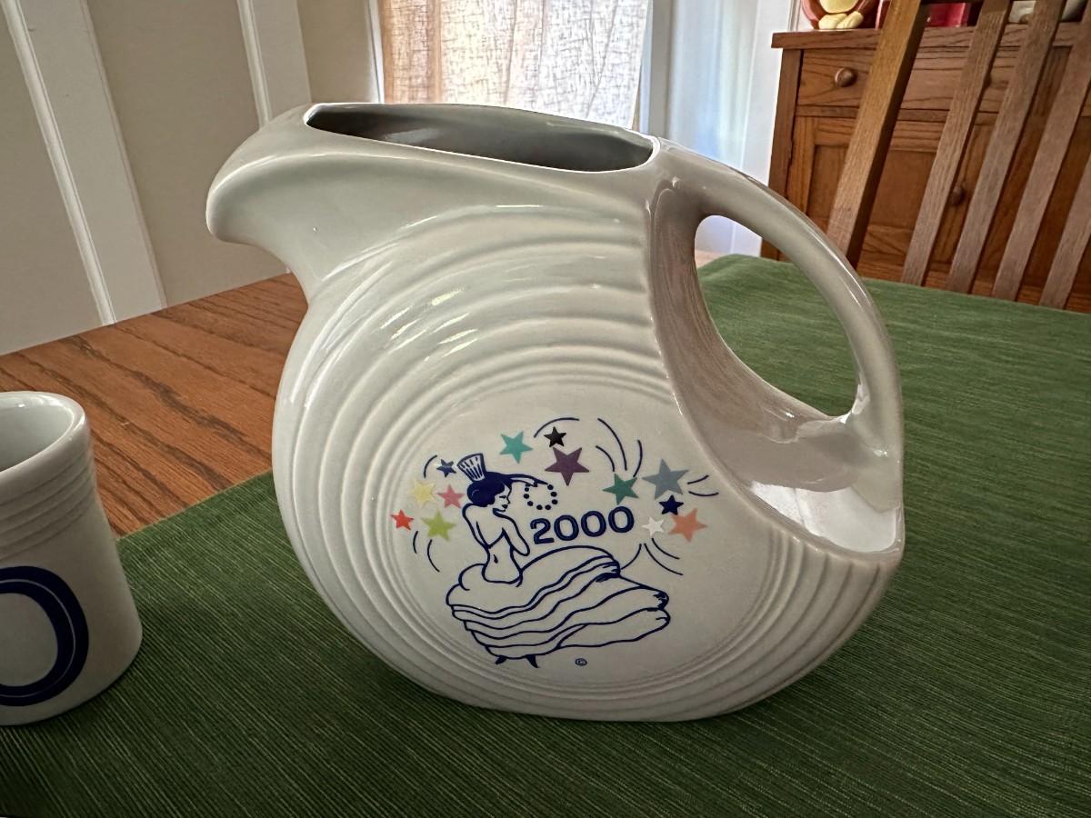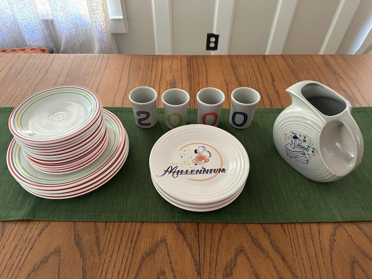 4 "New Minnennium Plates, 4 Gray Cups 2-0-0-0, 1 Gray Pitcher 2000. 4 Dinner Plates and 12 Salad Plates, White w/Striped Border