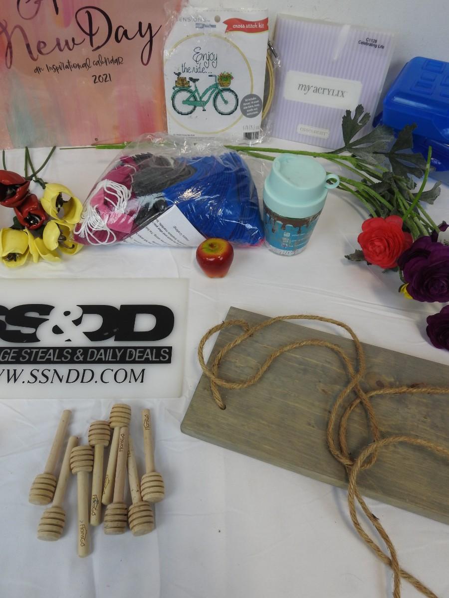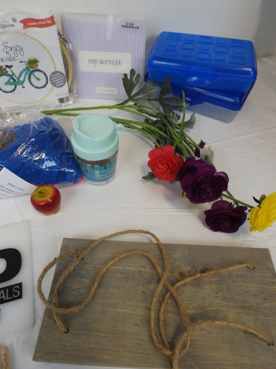 25 pc Crafts Lot: Faux Flowers Frame, Shelf, Calendar, Fabric Strips, Desk Lamp