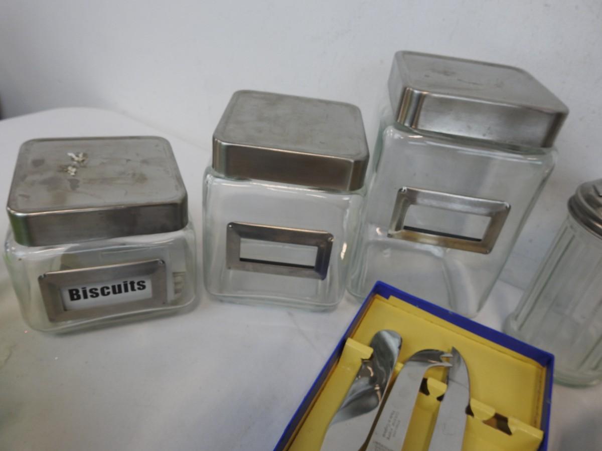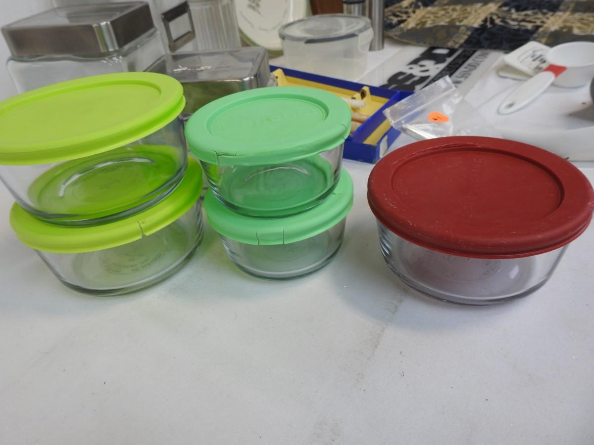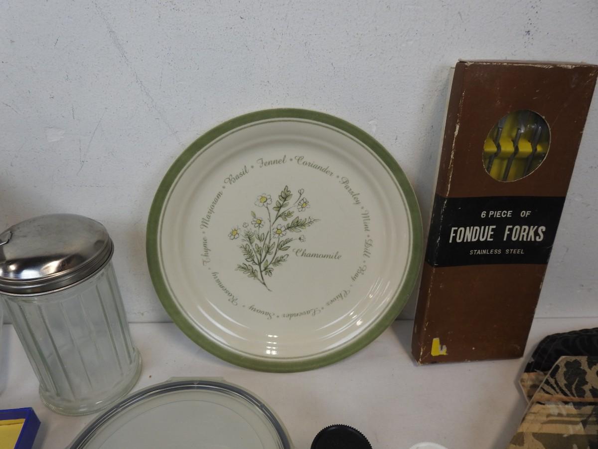 25 pc Kitchen Lot: Placemats, Canisters, Food Containers, Shakers, Fondue Forks