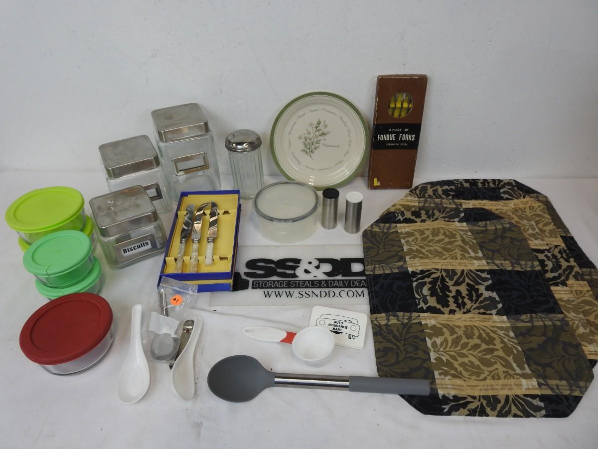 25 pc Kitchen Lot: Placemats, Canisters, Food Containers, S&P Shakers, Fondue Forks
