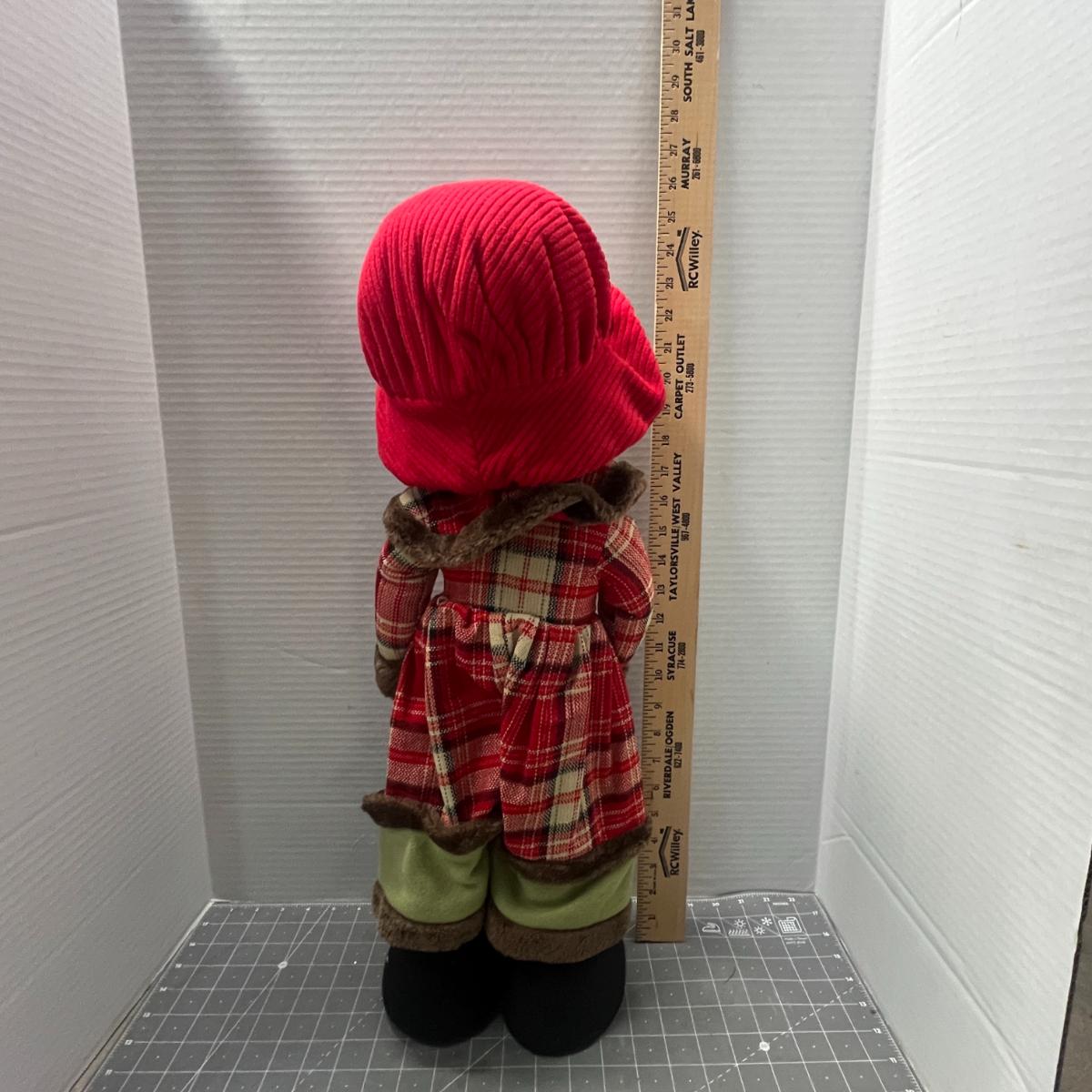 Wears red plaid coat, green pants, holds “Merry Christmas” book.