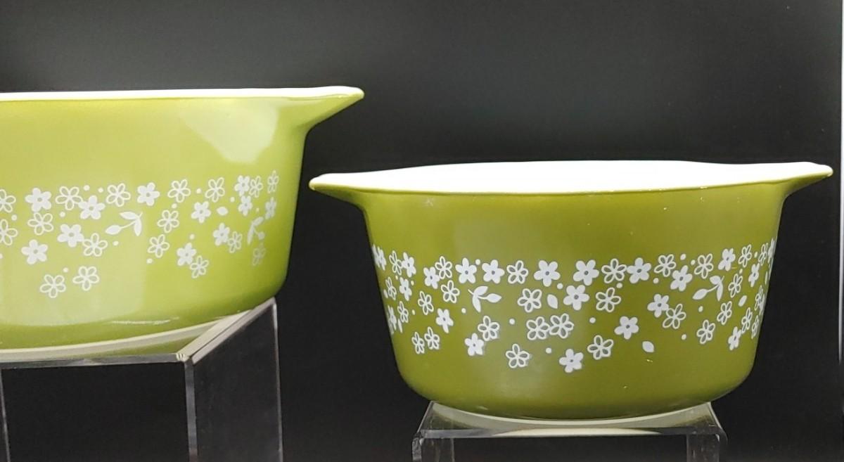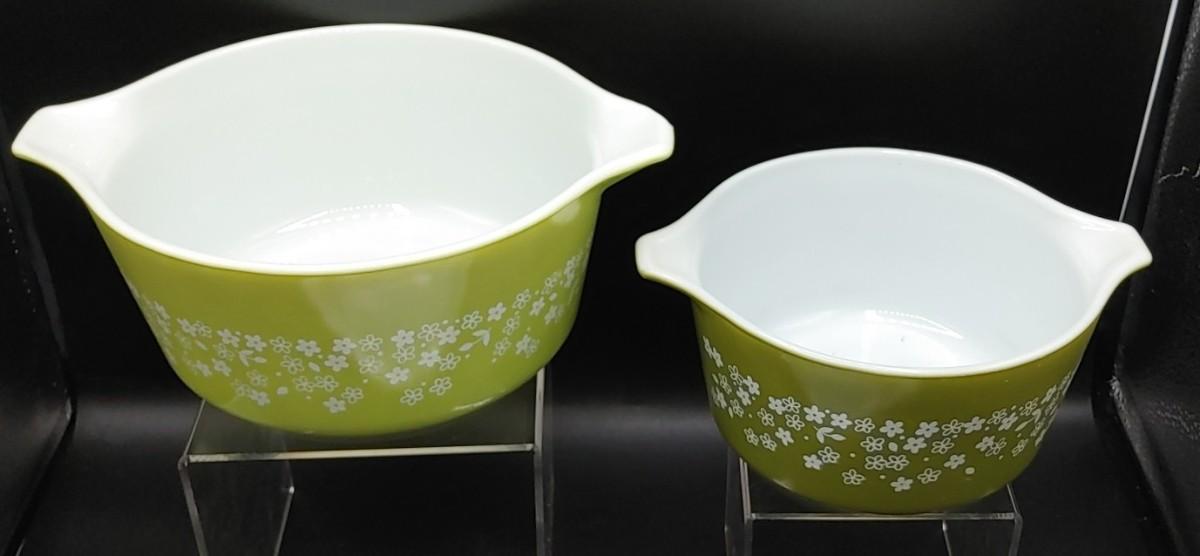 2) Top left Pyrex Lime Green Crazy Daisy Spring Blossom CINDERELLA Casserole 474-B no lid