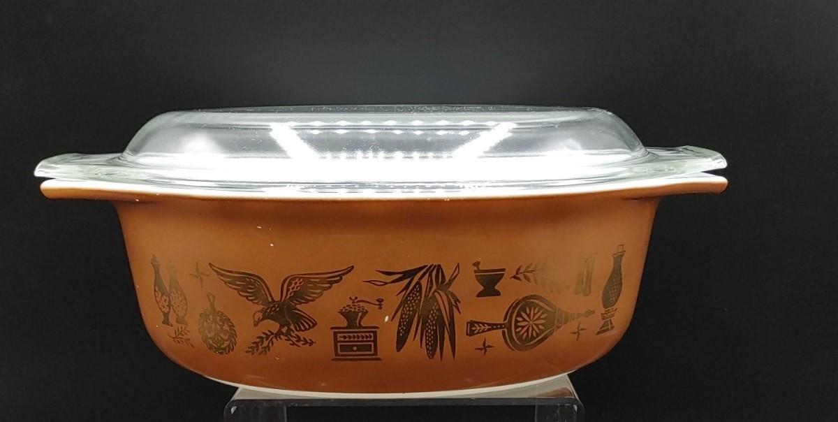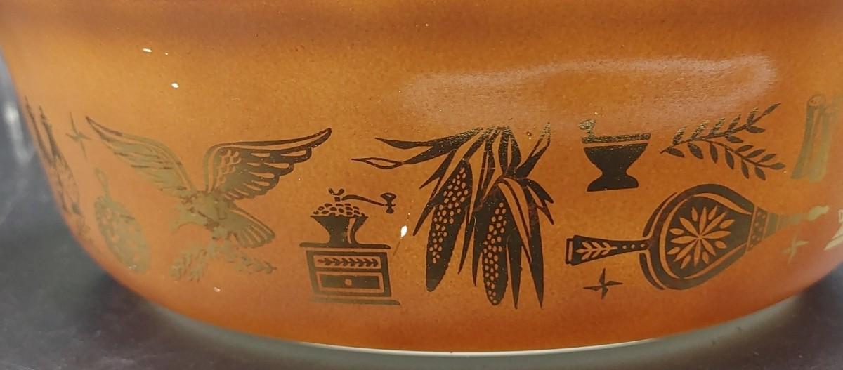 1) On the bottom is Pyrex EARLY AMERICAN EAGLE Casserole Dish Bowl #471 1 PT with lid ( all graphics are great..just can't see all of them in the photo