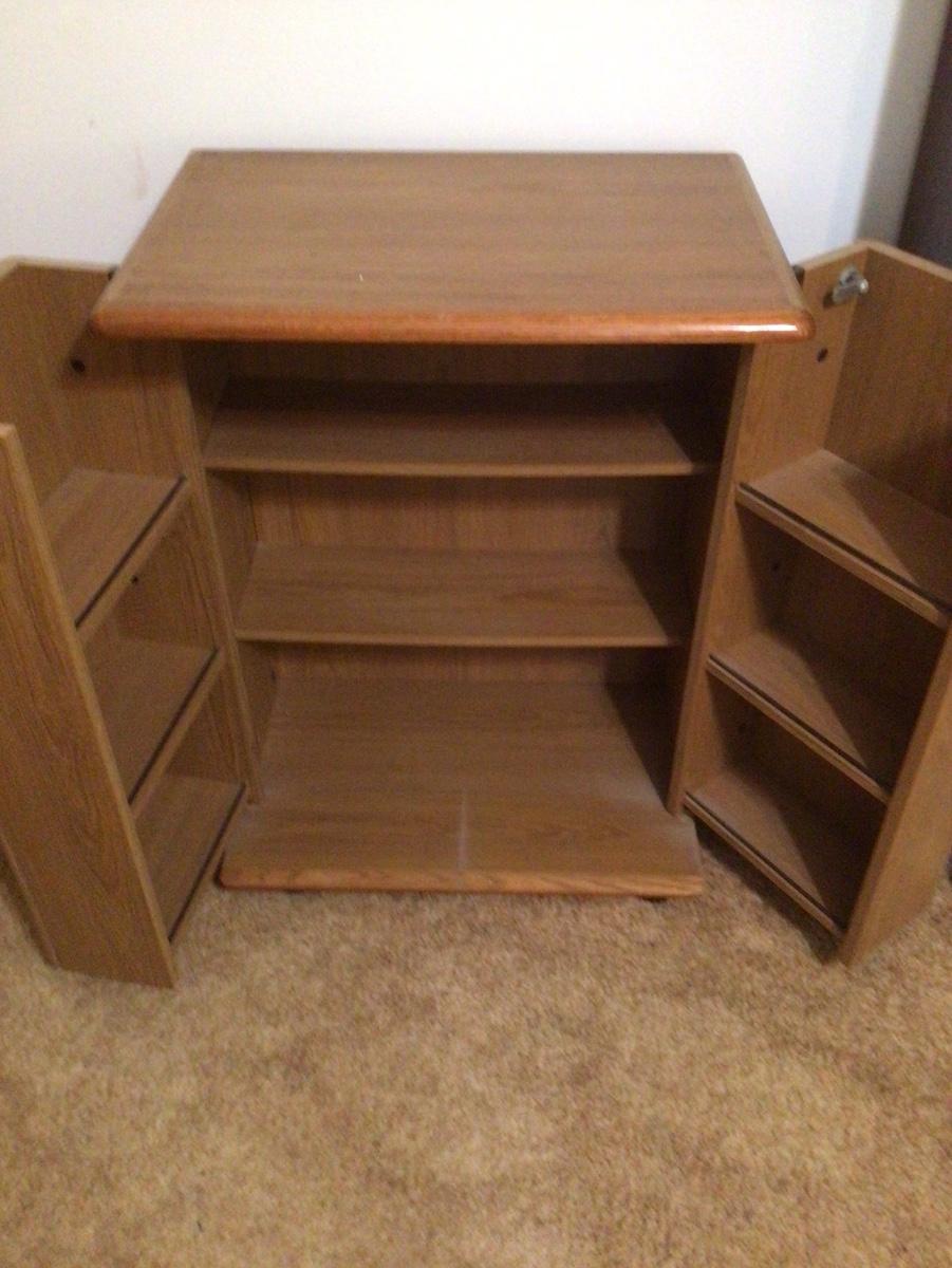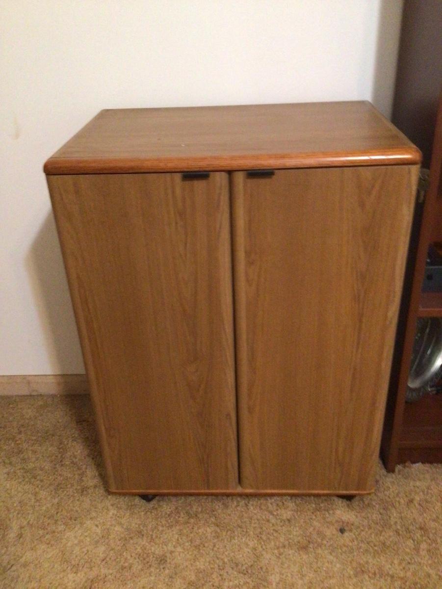 Cabinet has a lock, opens to 4 separate compartments, cabinet is on wheels, measures 23” x 31” x 15”.