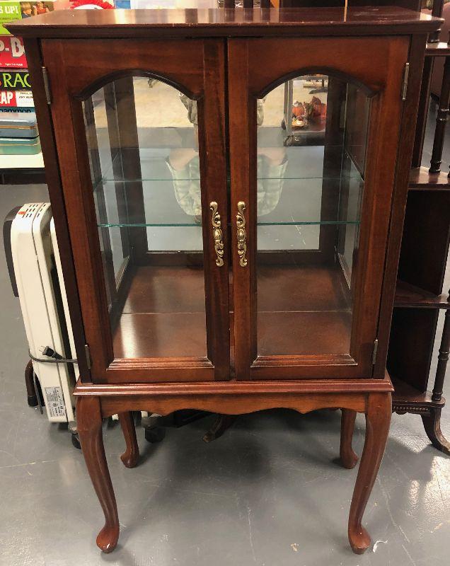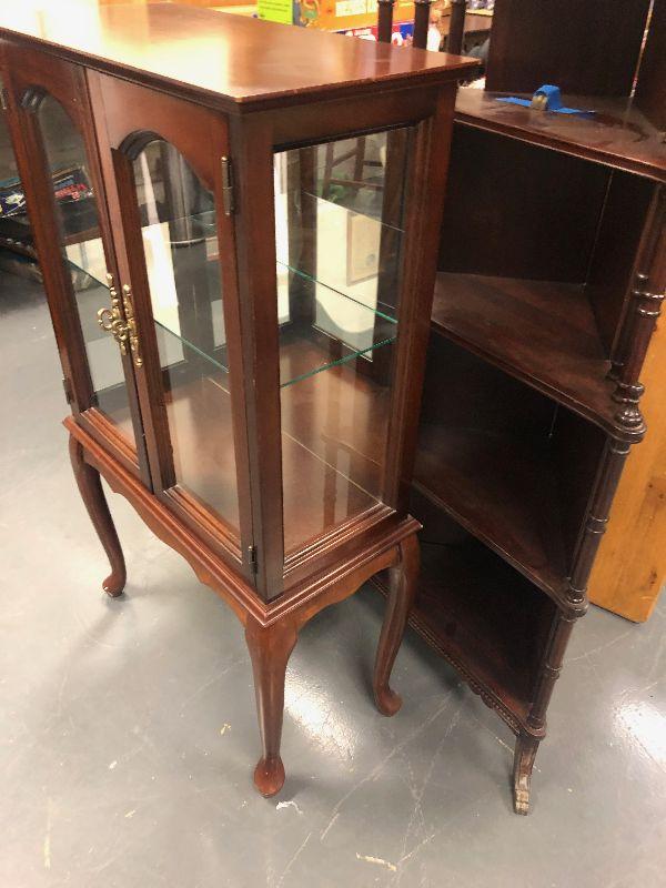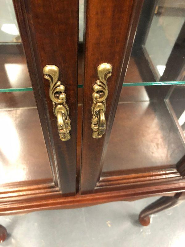 #250 Mirrored back, Brass Handled Queen Ann Leg Glass and Cherry Wood Cabinet