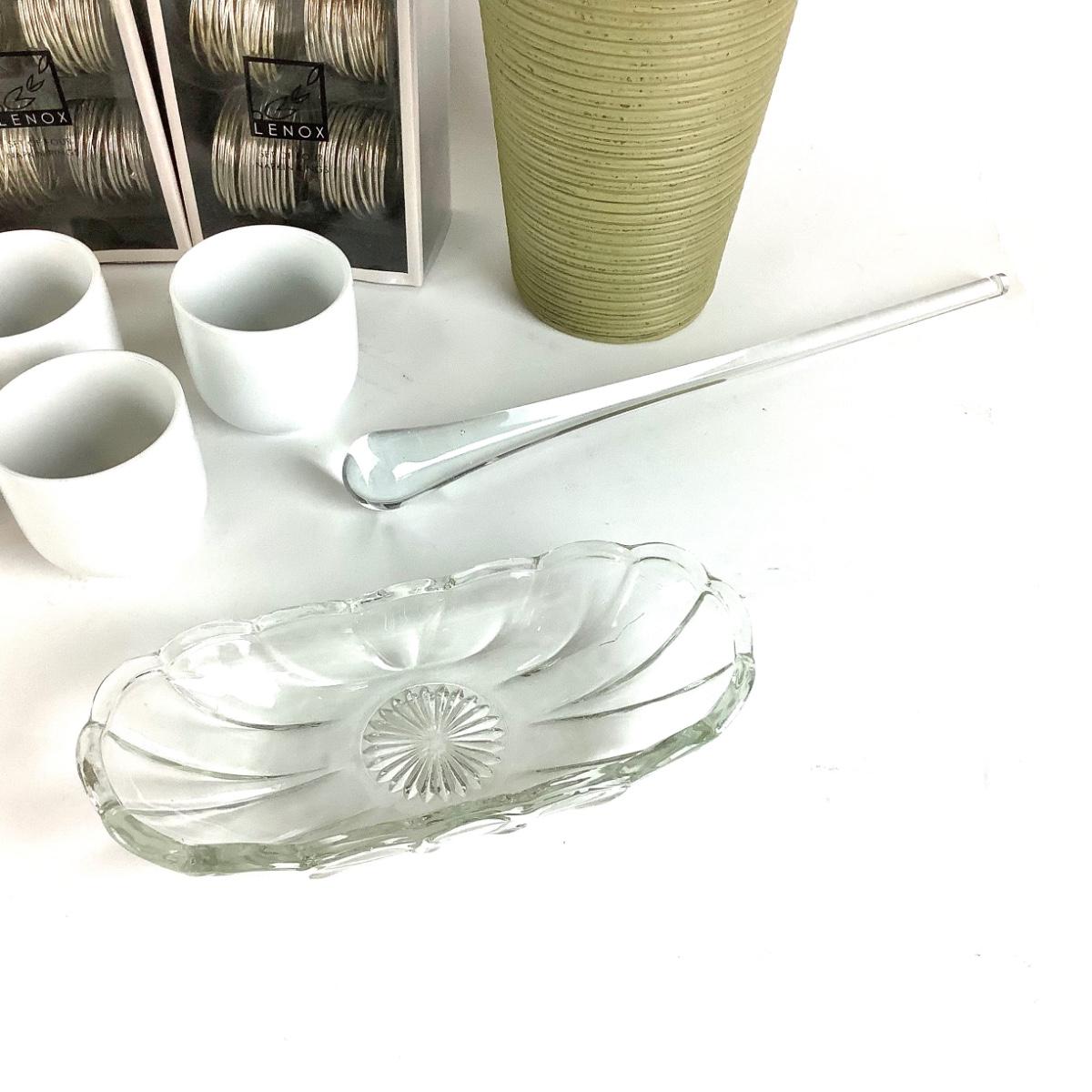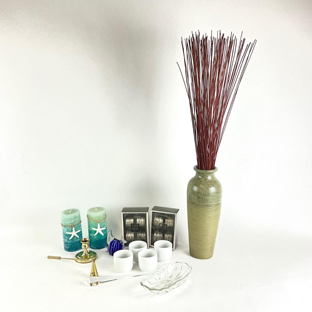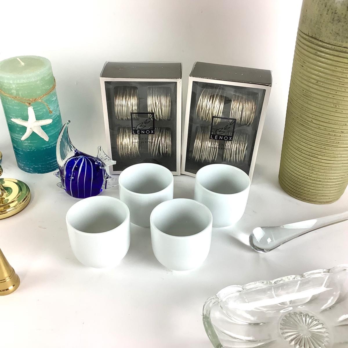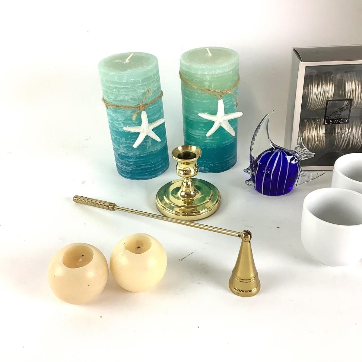 Lot of eight Lenox napkin rings, tall pottery vase, glass fish (small chip on tail fin) glass wand/stick, four Pier 1 white cups, 2 pillar candles, brass candle snuffer, one brass candlestick, pair small ball candles.