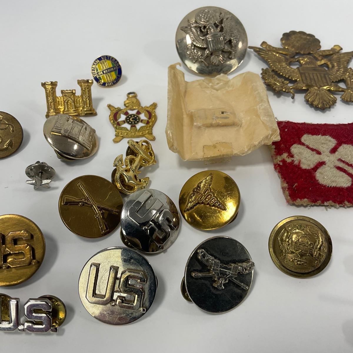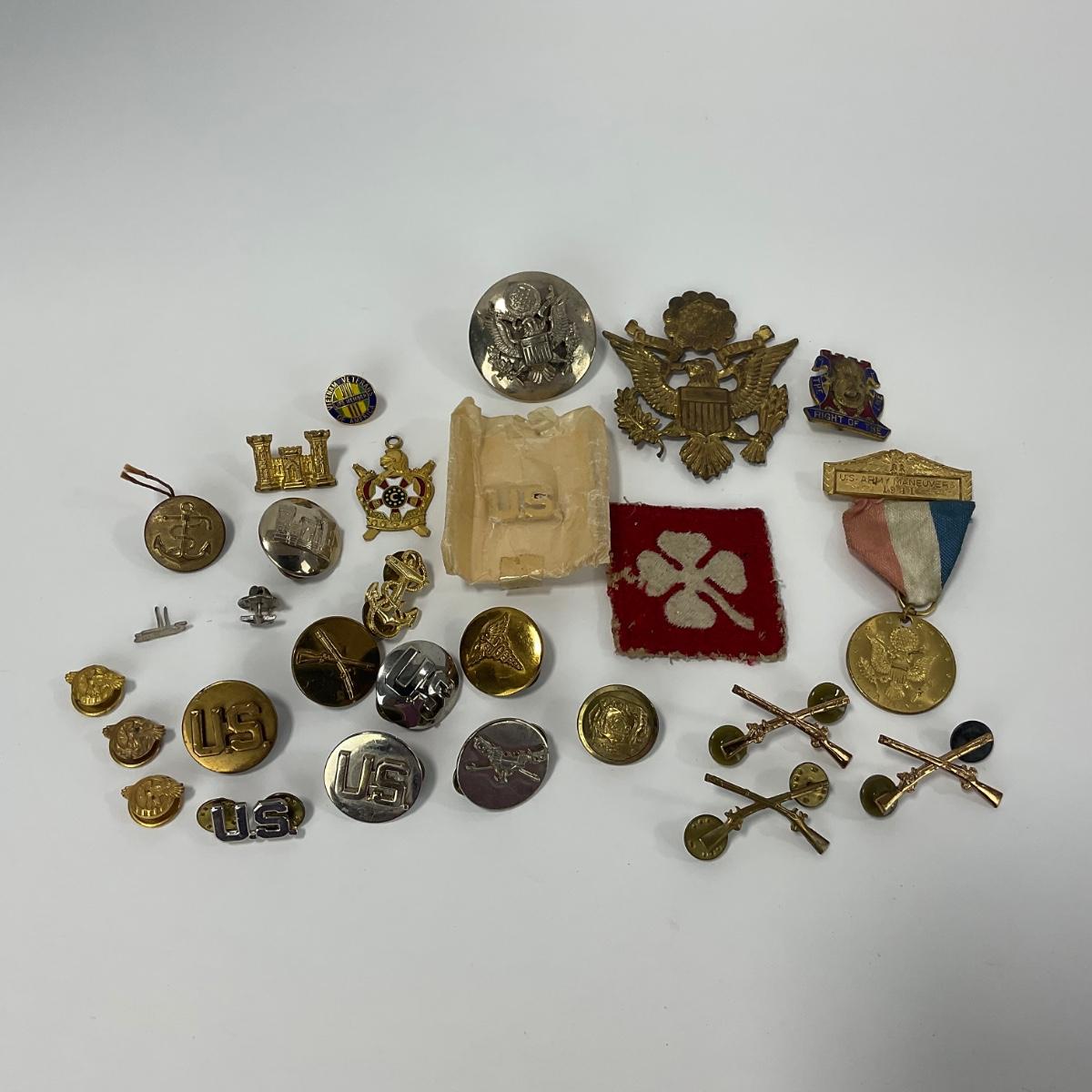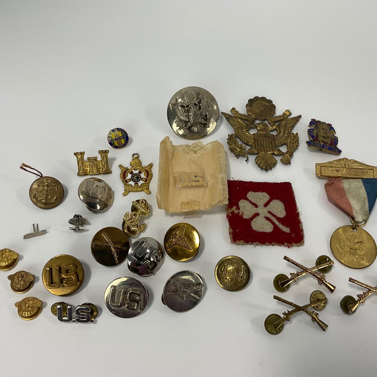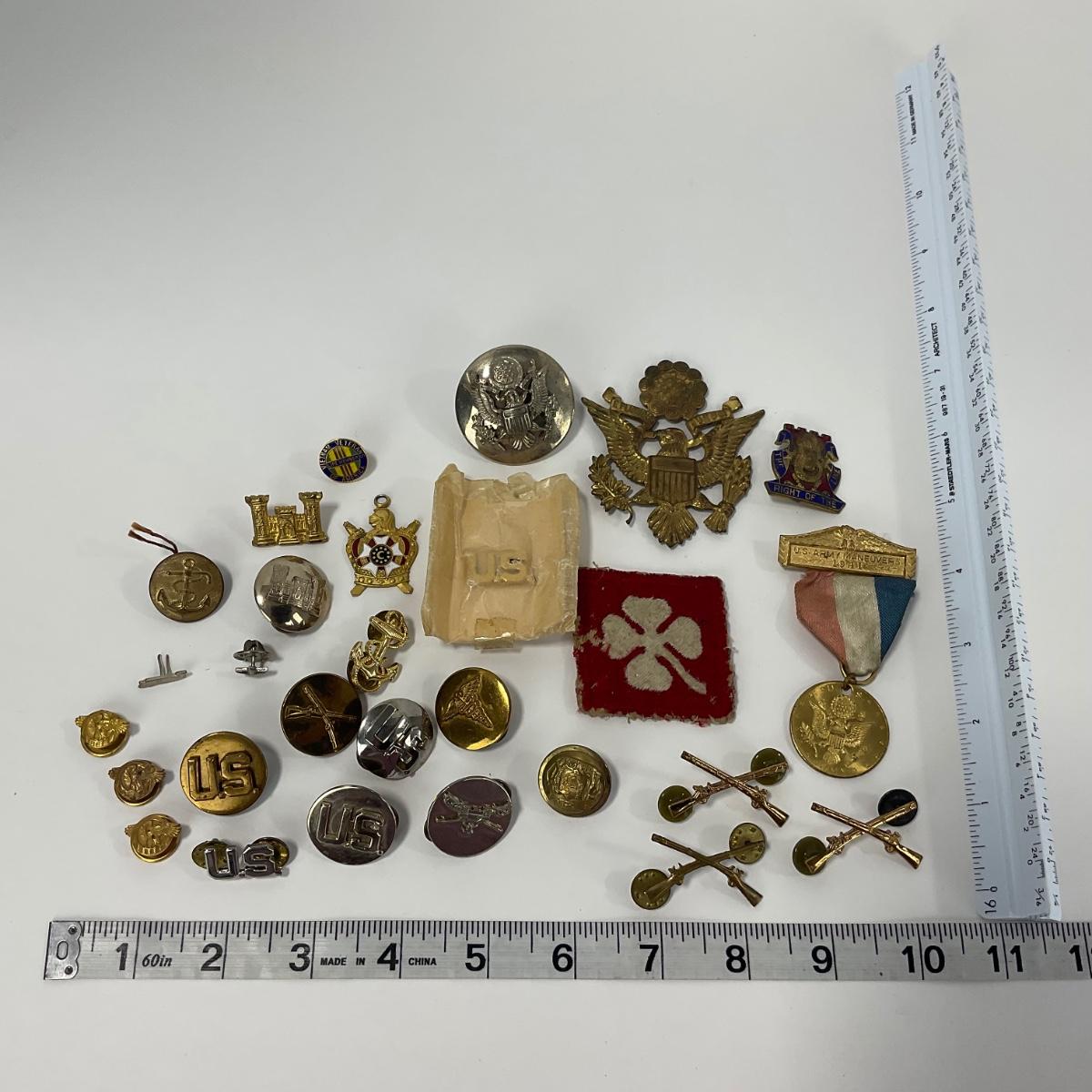 Over 25 plus vintage military / army pins and buttons. These pieces are worn and may have slight damage. Please see photos for details and condition. ::: Shipping is available on this lot. If you require shipping you must let us know at the close of the auction. We will coordinate with you after the item has been won. Shipping fees will include insurance up to or exceeding the value of all items being mailed. If you have any questions regarding this lot please contact the auctioneer either via this website, by direct email or by phone. PICK UP TIMES and other important information can be found in the TERMS and DESCRIPTION of the auction. Please take a look for pertinent information. Thanks!
