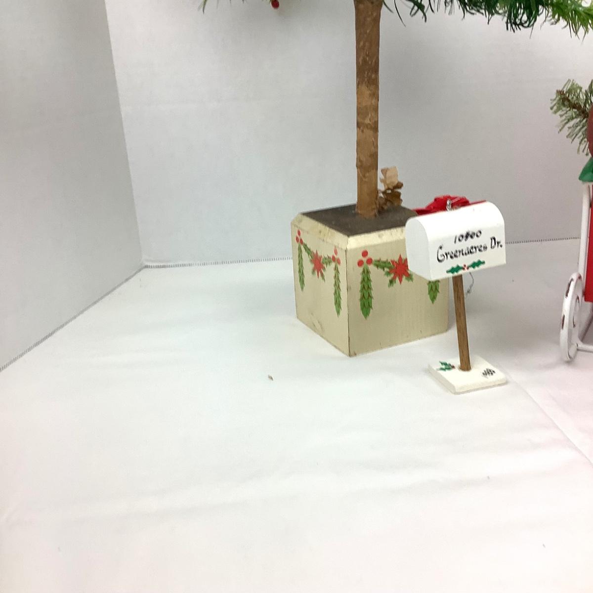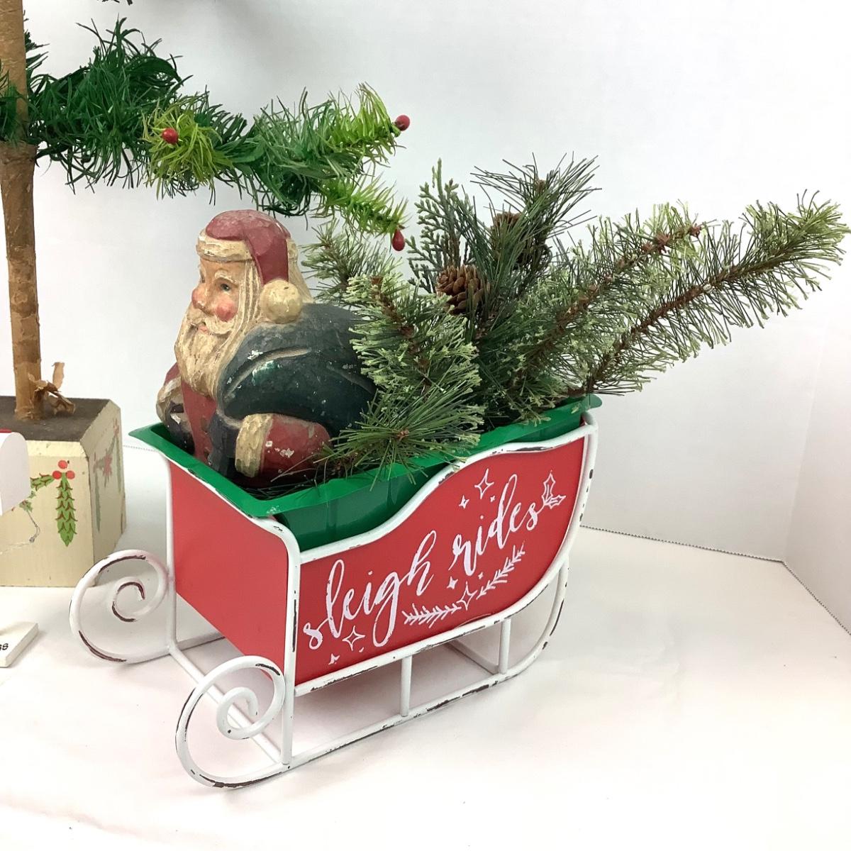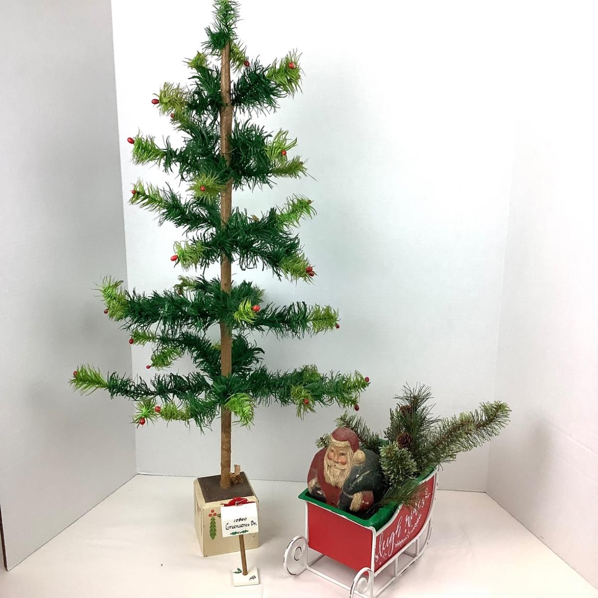 The feather tree is 32" tall, the sleigh is 8" x 6". The Santa is wooden and vintage.