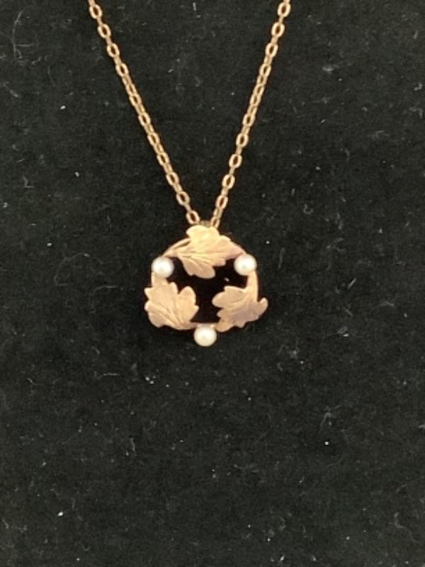 10 Karat yellow and rose gold necklace with small pearls and leaf motif, both pendant and chain are 10 karat gold, weighs 11.6 grams