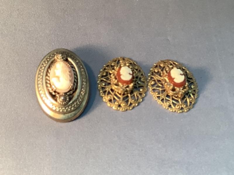One cameo brooch and two cameo pieces that look to have been part of a bracelet or necklace that could be made into brooches