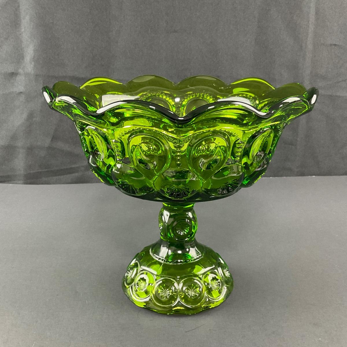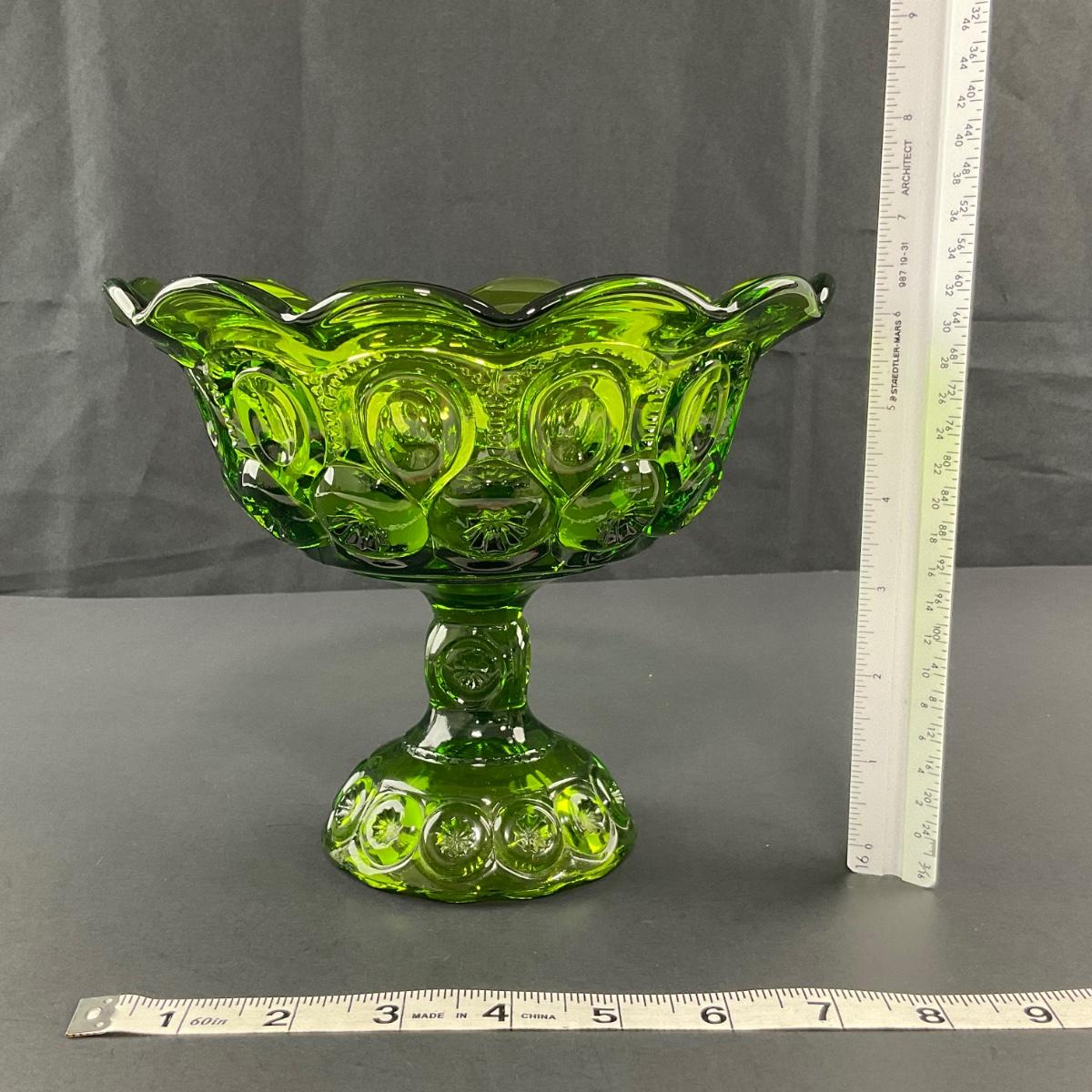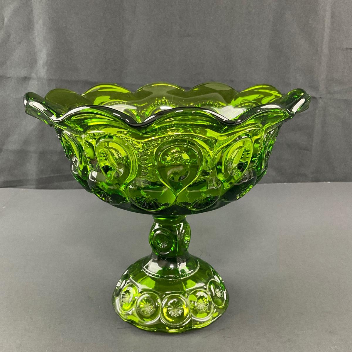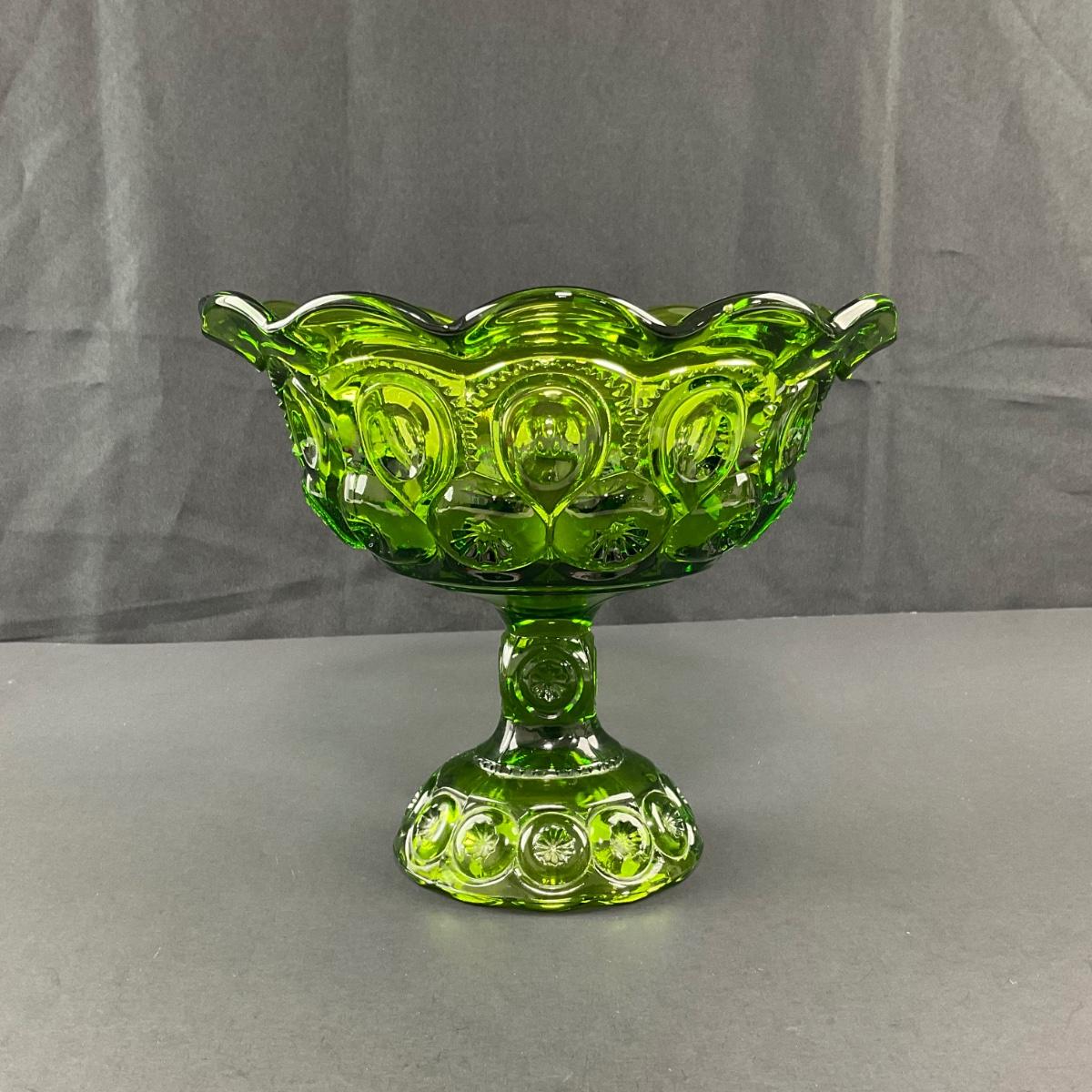 One vintage Green Le Smith Moon & Stars crimped tall compote. This piece has no damage, and appears to be in great shape with no visable chips, cracks, or broken pieces. This is the perfect piece to add to any collection! Please see photos for details and condition. Any condition statement is given as a courtesy to a client, is an opinion, and should not be treated as a statement of fact. Reference to condition written, oral or within a condition report shall not be regarded as a full account of condition and may not include all defects, alterations, or restorations. Absence of a condition report does not imply a lot is flawless or lacking imperfections or damage. Katherine’s Auction & Appraisal Service shall have no responsibility for any error or omission. Returns shall not be accepted on the basis of condition. ::: Shipping is available on this lot. If you require shipping you must let us know at the close of the auction. We will coordinate with you after the item has been won. Shipping fees will include insurance up to or exceeding the value of all items being mailed. If you have any questions regarding this lot please contact the auctioneer either via this website, by direct email or by phone. PICK UP TIMES and other important information can be found in the TERMS and DESCRIPTION of the auction. Please take a look for pertinent information. Thanks!