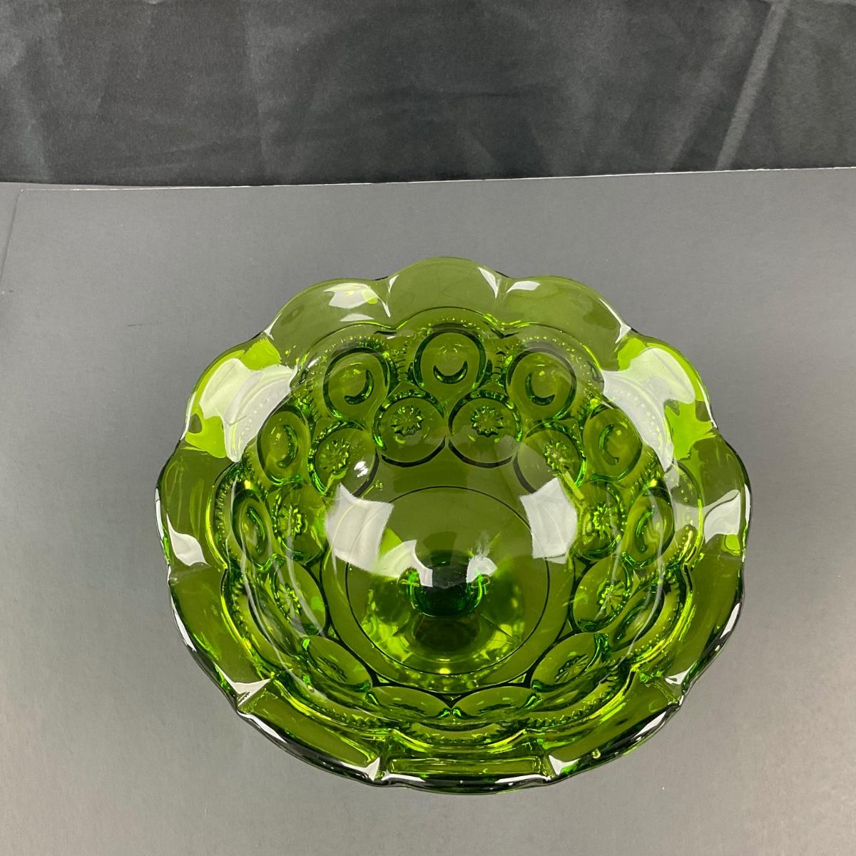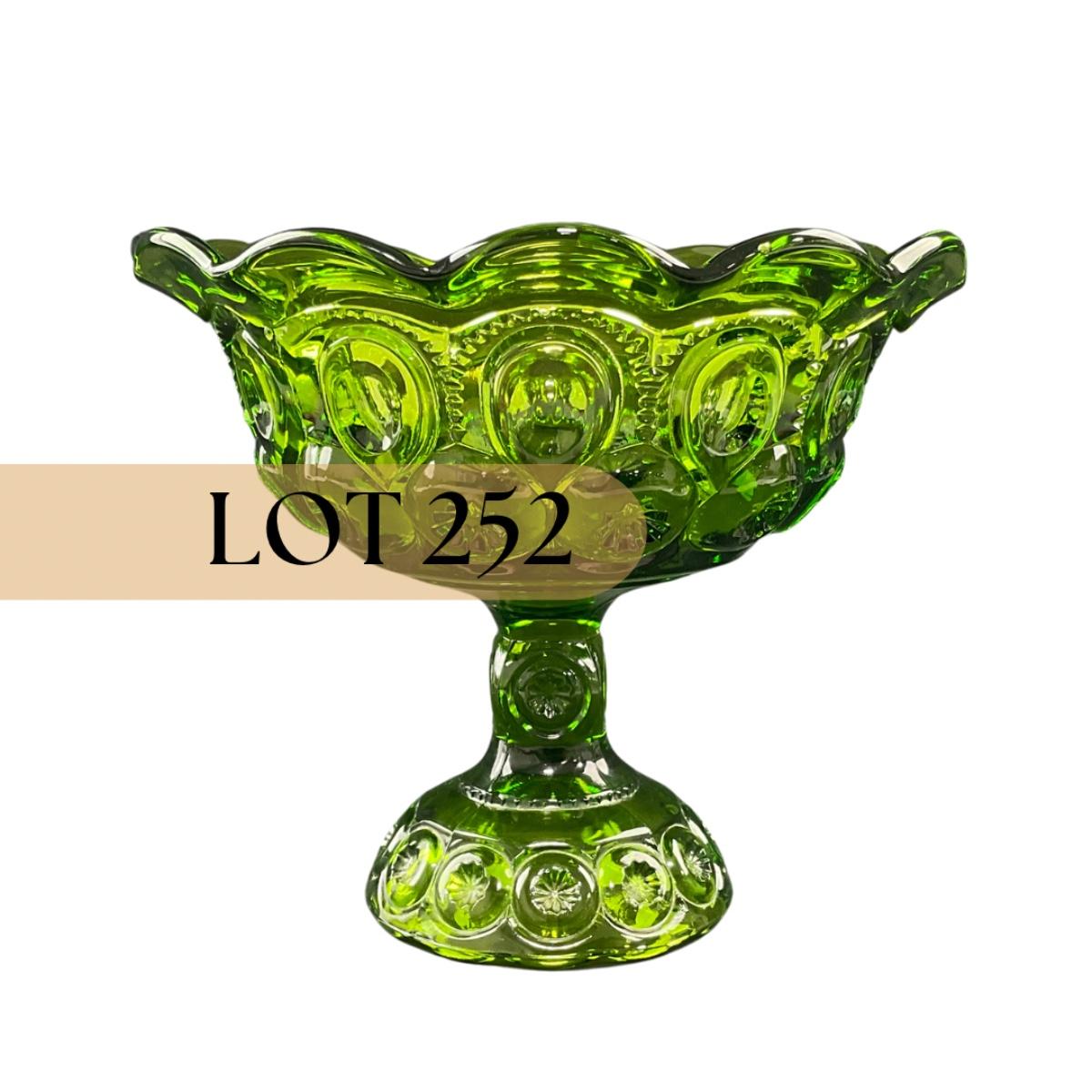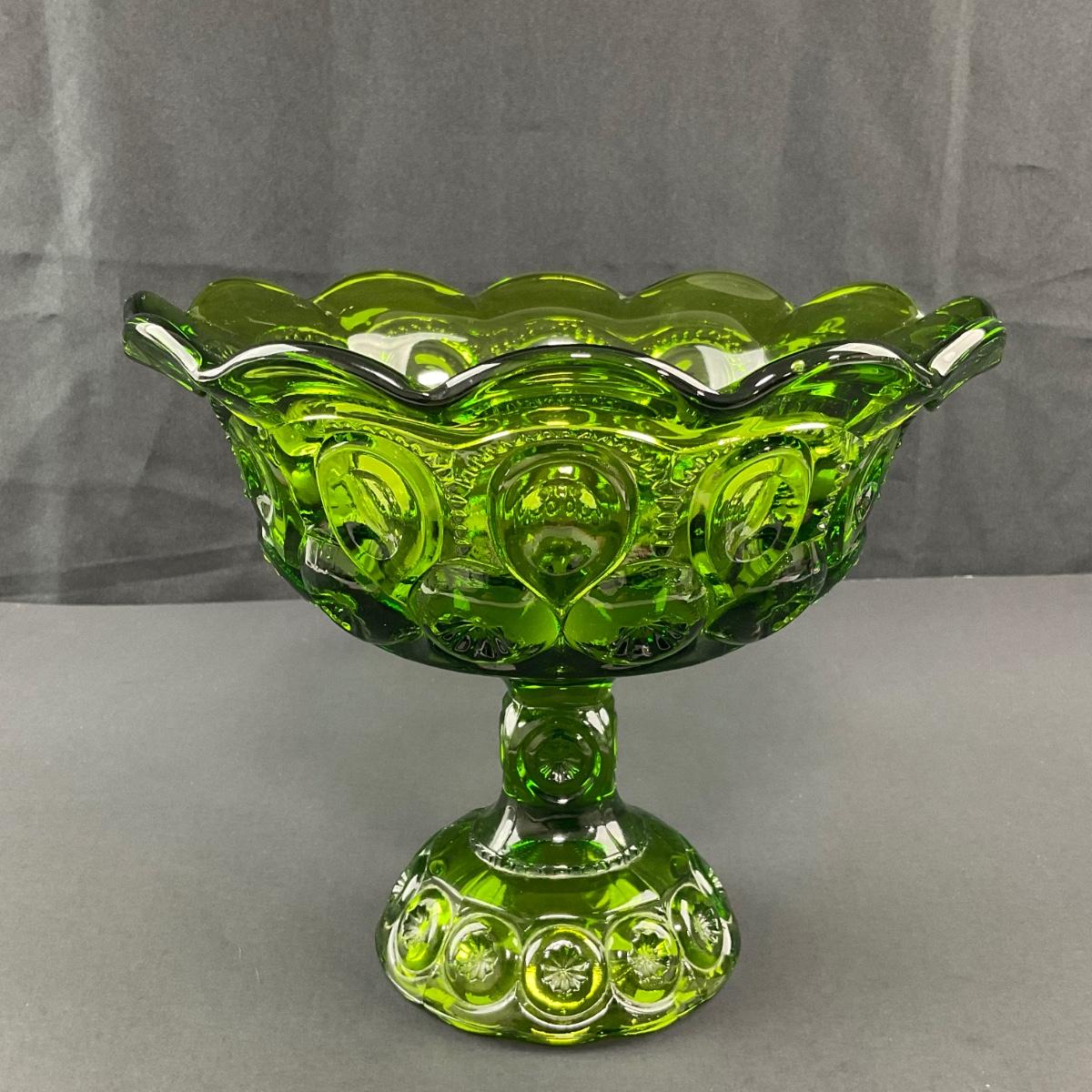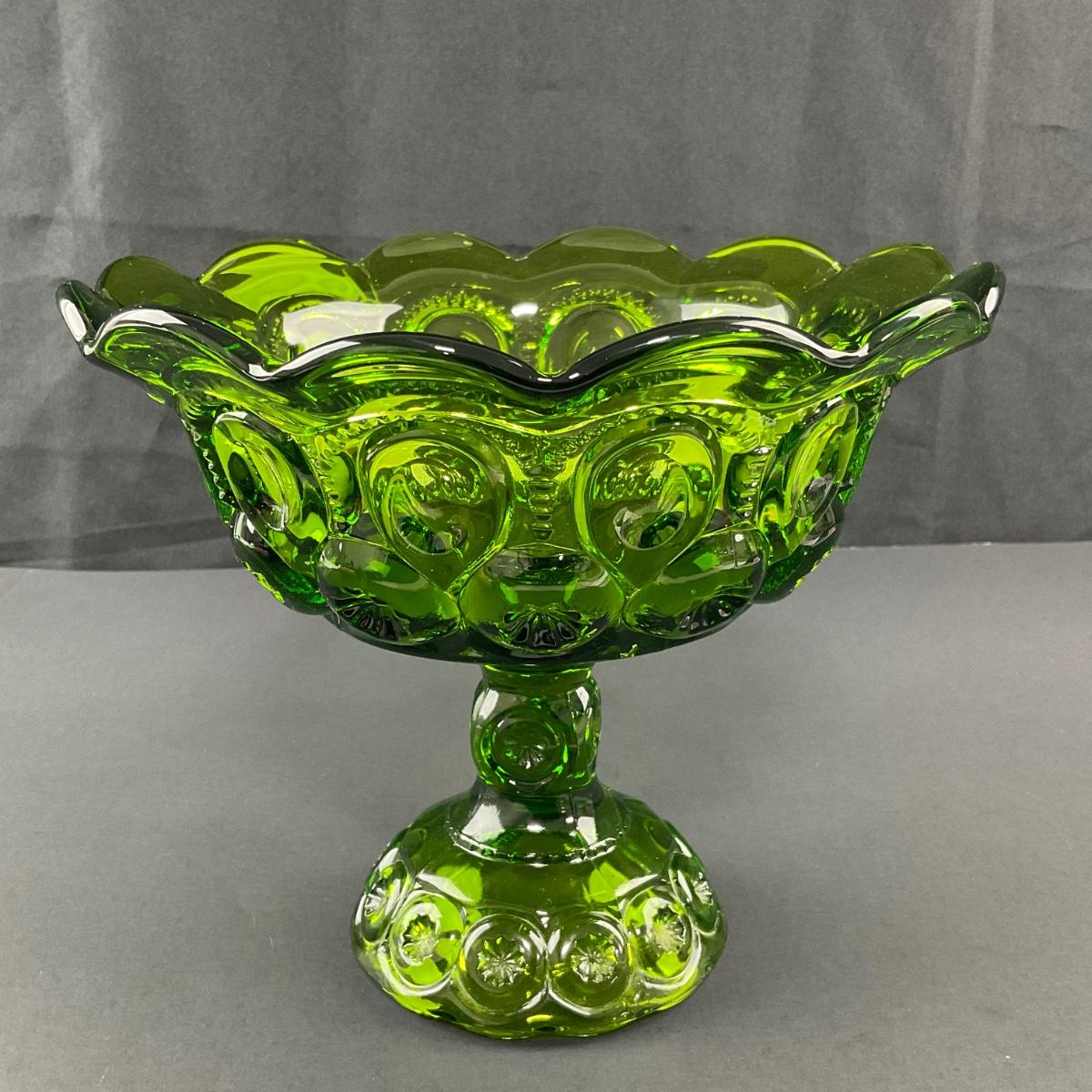 One vintage Green Le Smith Moon & Stars crimped tall compote. This piece has no damage, and appears to be in great shape with no visable chips, cracks, or broken pieces. This is the perfect piece to add to any collection! Please see photos for details and condition. Any condition statement is given as a courtesy to a client, is an opinion, and should not be treated as a statement of fact. Reference to condition written, oral or within a condition report shall not be regarded as a full account of condition and may not include all defects, alterations, or restorations. Absence of a condition report does not imply a lot is flawless or lacking imperfections or damage. Katherine’s Auction & Appraisal Service shall have no responsibility for any error or omission. Returns shall not be accepted on the basis of condition. ::: Shipping is available on this lot. If you require shipping you must let us know at the close of the auction. We will coordinate with you after the item has been won. Shipping fees will include insurance up to or exceeding the value of all items being mailed. If you have any questions regarding this lot please contact the auctioneer either via this website, by direct email or by phone. PICK UP TIMES and other important information can be found in the TERMS and DESCRIPTION of the auction. Please take a look for pertinent information. Thanks!