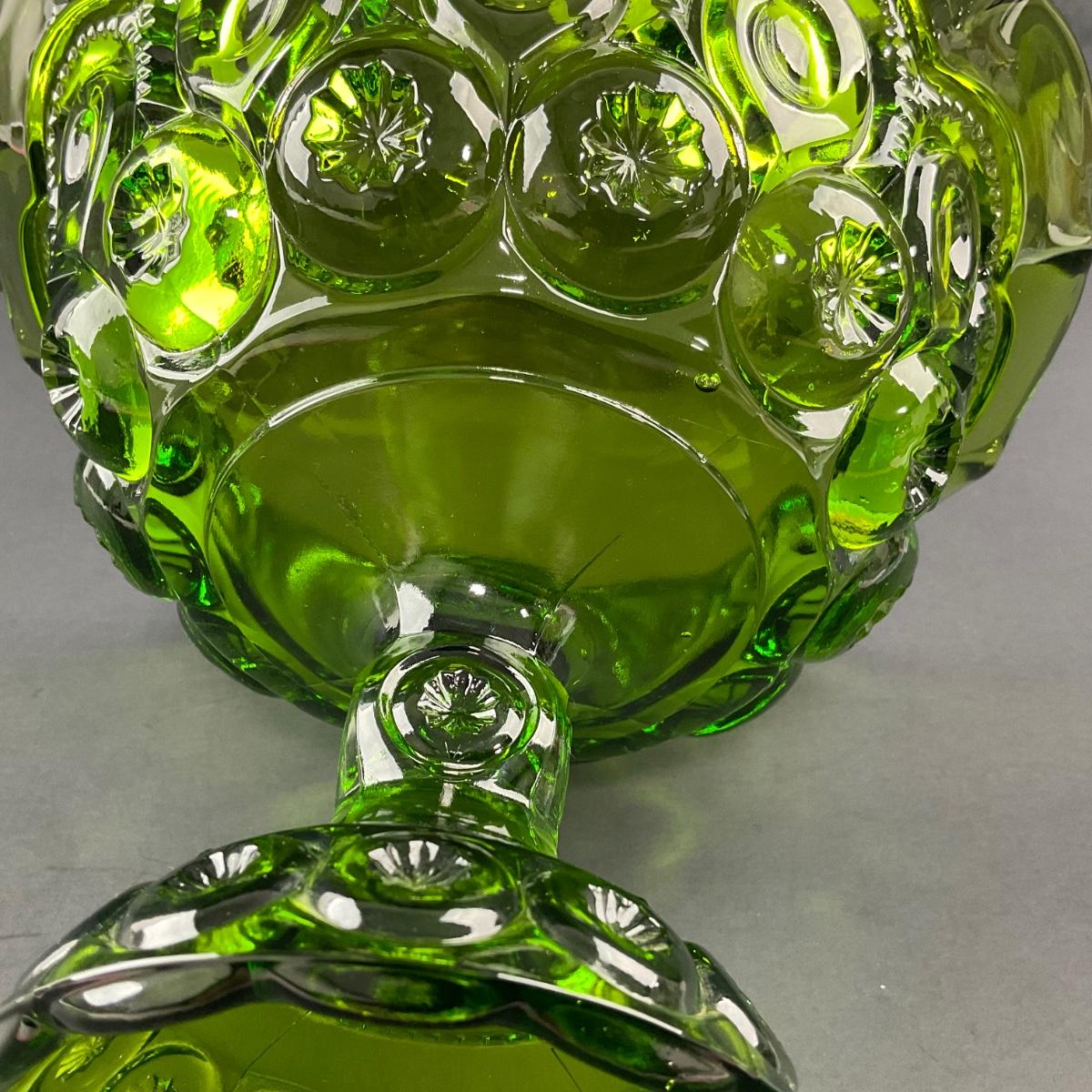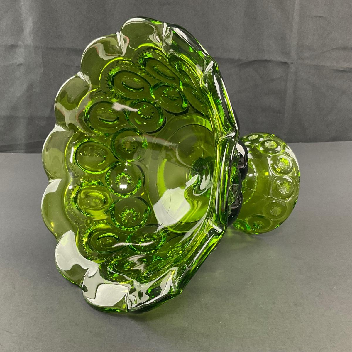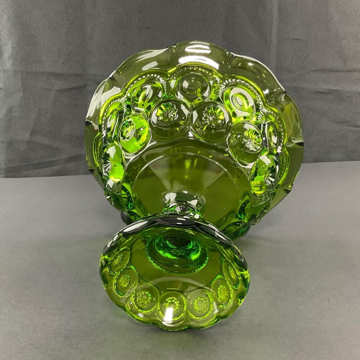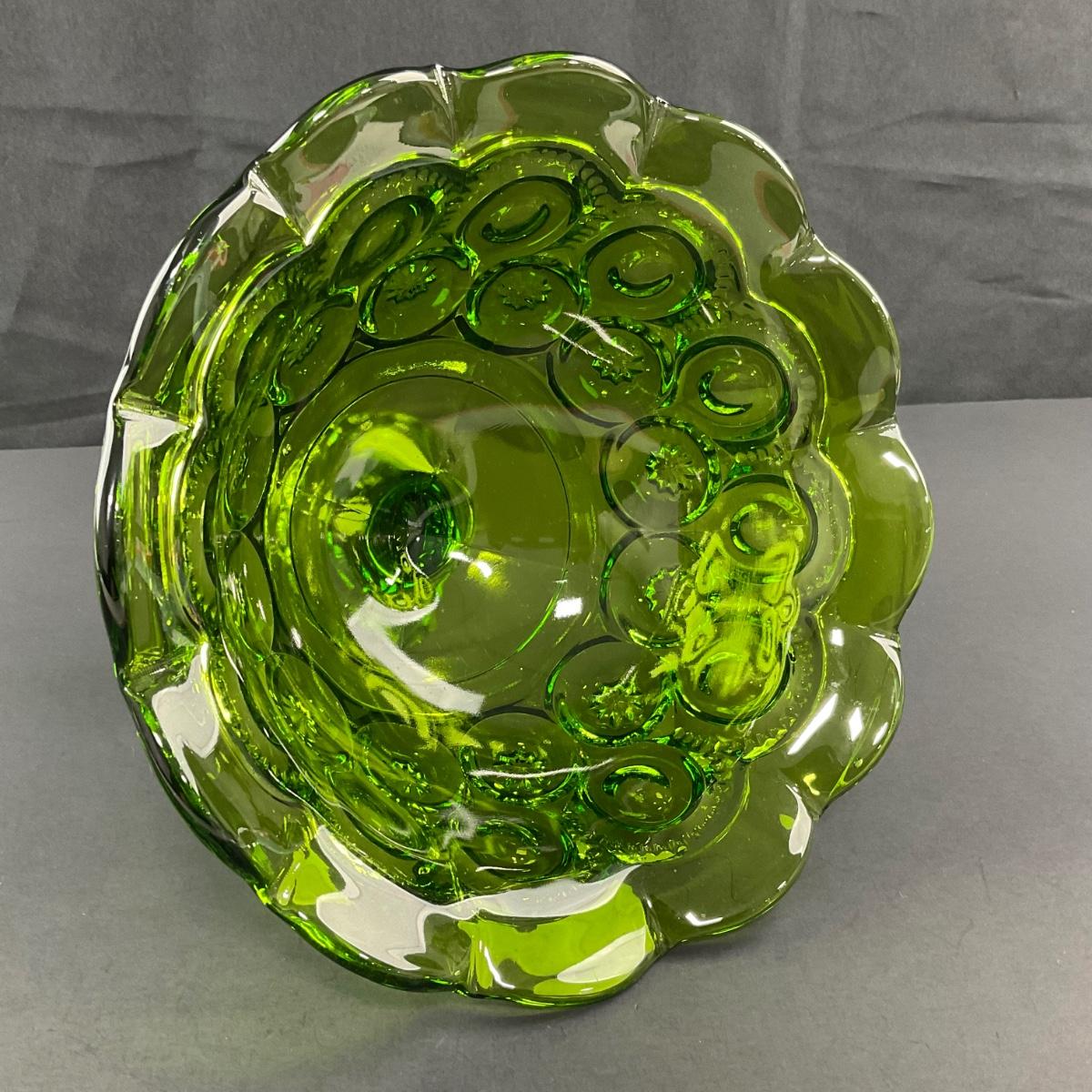 One vintage Green Le Smith Moon & Stars crimped tall compote. This piece has no damage, and appears to be in great shape with no visable chips, cracks, or broken pieces. This is the perfect piece to add to any collection! Please see photos for details and condition. Any condition statement is given as a courtesy to a client, is an opinion, and should not be treated as a statement of fact. Reference to condition written, oral or within a condition report shall not be regarded as a full account of condition and may not include all defects, alterations, or restorations. Absence of a condition report does not imply a lot is flawless or lacking imperfections or damage. Katherine’s Auction & Appraisal Service shall have no responsibility for any error or omission. Returns shall not be accepted on the basis of condition. ::: Shipping is available on this lot. If you require shipping you must let us know at the close of the auction. We will coordinate with you after the item has been won. Shipping fees will include insurance up to or exceeding the value of all items being mailed. If you have any questions regarding this lot please contact the auctioneer either via this website, by direct email or by phone. PICK UP TIMES and other important information can be found in the TERMS and DESCRIPTION of the auction. Please take a look for pertinent information. Thanks!
