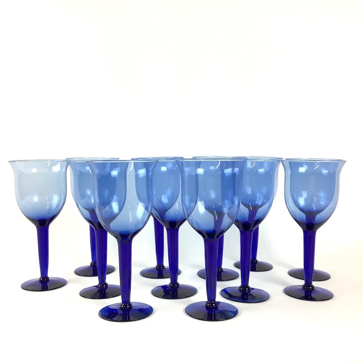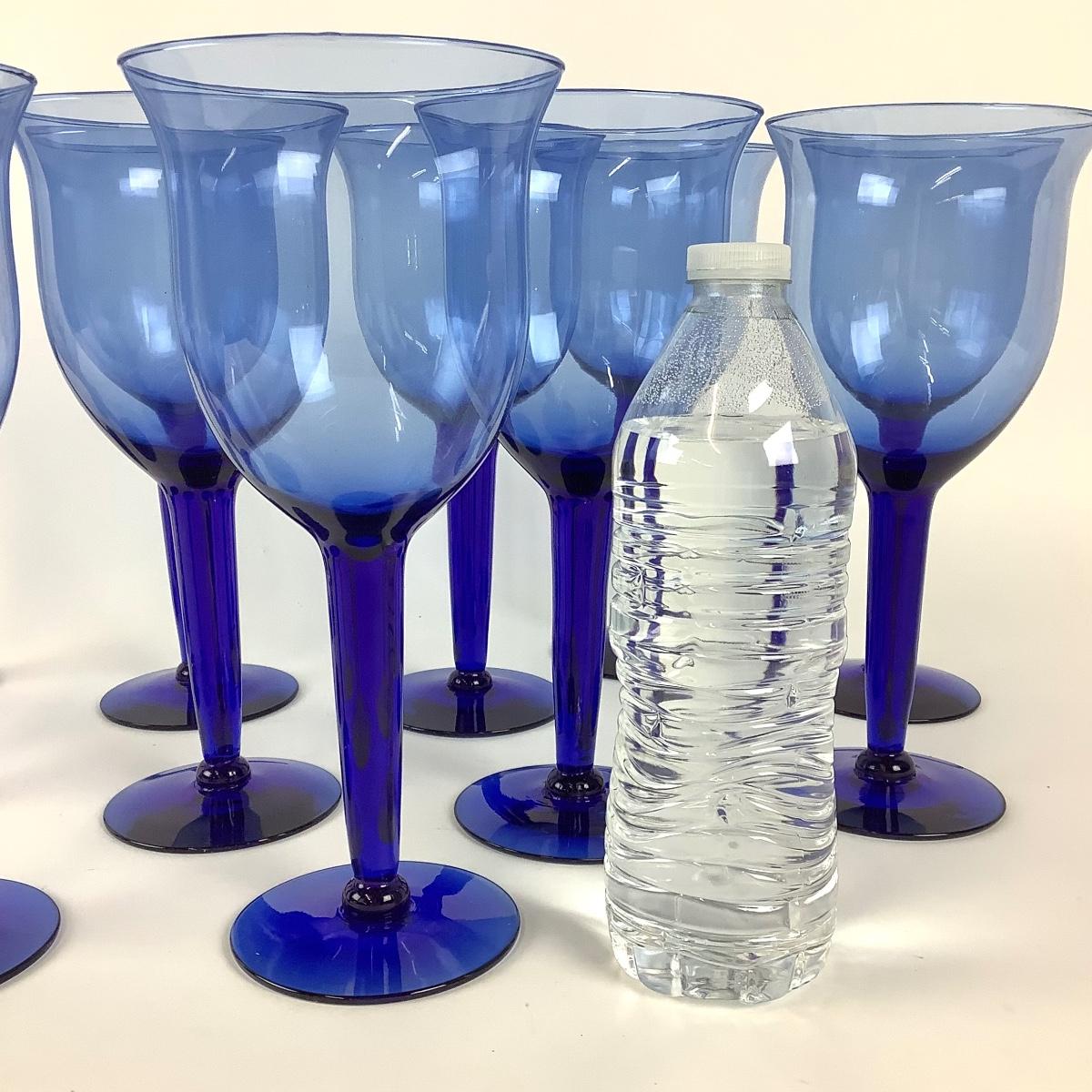Set of twelve blue glass wine stemware goblets, 10"H, 4.5" Diameter.