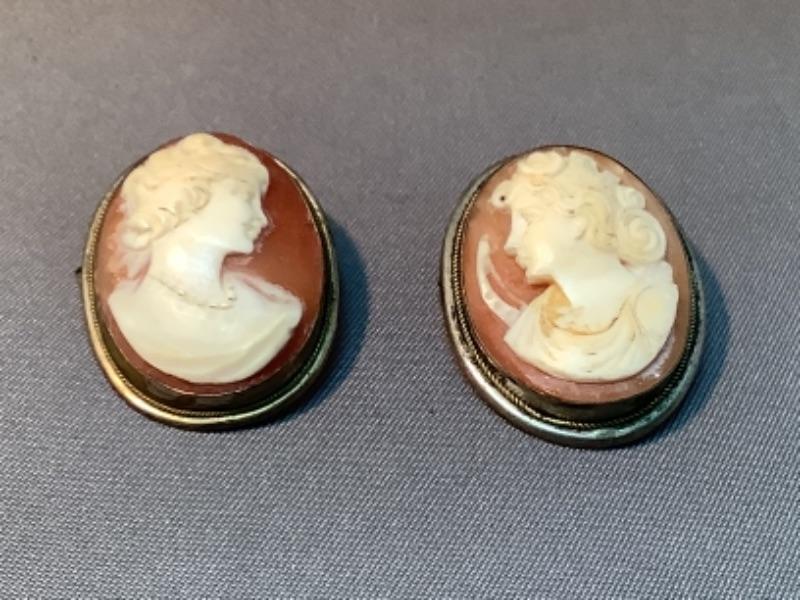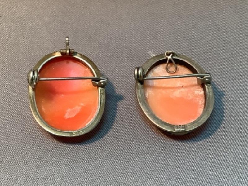 Two cameo pieces of jewelry that can be worn as brooches or as pendants on a necklace. Both are marked 800