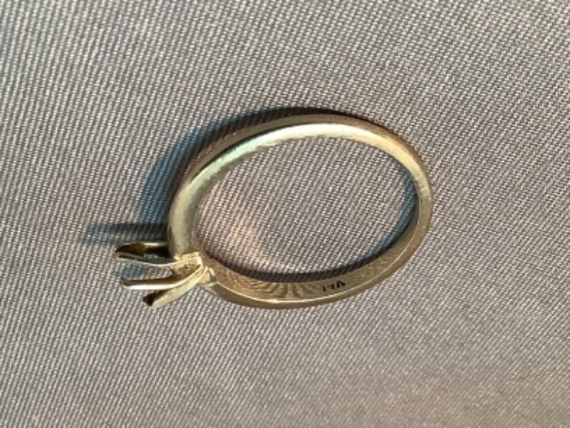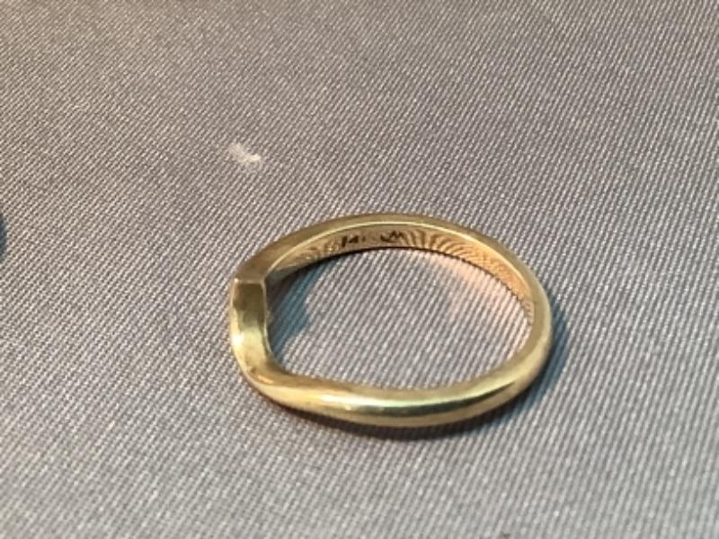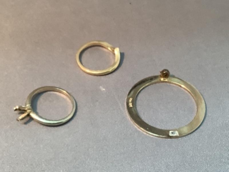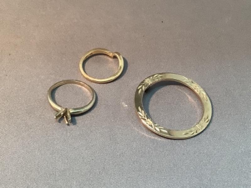 12 karat yellow gold brooch, broken. Two 14 karat yellow gold wedding bands, 1 is missing its stone. Total weight of this lot is 7.3 grams