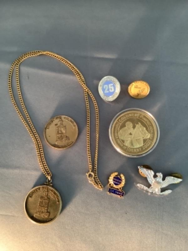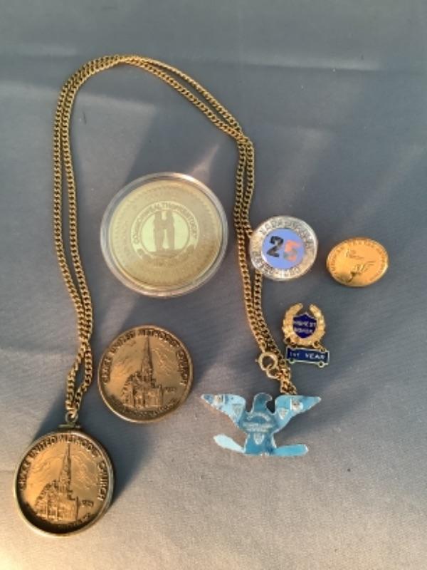 United States Marine Corps eagle pin, Grace United Methodist Church/Citizen Fire Co. No.3 medallions- 1 is on a chain, 1 is not, Commonwealth of Kentucky 2002 Kentucky Derby coin/medal