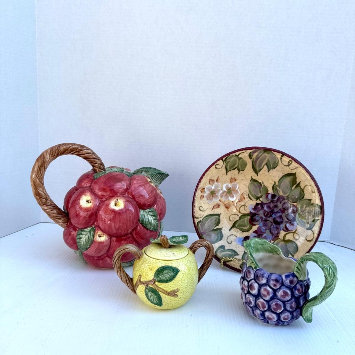 253 Fitz & Floyd Fruit Pitcher, Cream & Sugar with Pottery Plate