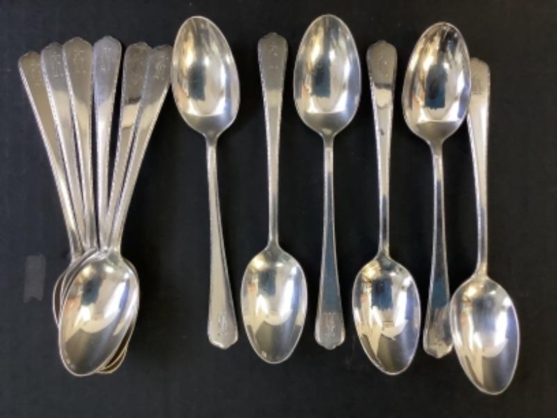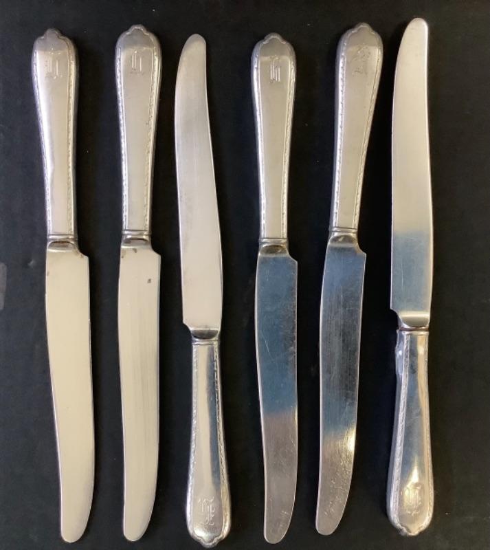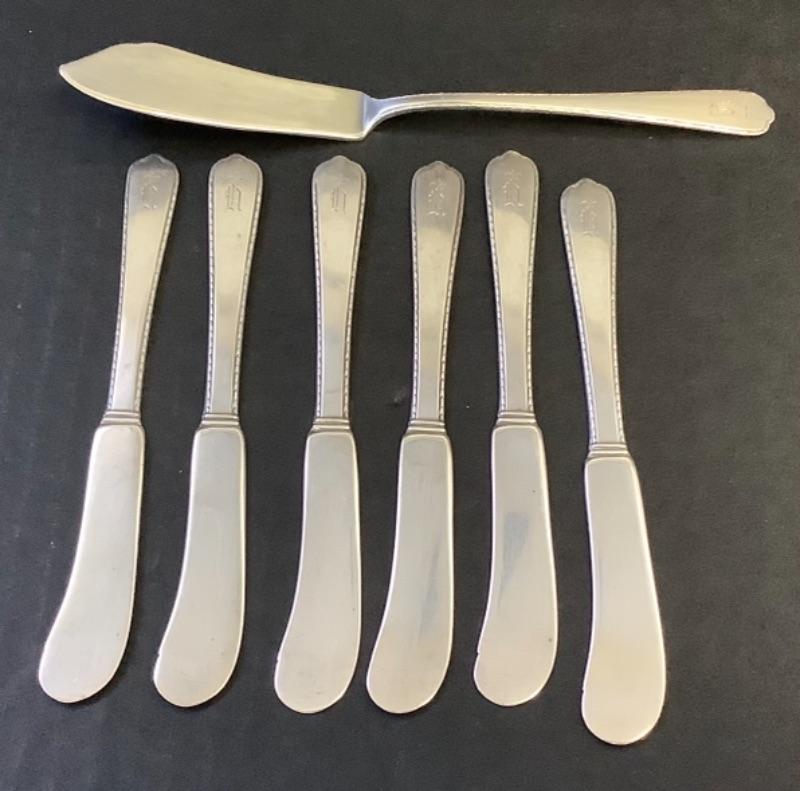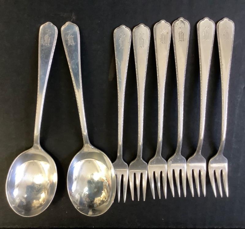 45 pieces of sterling silver flatware monogrammed with the letter H, set includes 6 knives, 7 spreader knives, 6 cocktail forks, 2 soup spoons, 12 spoons, 6 salad forks and 6 dinner forks,
