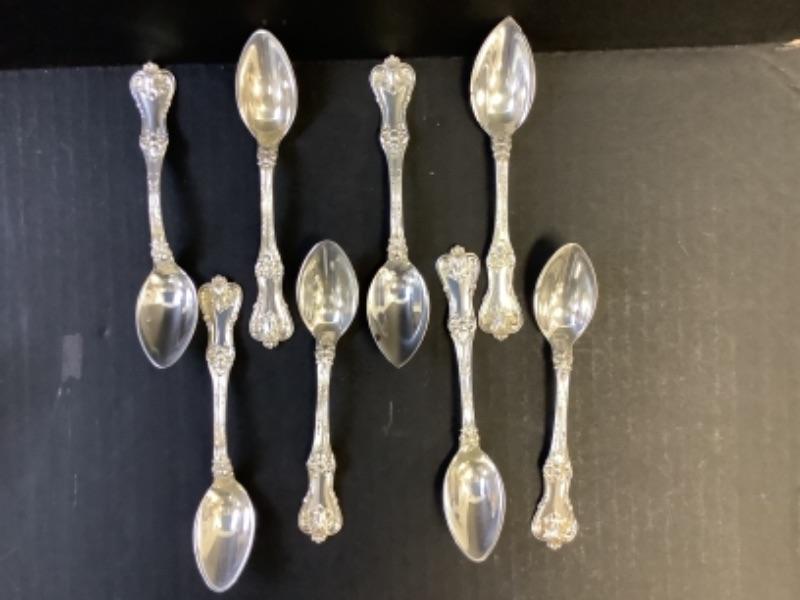 Set of 8 sterling silver dessert spoons, weighing 234.8 grams
