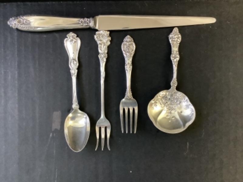 Assortment of floral pattern sterling silver , Knife, Sugar spoon, Reed & BArton child’s fork and Gorham cocktail fork, weight 96 grams