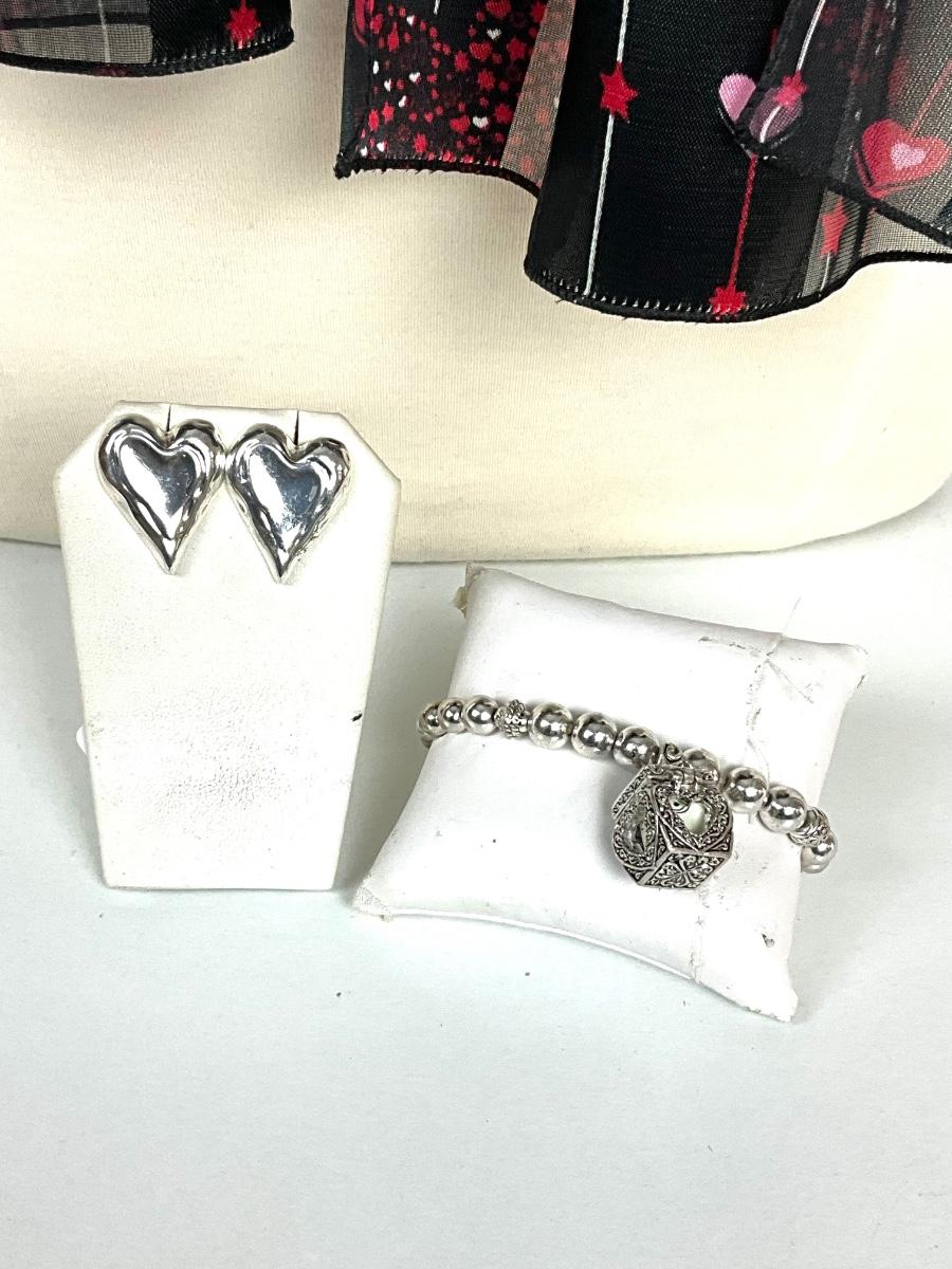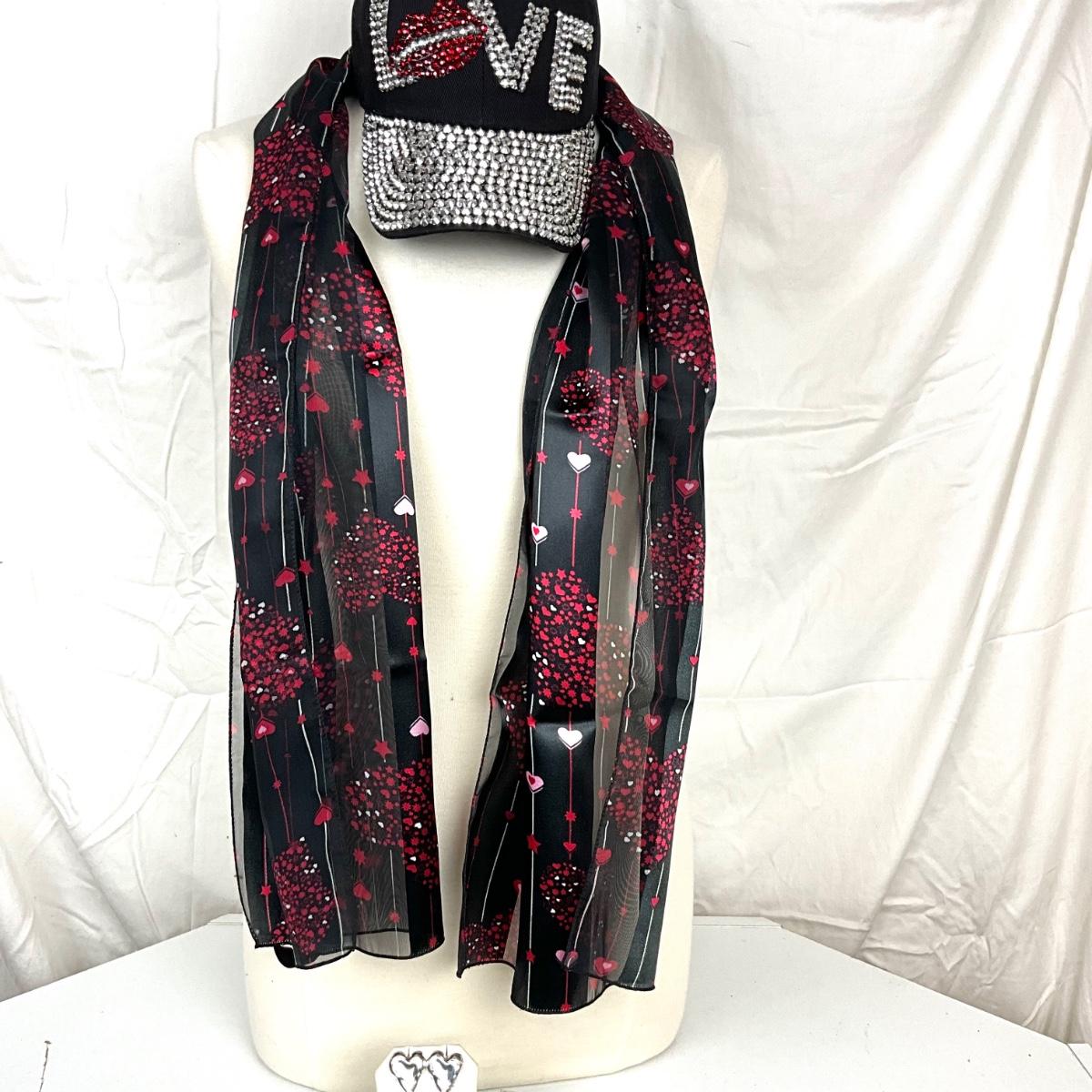 254 LOVE Rhinestone Hat with Black/Red Heart Scarf, Silvertone Heart Earrings, Locket Box Bracelet
