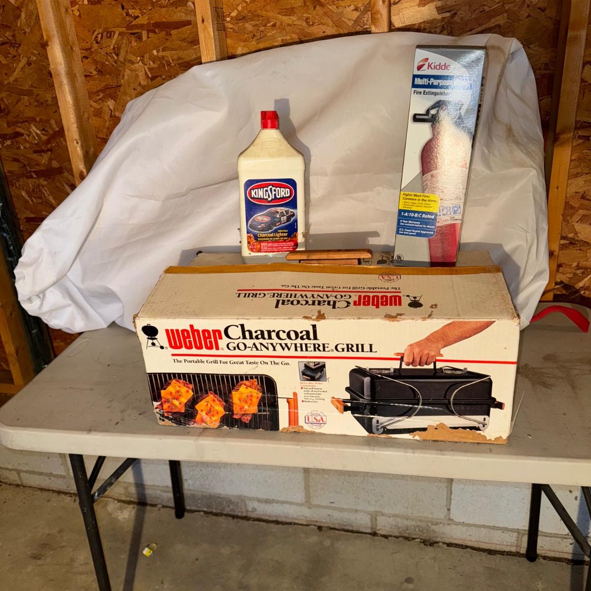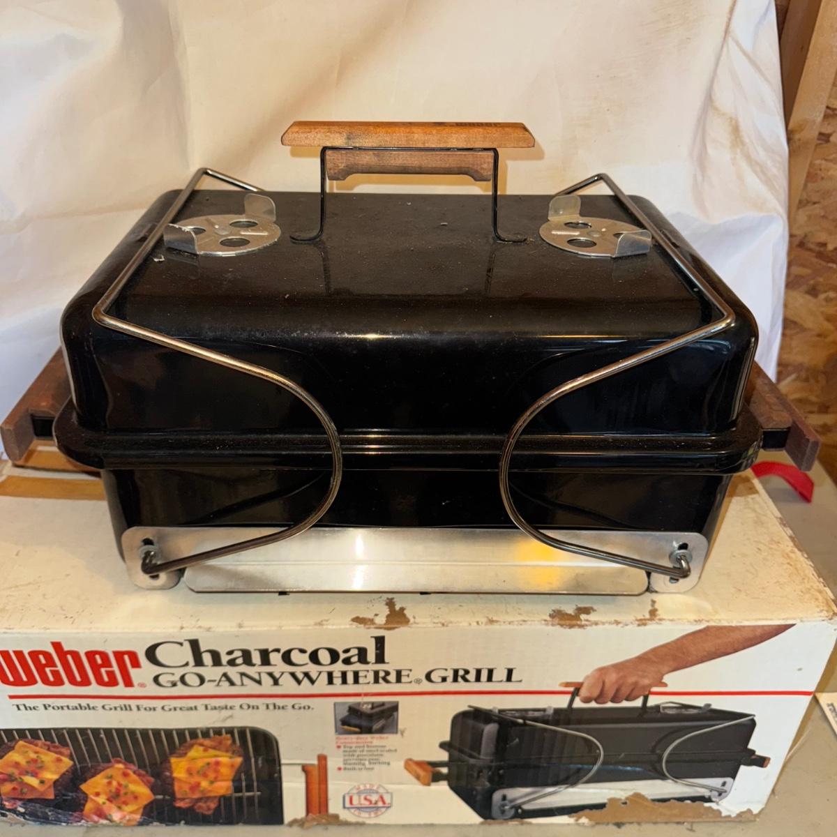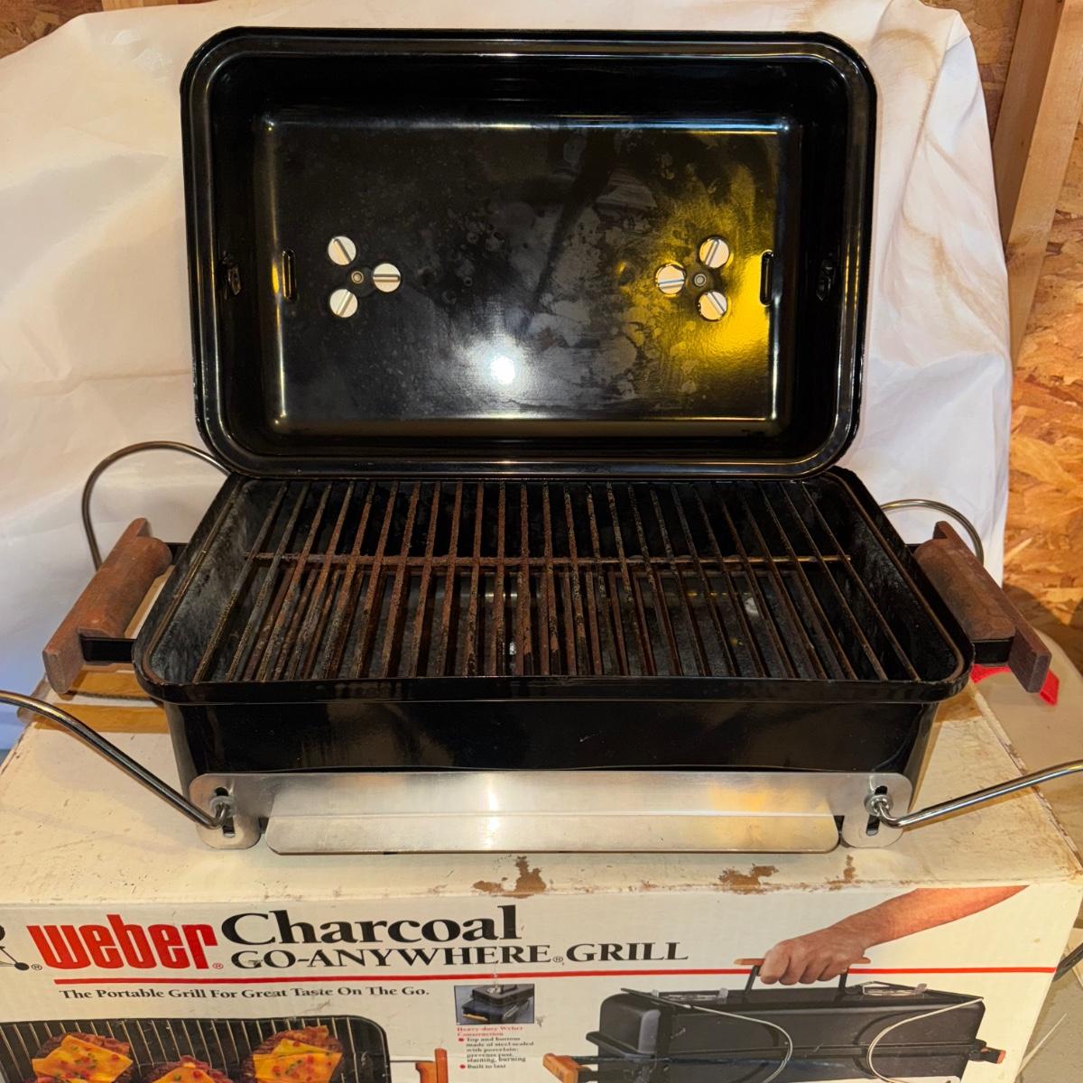 254 Weber “Go Anywhere” Portable Charcoal Grill. Lightly used. Main grilling grate needs to be cleaned a re-seasoned. Comes with charcoal lighter fluid and fire extinguisher. Please see pics for details.