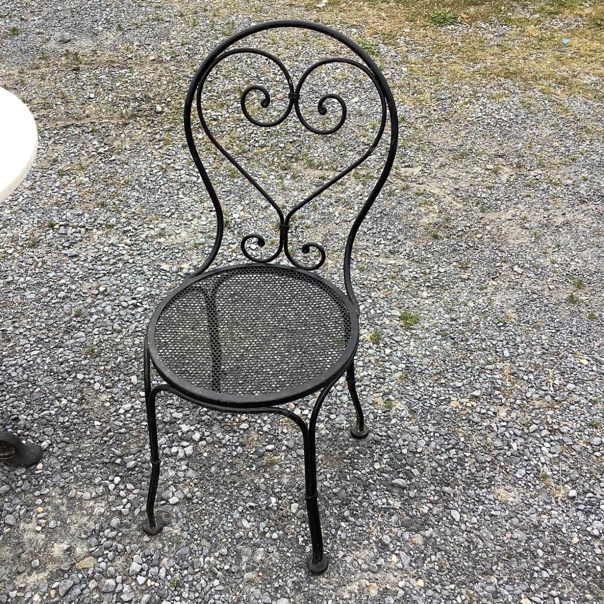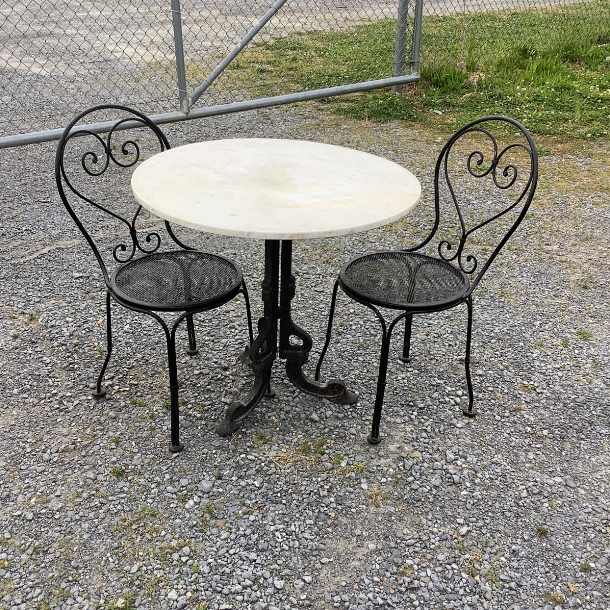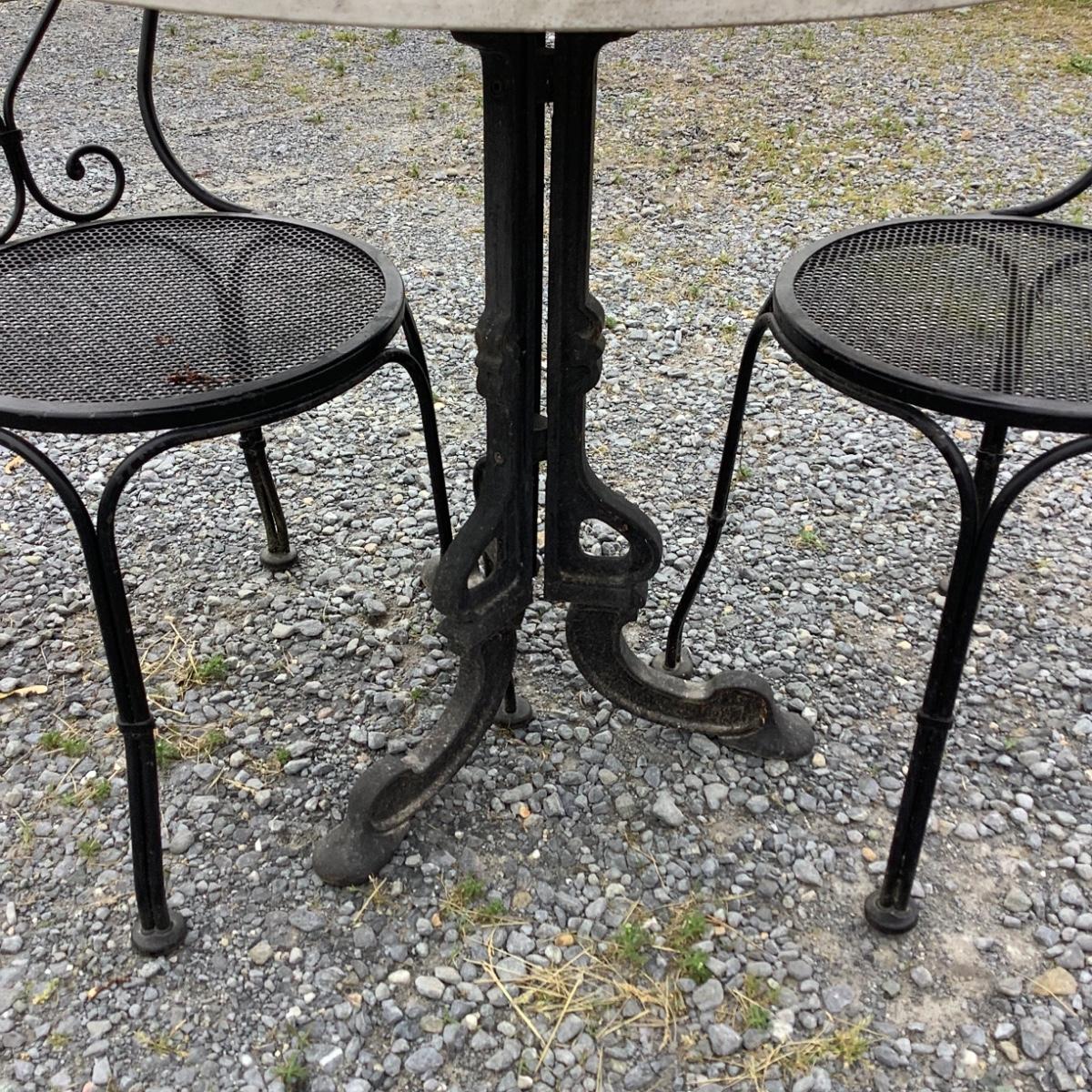 2Wrought Iron Marble-Top Table with (2) Ice Cream Parlor Chairs.
